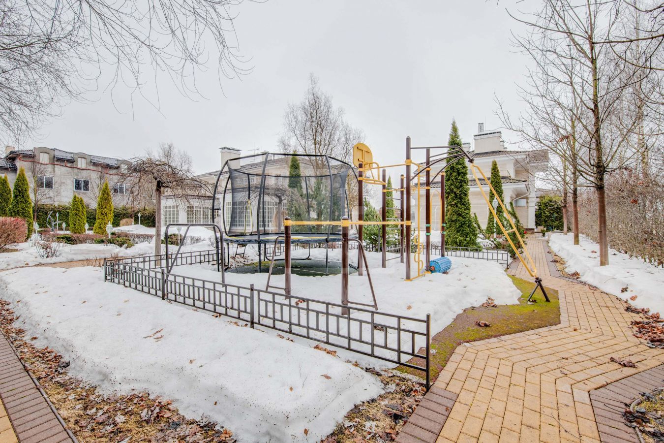 Дорожки выложены брусчаткой. Фонари освещения идеально вписываются в общий дизайн. На участке имеется спортивная площадка с батутом.