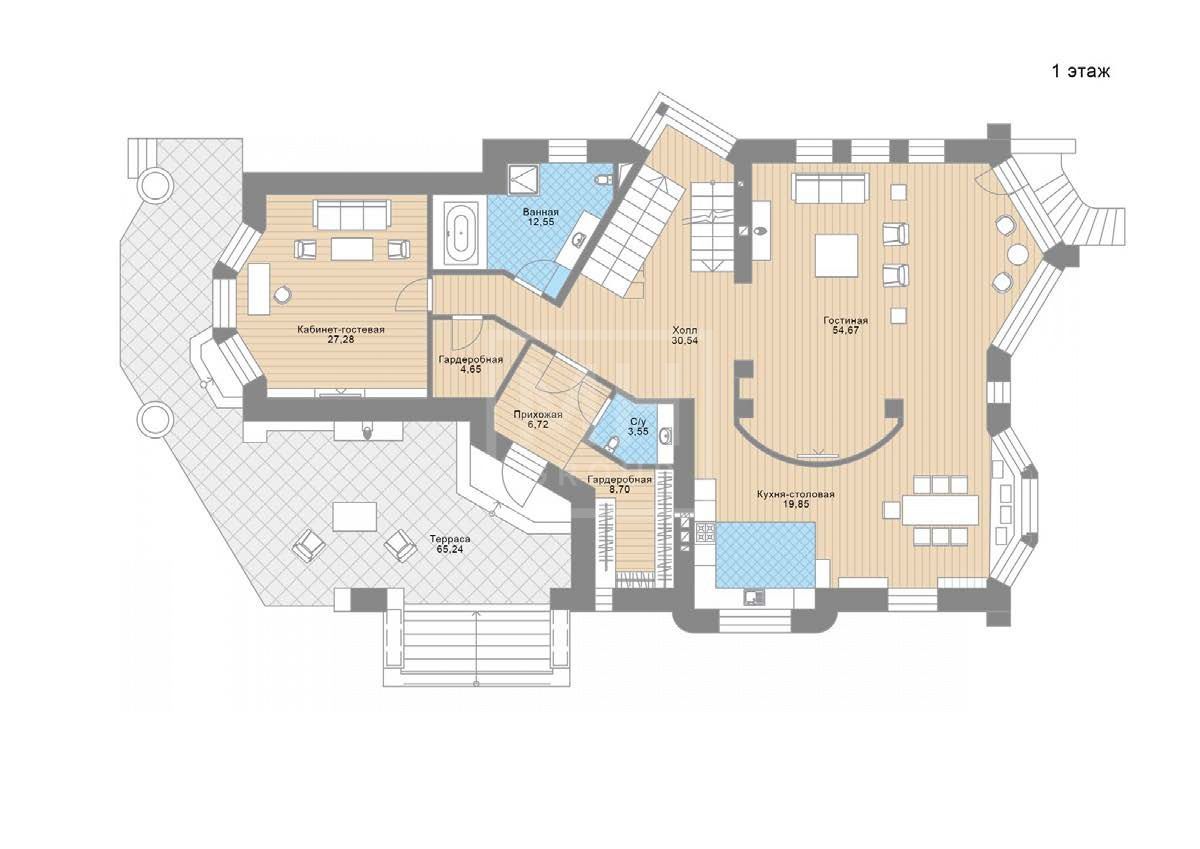 Этаж 1: прихожая, гардеробная, гостиная с камином и выходом на террасу, кухня-столовая, кабинет-гостевая, ванная комната.