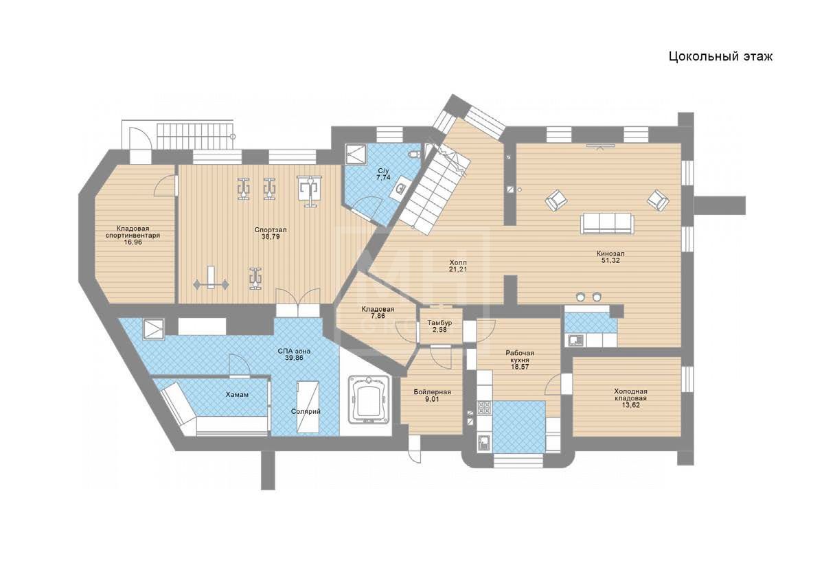 Цоколь: холл, кинозал, SPA-зона с хаммамом, солярием и купелью, спортзал с помещением для хранения спорт. инвентаря, рабочая кухня, холодная кладовая, кладовая, бойлерная.