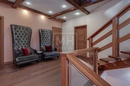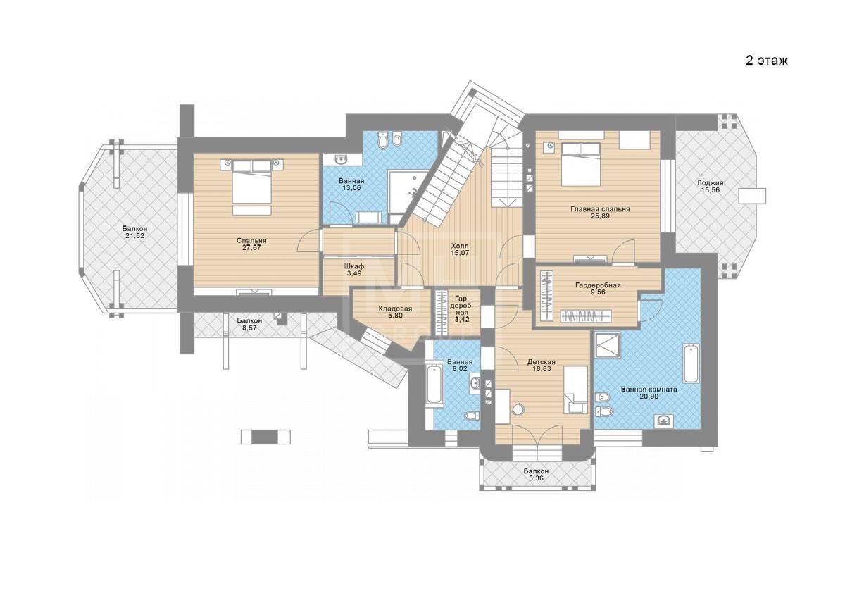 Этаж 2: холл, мастер-спальня с ванной комнатой, гардеробной и лоджией, 2 спальни с гардеробными, с/у и выходами на балконы, кладовая.