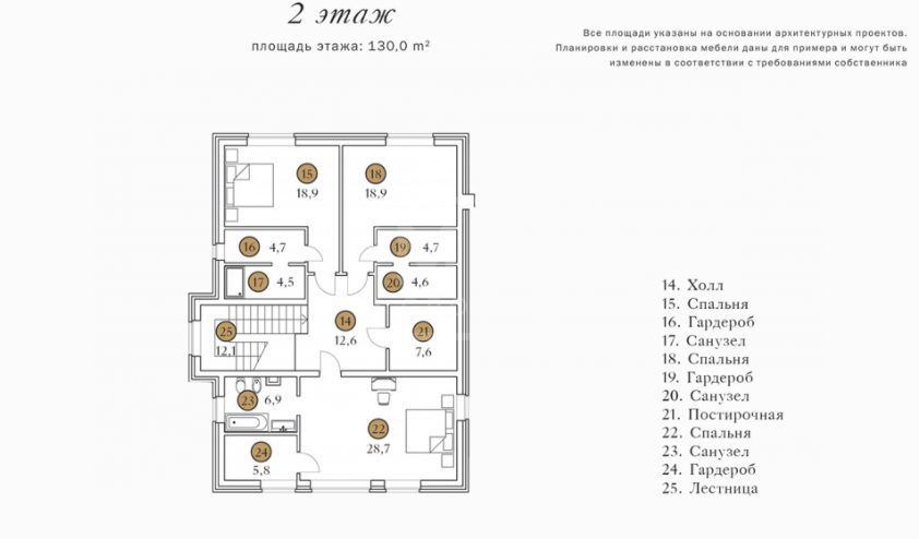 Этаж 2: 3 спальни, 3 гардеробные, постирочная, 3 ванные комнаты.