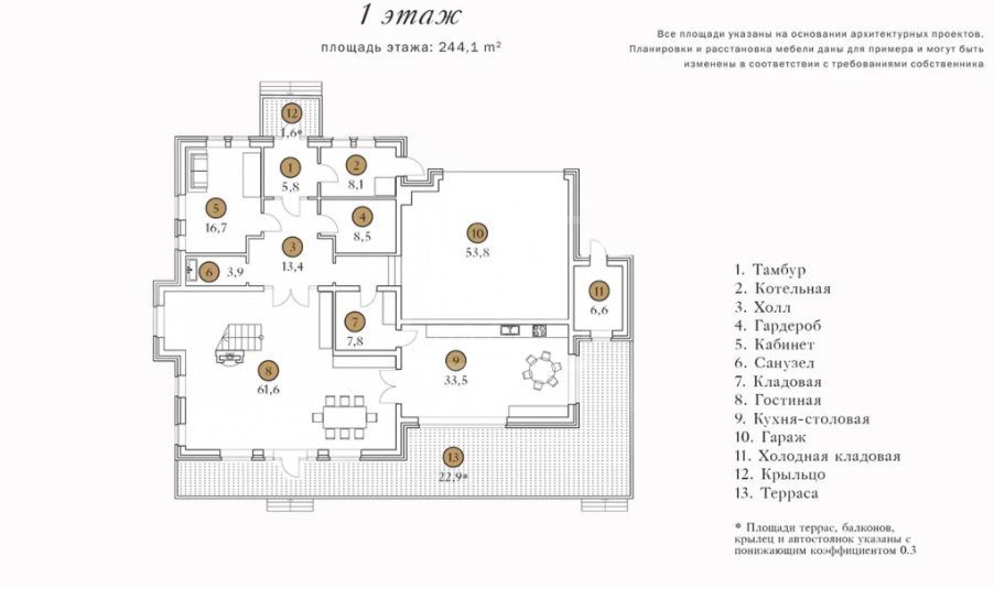 Этаж 1: холл, гардеробная, кухня-столовая, гостиная, терраса, кабинет (гостевая спальня) с ванной комнатой, кладовая, котельная, с/у, гараж на 2 автомашины, холодная кладовая.