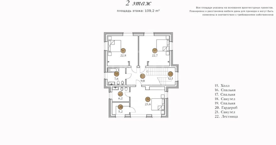 Этаж 2: холл, 3 спальни, гардеробная, 2 ванные комнаты.