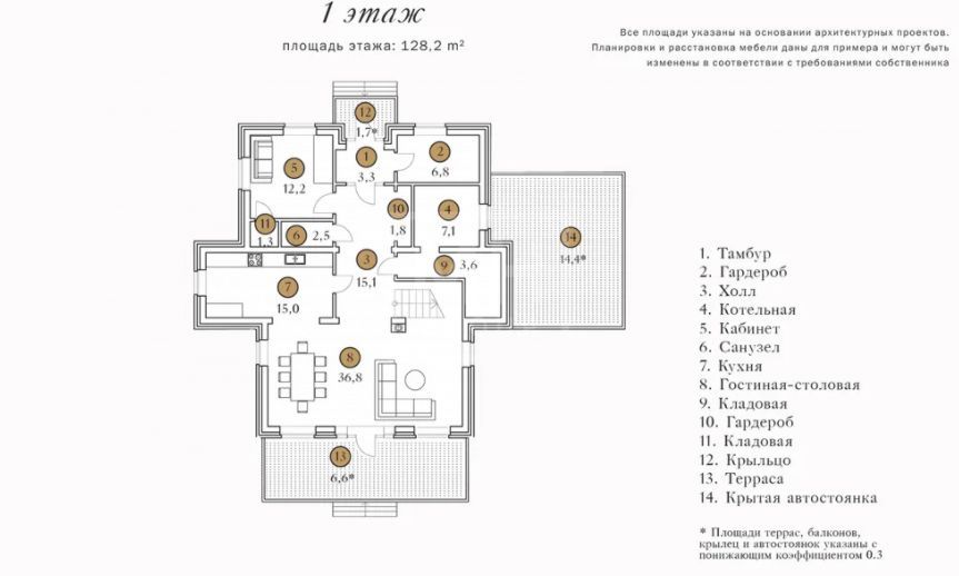 Этаж 1: холл, гардеробная, кухня, столовая-гостиная, кабинет, кладовая, котельная, с/у, навес на 2 м/м.