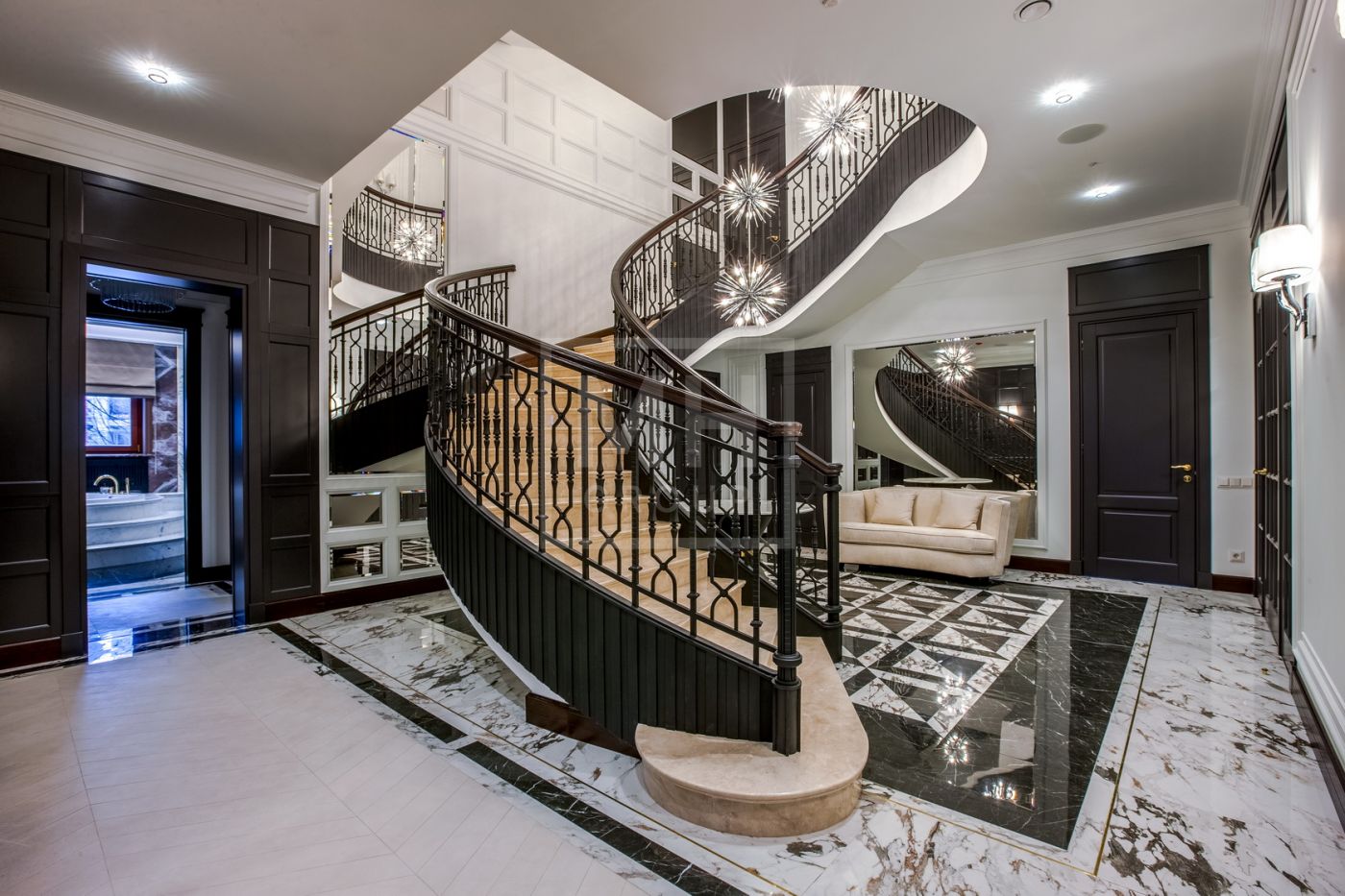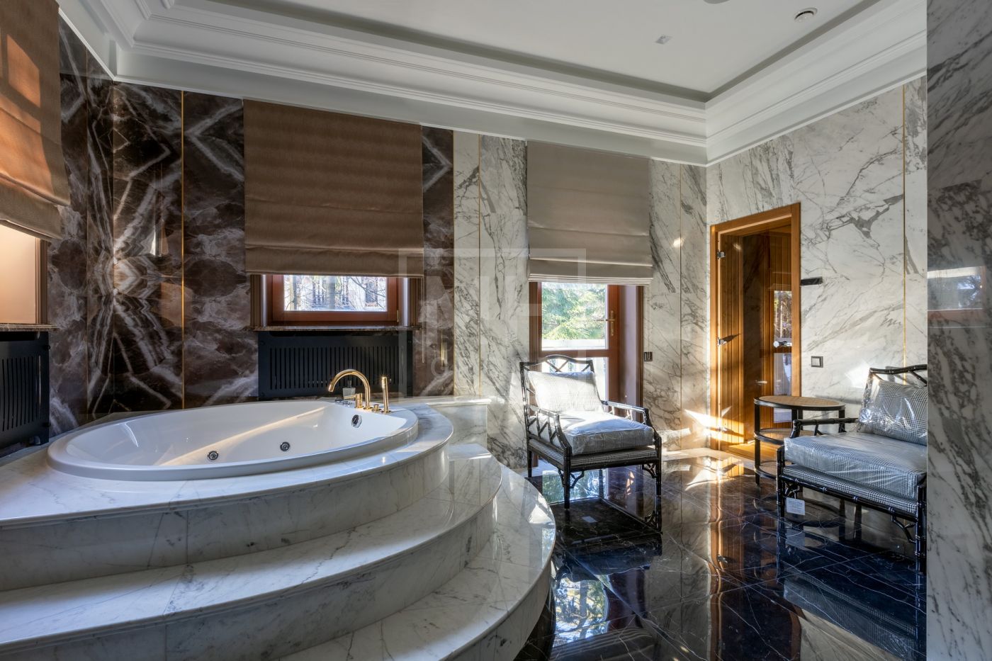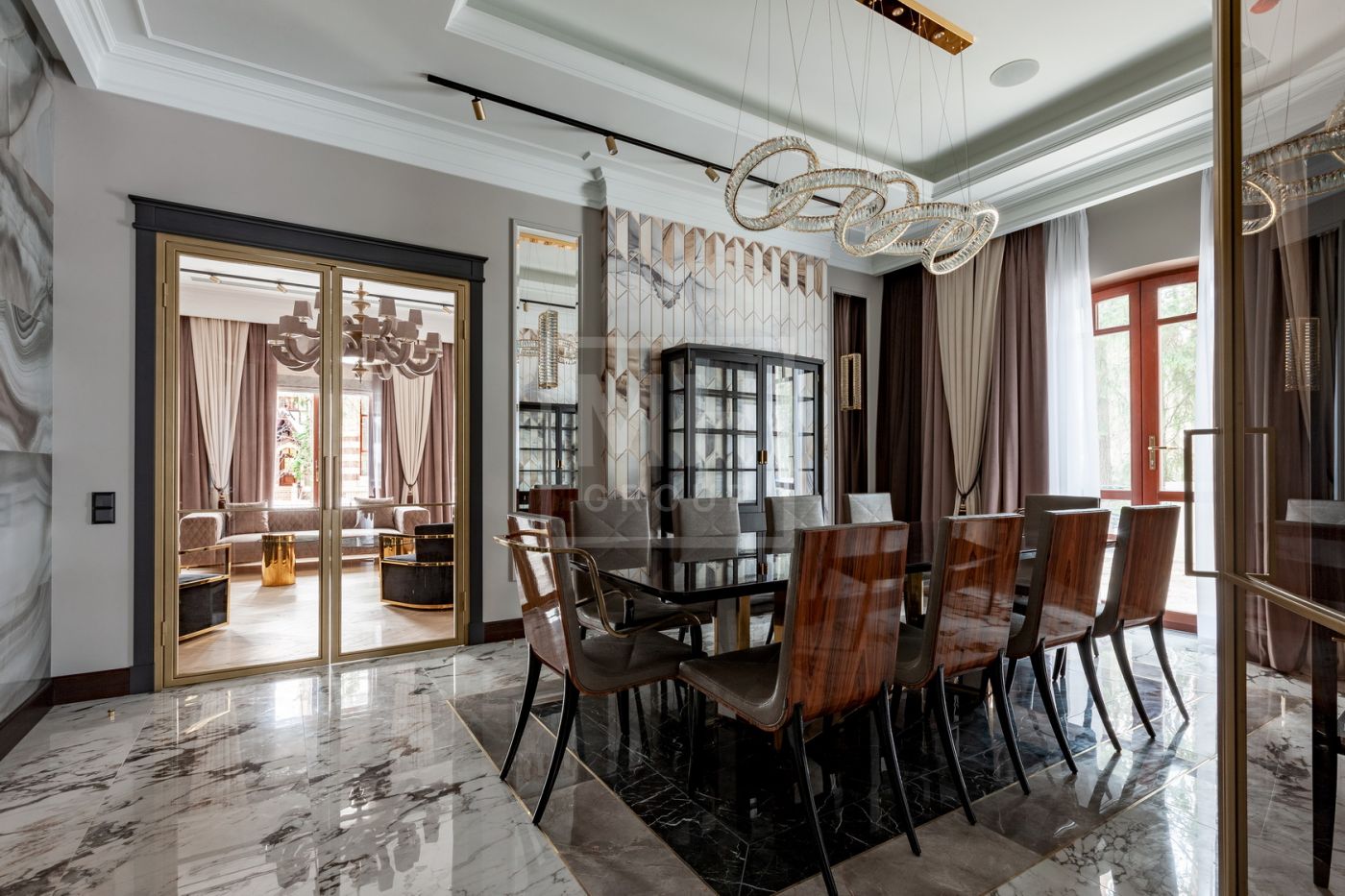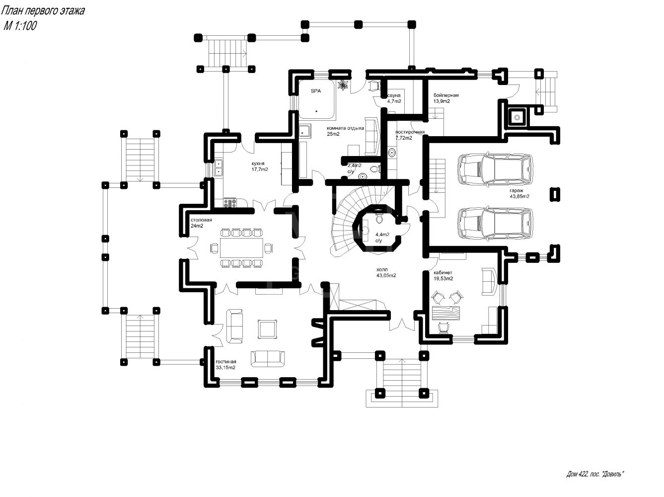 Этаж 1: Холл, кухня, столовая, каминный зал, второй свет, бильярд, кабинет, SPA-студию, котельная в доме. Гараж на два автомобиля.