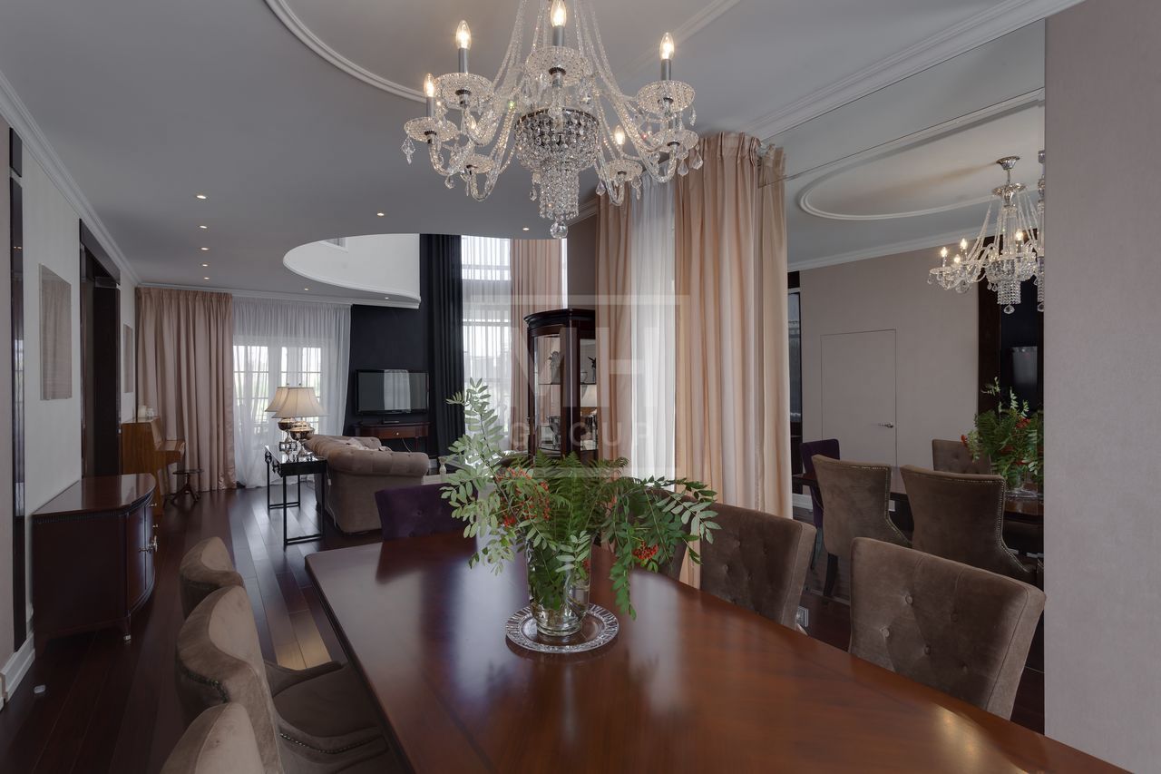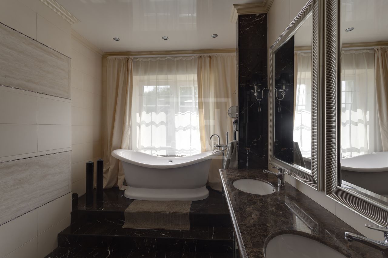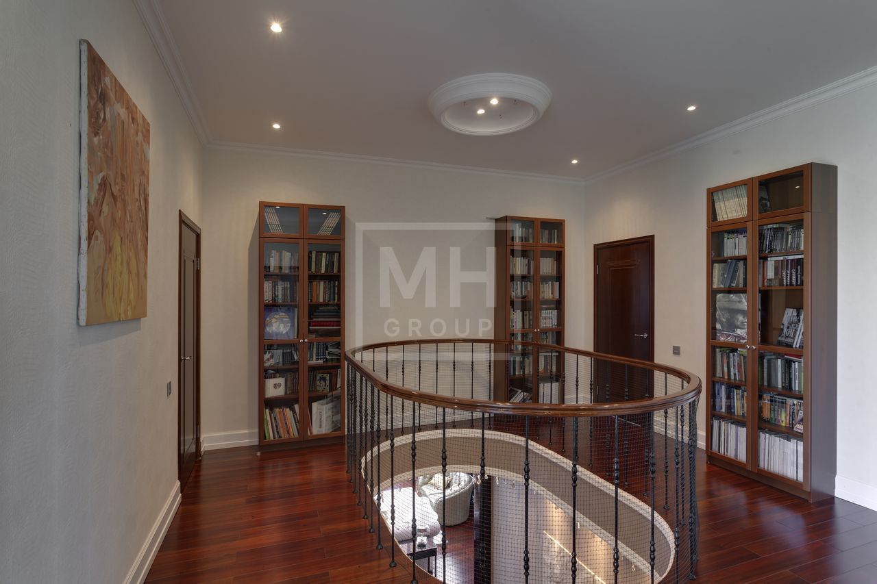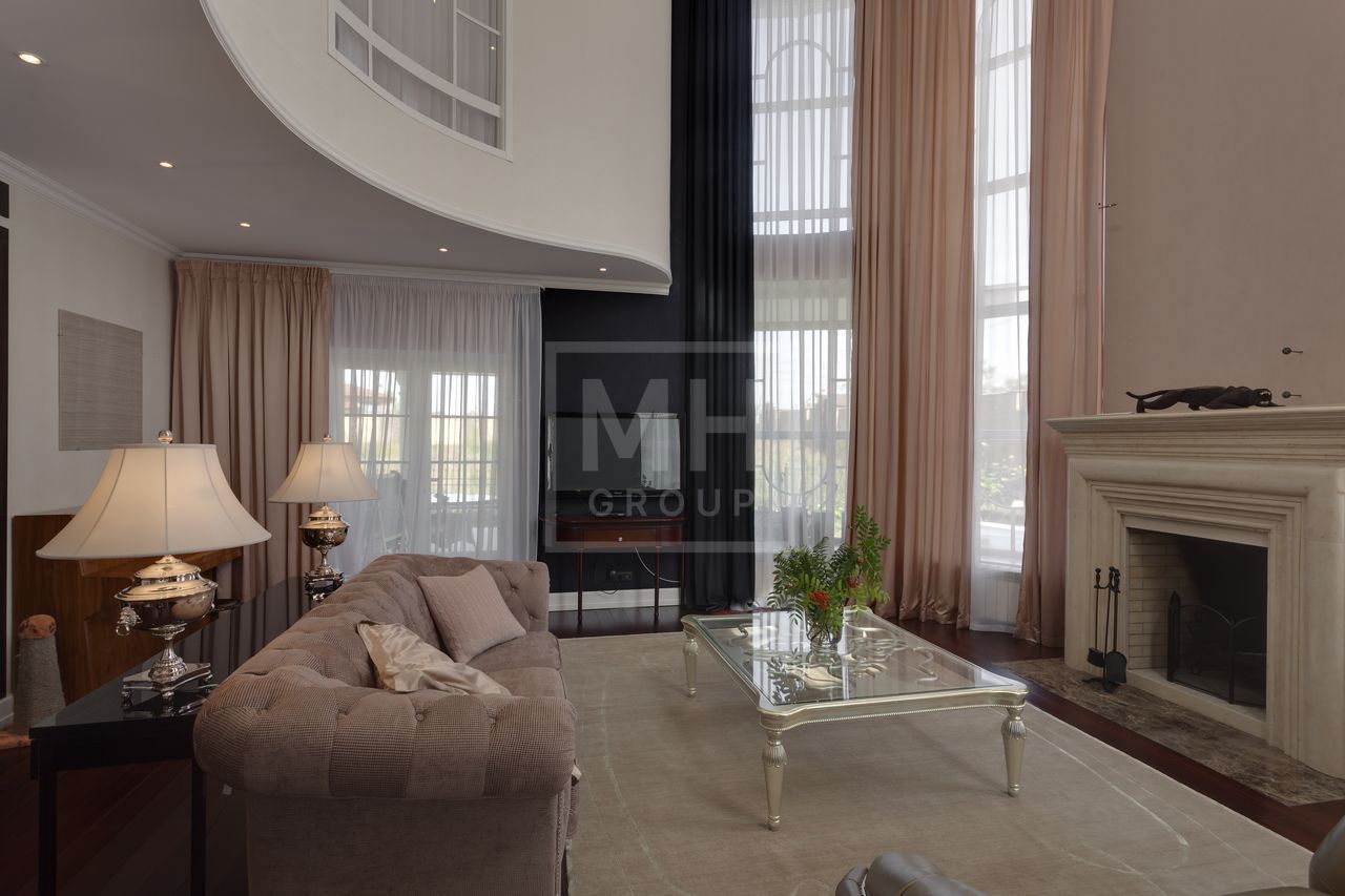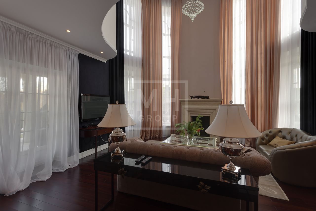 На первом этаже - "общая зона", холл со вторым светом, гостиная со вторым светом и огромным действующим камином, отделанным мрамором, столовая, кухня, сауна, кабинет, санузел, гардеробная, а также, внешняя терраса.