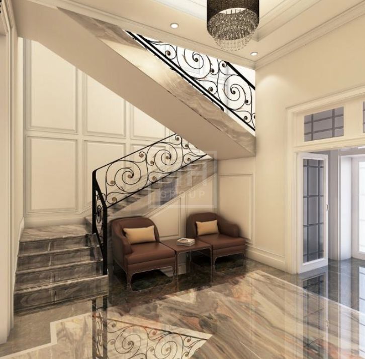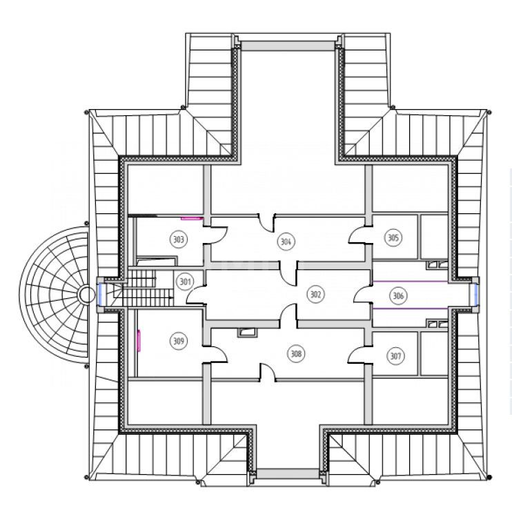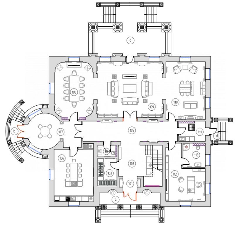 Этаж 1: прихожая, с/у, гардеробная, кухня , столовая, гостиная со вторым светом, комната для завтраков, каминный зал,кабинет, с/у.