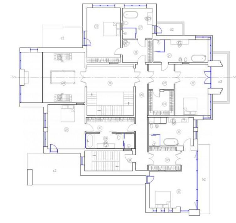 Этаж 2: 4 спальни со своими гардеробными, ванными комнатами и балконами, игровая комната
