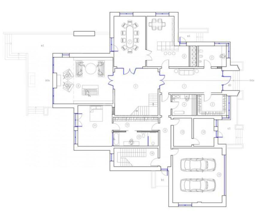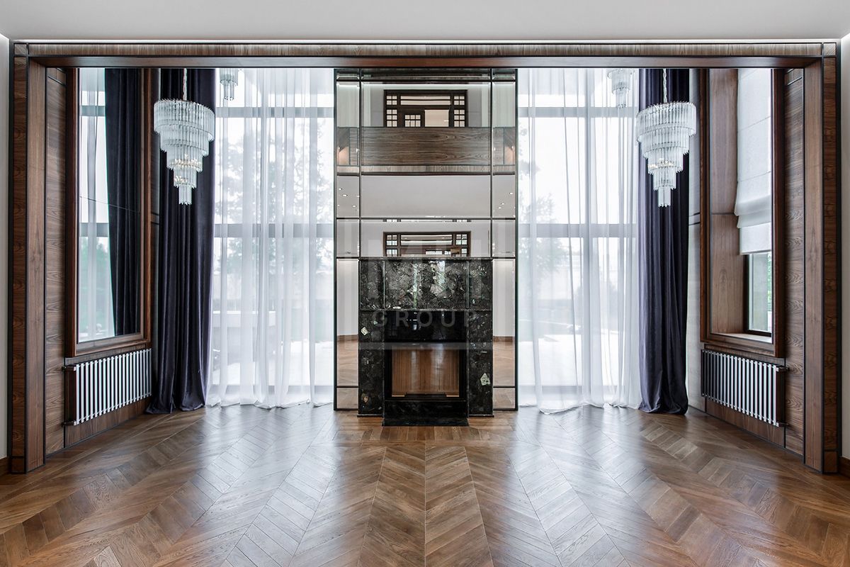 Этаж 1: прихожая, гардеробная, с/у,холл, кухня-столовая, гостиная со вторым светом, выход на террасу с уличным камином,спальня с гардеробной и ванной комнатой, постирочная, котельная, серверная, гараж на 2 м/м