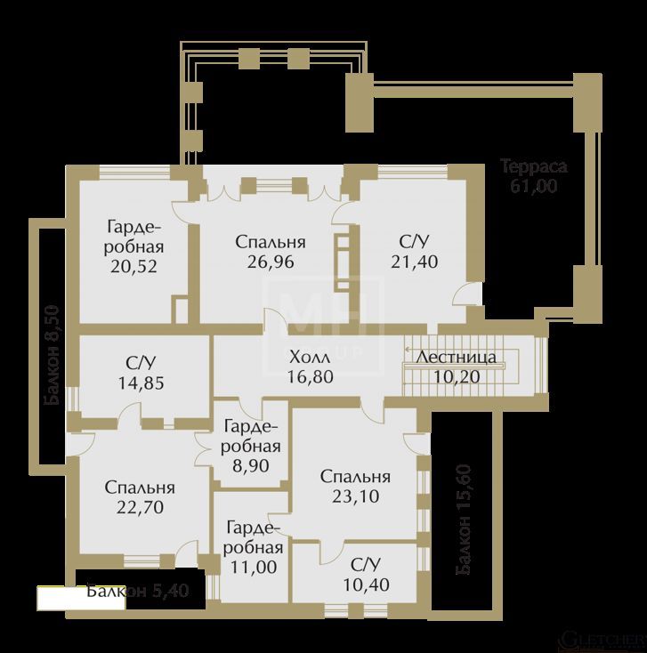 Тип дома проект Е. Современная стилистика. Облицовка фасадных поверхностей плиткой из декоративного бетона с карнизами из полированного гранита,горизонтальные поверхности балконов и террас облицованы гранитными плитами с термообработкой,