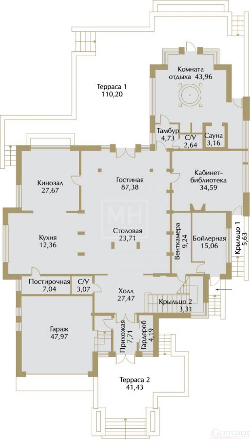Этаж 1: Холл гардеробная, лестничный холл, с/у, комната свободного назначения, постирочная с выходом на улицу, гостиная с камином, кухня, столовая, кабинет, сьют : спальня, зона отдыха с выходом на террасу, гардеробная, ванная комната.