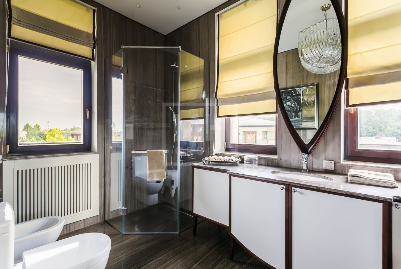 Этаж 1: прихожая, кухня, столовая, гостиная, гостевой санузел, спальня с санузлом и гардеробной, кабинет с санузлом и гардеробной