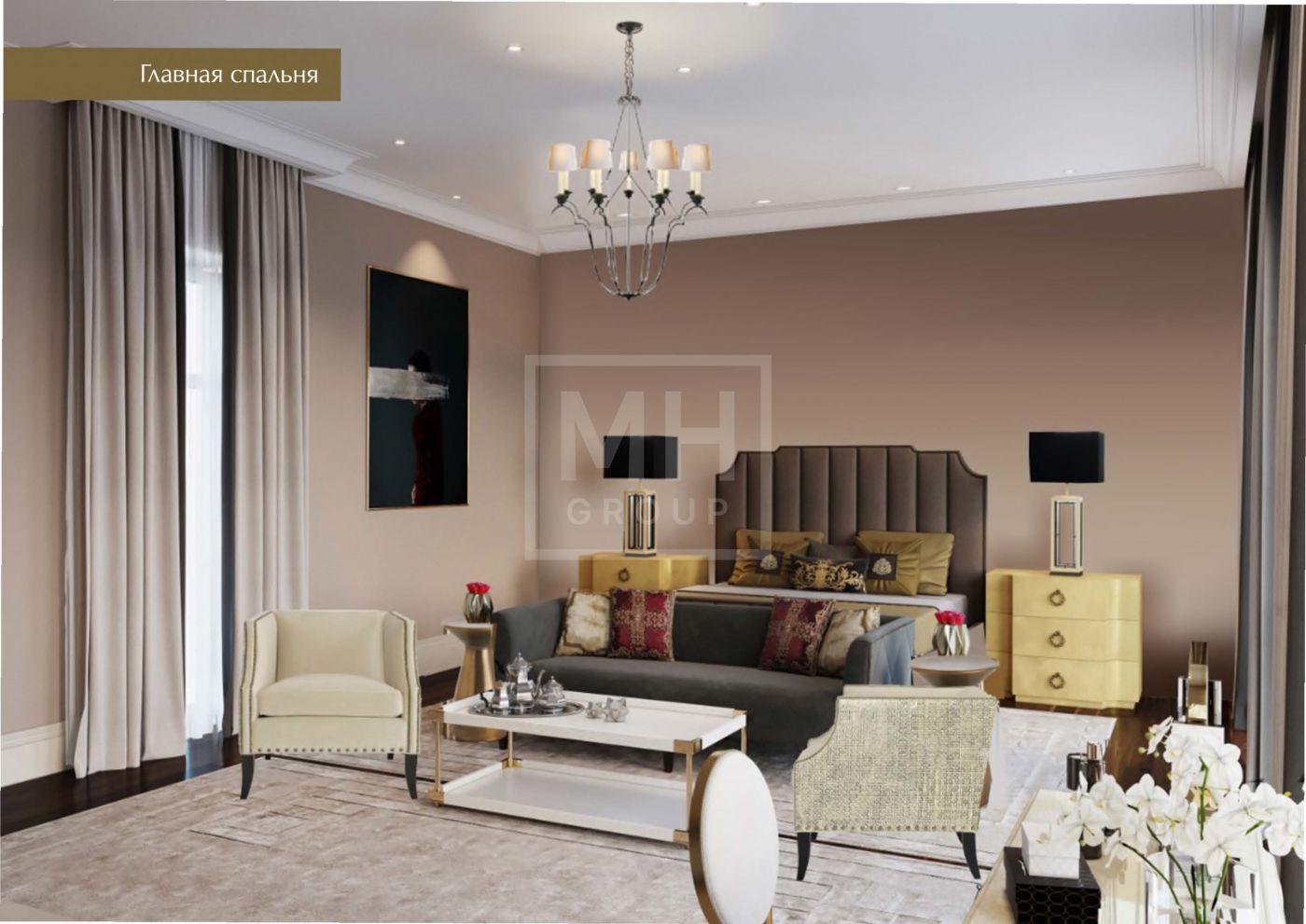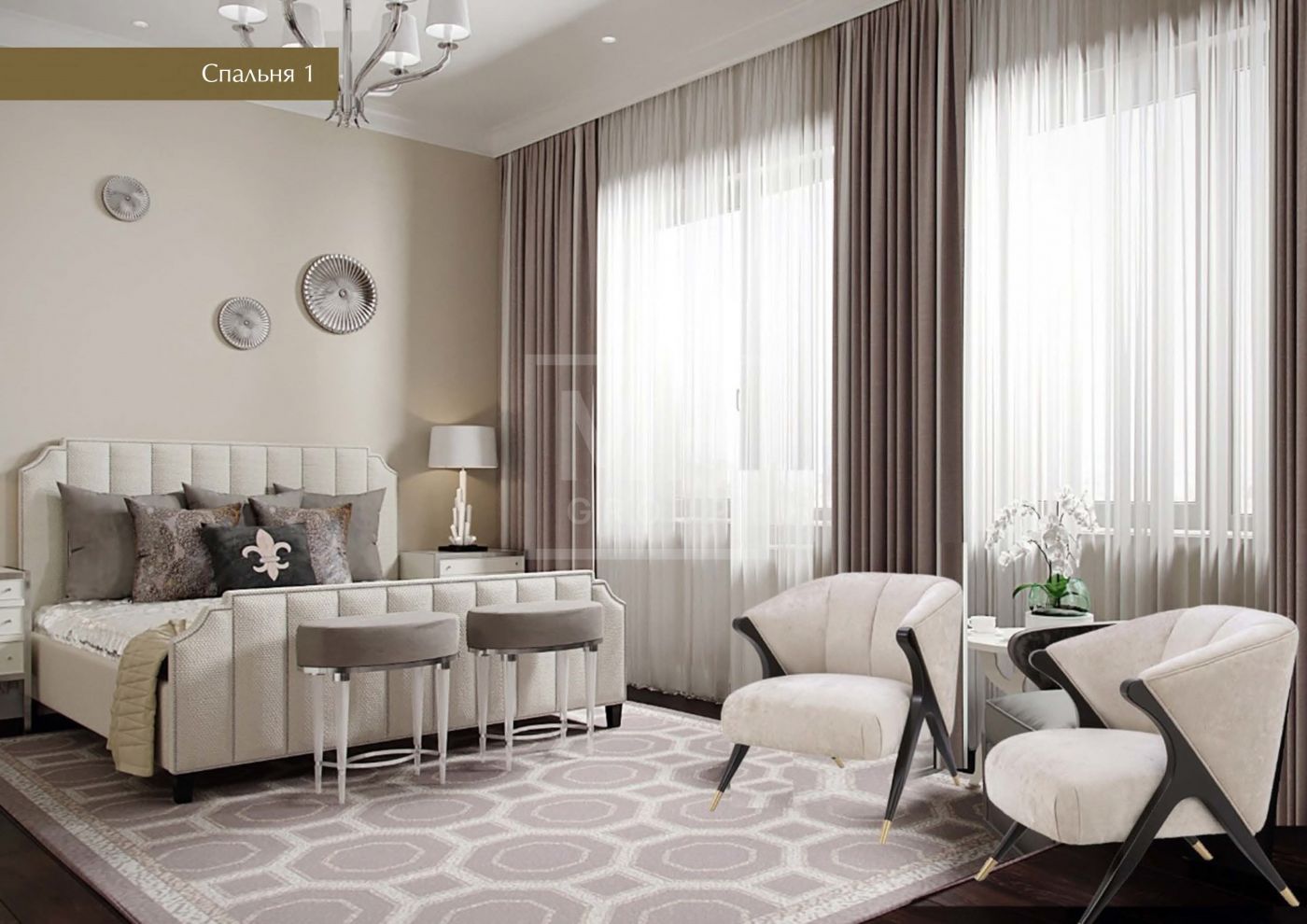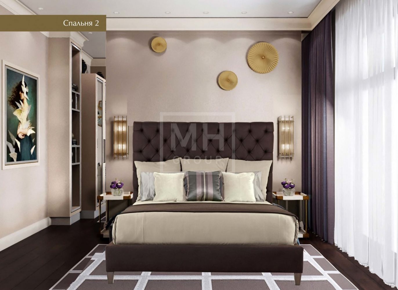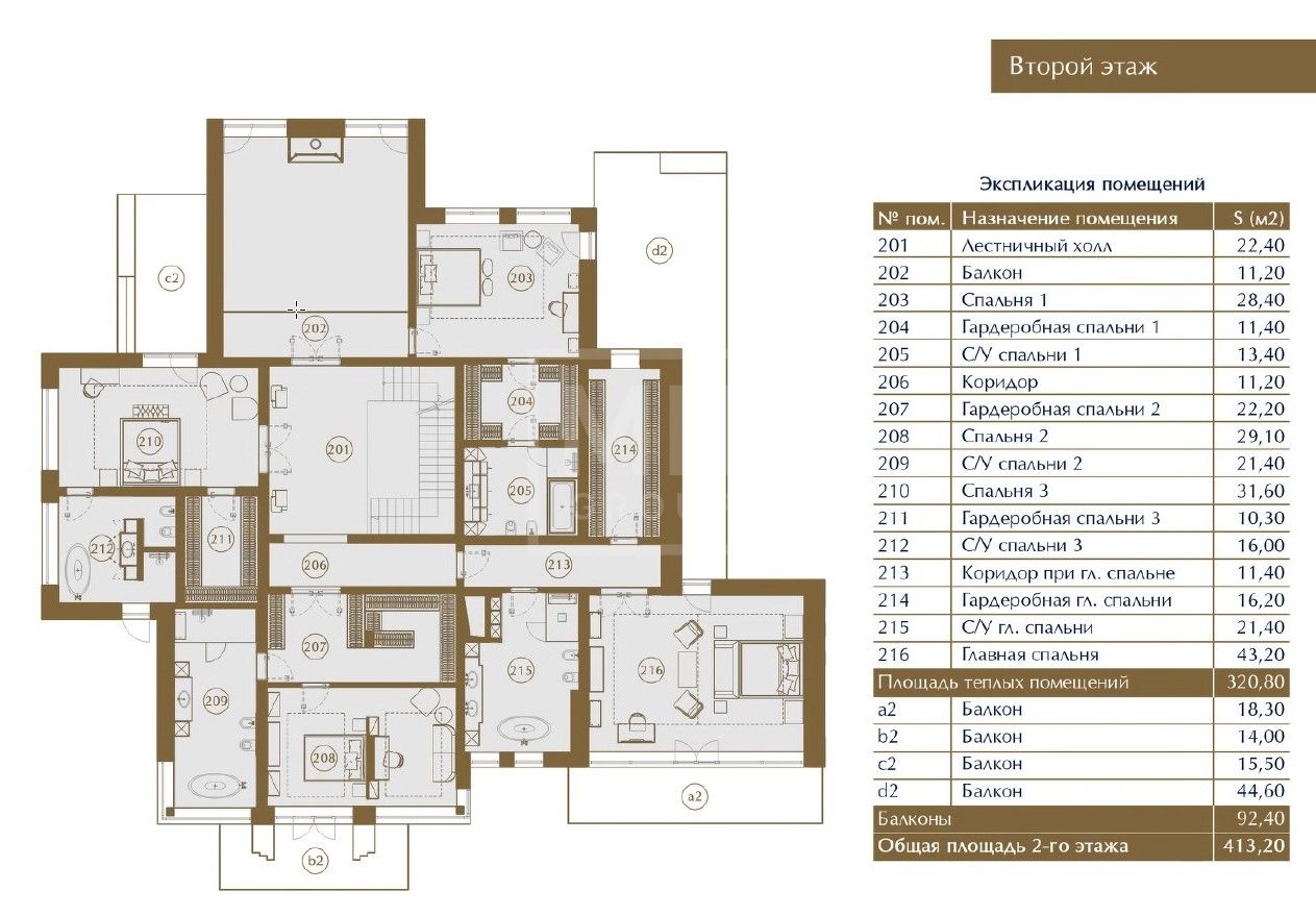 Этаж 2: холл, 4 спальни с ванными комнатами и гардеробными, балконы.