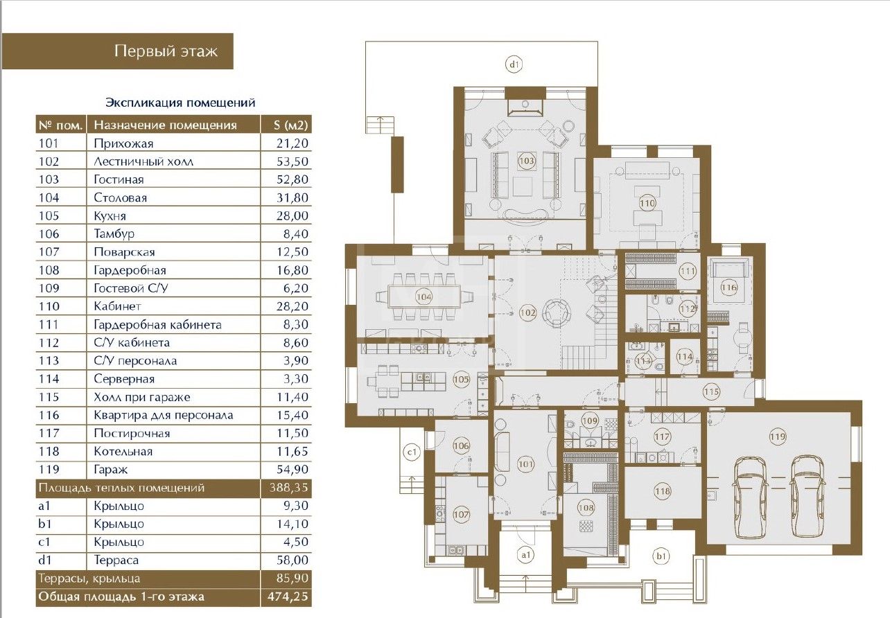 Этаж 1: прихожая, 2 холла, 2 гардеробные, кухня, поварская, столовая, гостиная, кабинет с гардеробной и с/у, гостевой с/у, квартира для персонала с кухней и с/у, гараж на 2 м/м, постирочная, котельная
