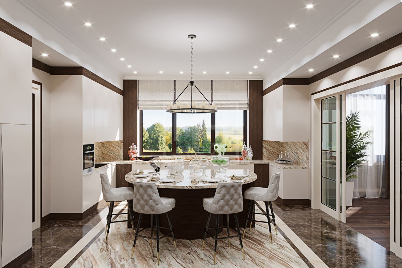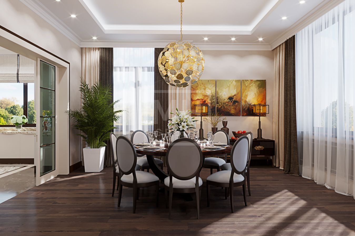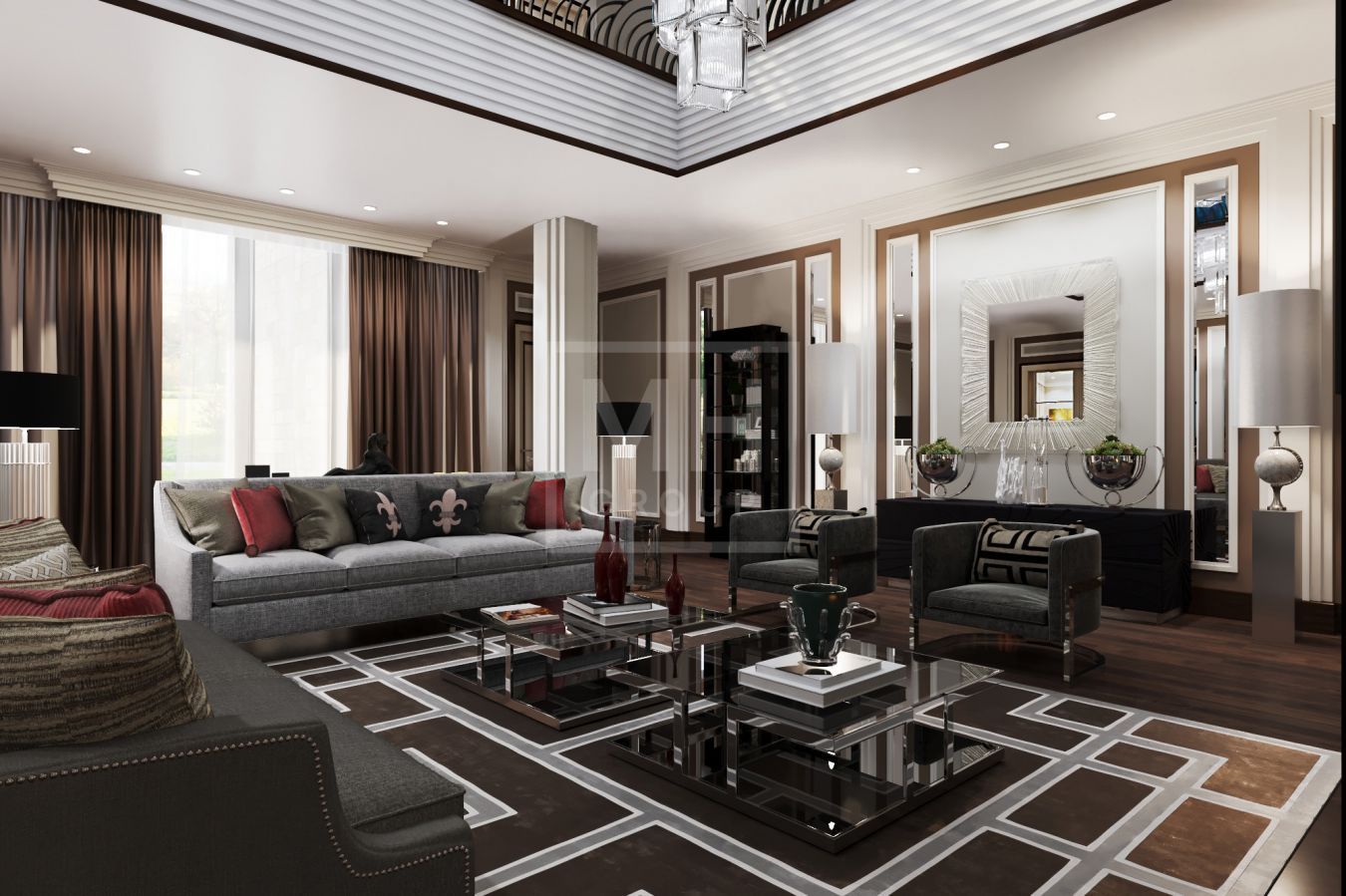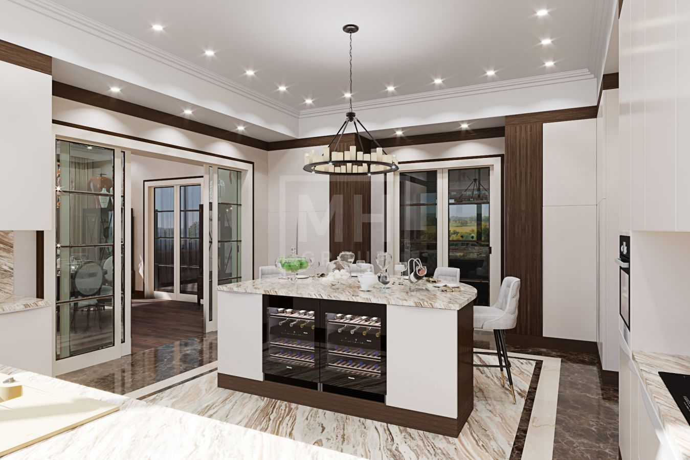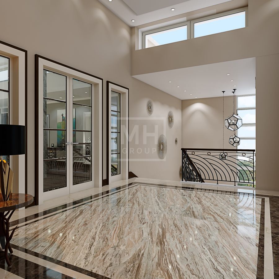 Этаж 1: 2 холла, коридор, лифт, 1 спальня, кухня, столовая, гостиная, кабинет, 3 с/у, 2 гардеробные