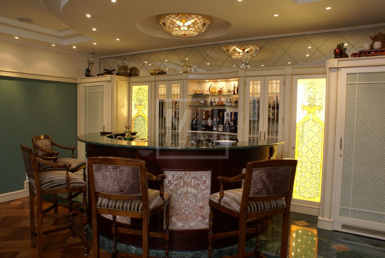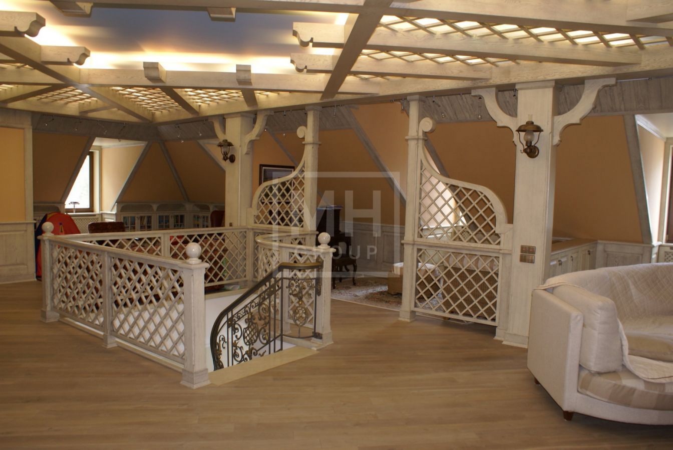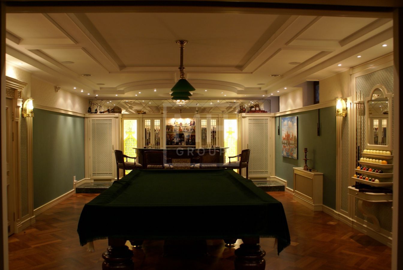 Цоколь: SPA-комплекс с хамамом, массажной, душевой, бильярдная с барной стойкой, домашний кинотетар, сезонная гардеробная, постирочная, гладильная, котельная, гараж на 2 а/м
