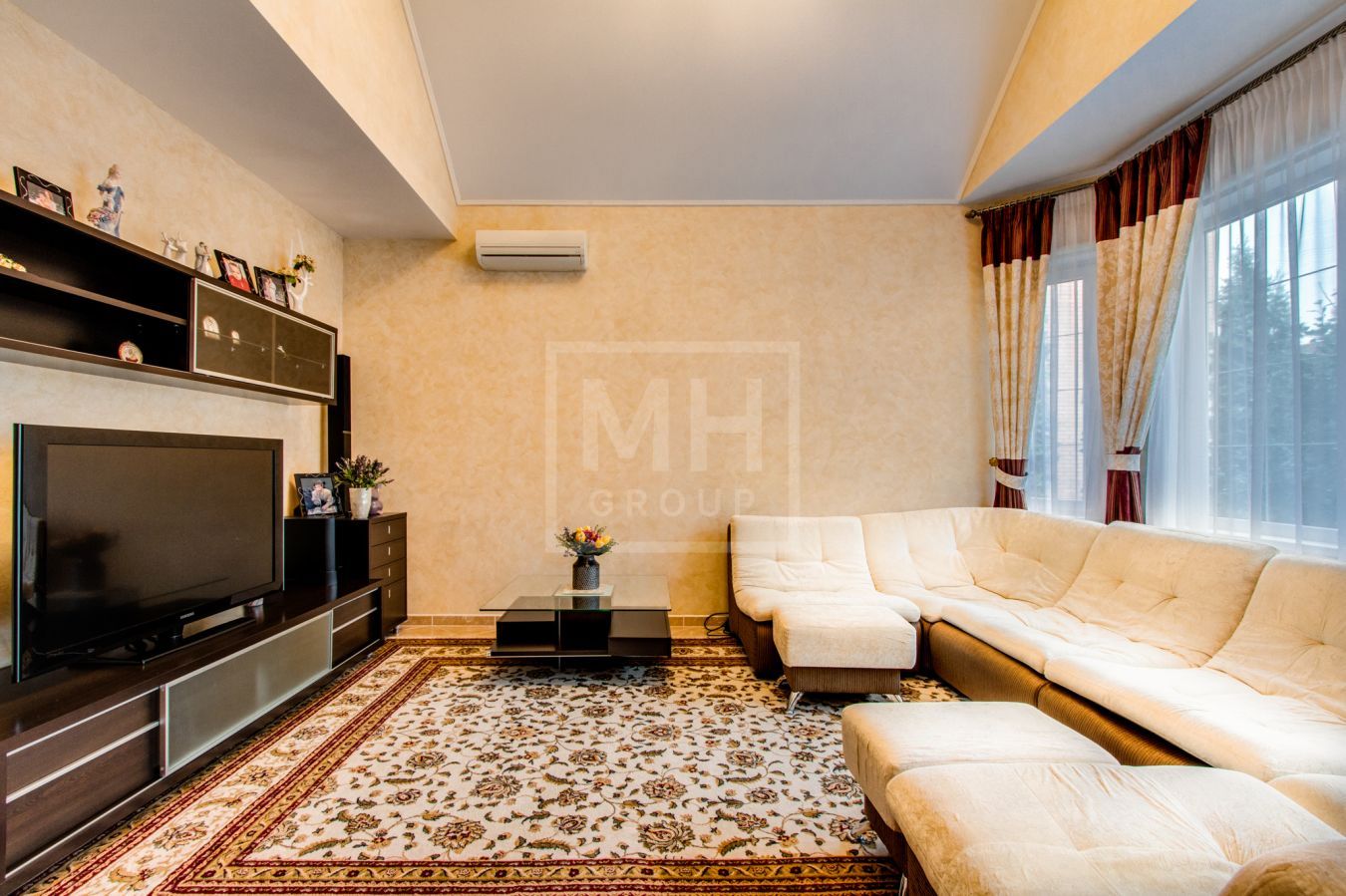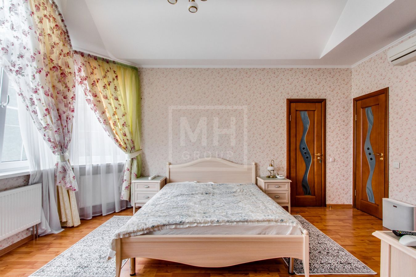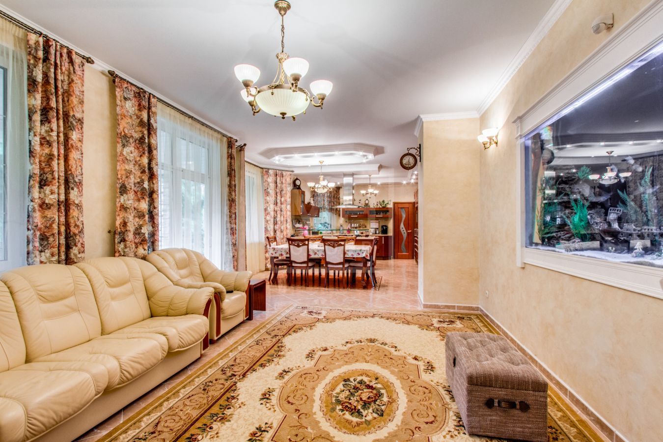 Предлагается к продаже дом площадью 450 кв. метров в коттеджном поселке "Росинка", в 15 километрах от МКАД по Новорижскому шоссе. В доме три спальни, каждая из которых с индивидуальными санузлами, кабинет на первом этаже, кухня, столовая,гостиная с выходом на террасу, бильярдная, детская игровая. Дом стоит на лесном участке в 90 соток, 8 оформлены в собственность. Участок граничит с сосновым лесом. На участке детская площадка, пруд с карпами, на берегу которого стоит баня на дровах с кухней, душевой и санузлом; участок благоустроен, растут корабельные сосны, ели, ивы,березы, туи, плодовые деревья. Есть выход в лес. На участке также расположено здание гаража на шесть автомобилей, над которым находятся две квартиры для персонала. В каждой спальня, кухня и санузел. Все коммуникации подведены: электричество (40 кВт), магистральный газ, вода (из артезианской скважины), центральная канализация. Дом продается с отделкой под ключ.