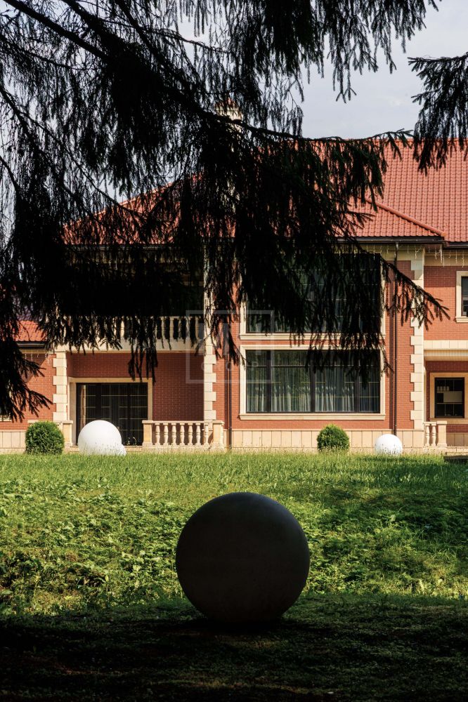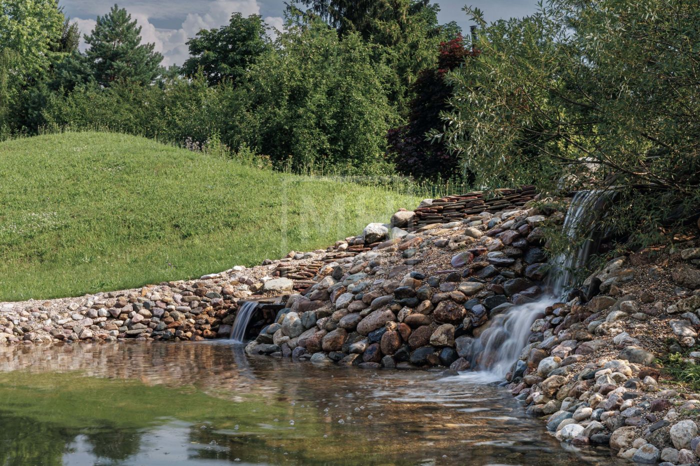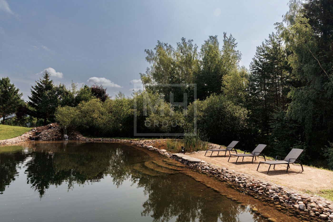Вся приватная часть придомовой территории выходит на юг, на участке обустроены газон, искусственный пруд и ландшафтные решения по границам владения.