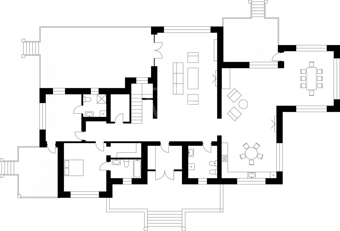 Этаж 1: гостинная,прихожая,гардеробная, кухня столовая, каминный зал,кабинет, 3 спальни с с/у , 3 террасы. Гостевой дом: гараж, SPA -зона, бассейн, комната отдыха, гардеробная,терраса, постирочная,с/у-1