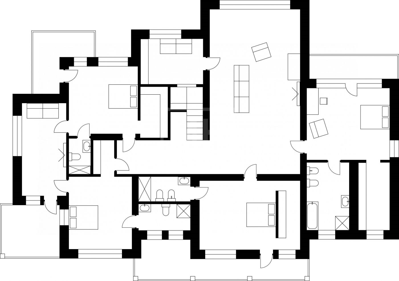 Этаж 2: гостиная, холл, спальня-5, гардеробная-4, с/у-5, балконы-4 Гостевой дом: спальня-2,каминный зал,кухня,с/у-2,квартира для персонала (отдельный вход)