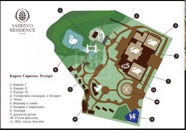 Шикарная резиденция Сареево Резорт, включает в себя огромный особняк в английском стиле с интересным ландшафтом, находящийся на склоне холма, состоящий из нескольких корпусов и дополнительных строений.Расположенный на прилесном участке на территории имеется несколько парков,прогулочных мостов, веранд и террас и все это в окружении массивного леса.18 спалень, пять залов, два бассейна,две сауны,два хамама, пять кухонь, свой мини зоопарк и ферма, мини охотничий домик, парки,речка и водопад, террасы, бруклинский мост,подземная парковка и многое другое.