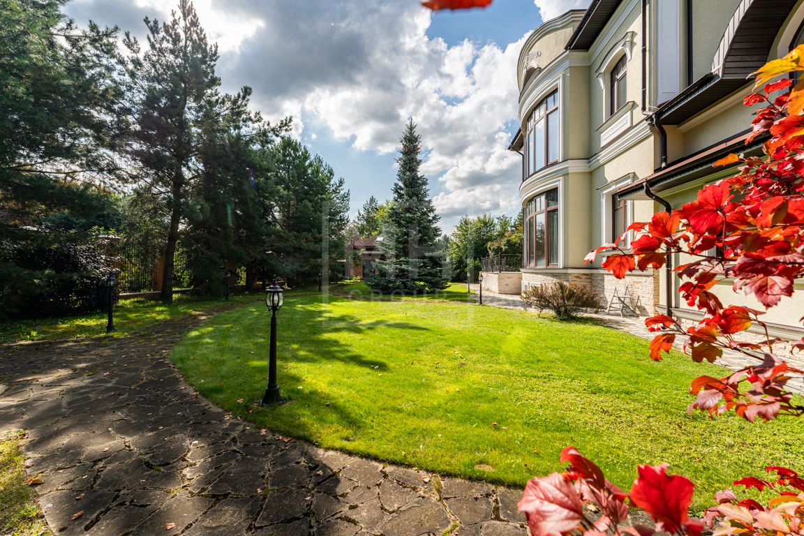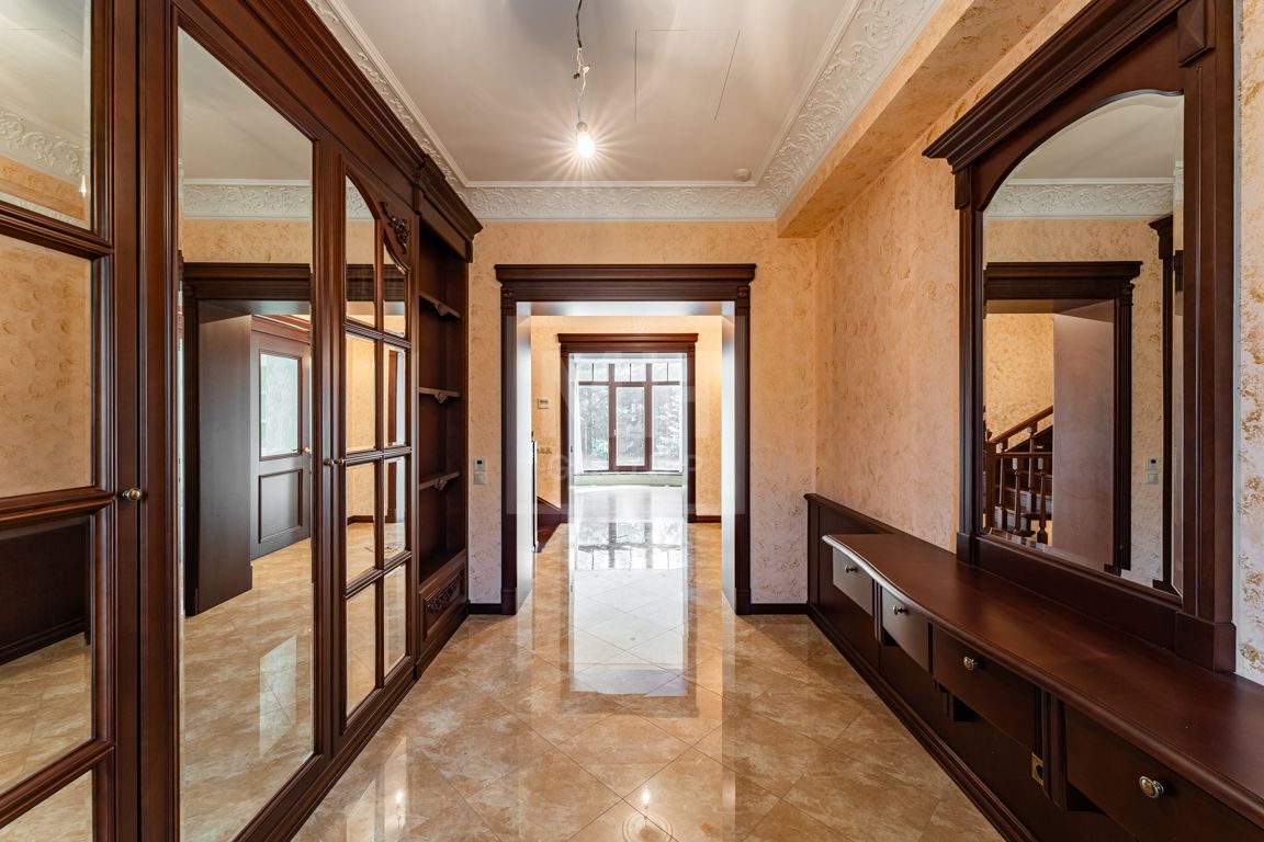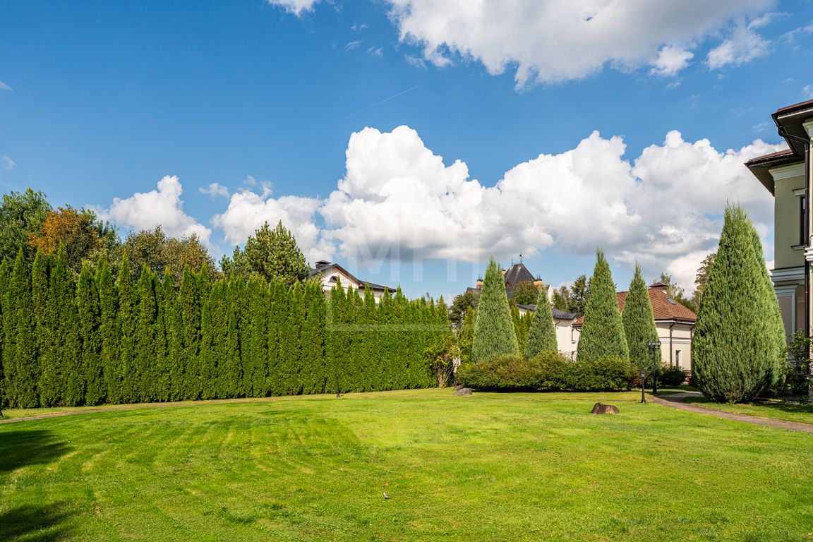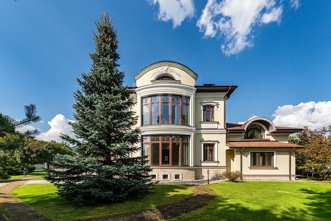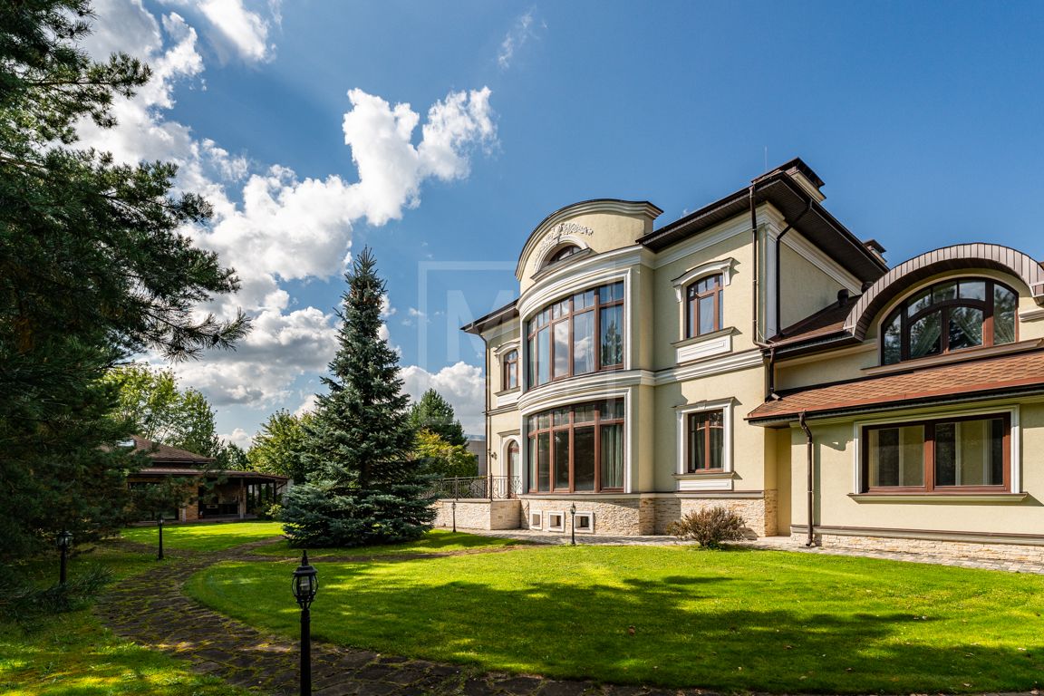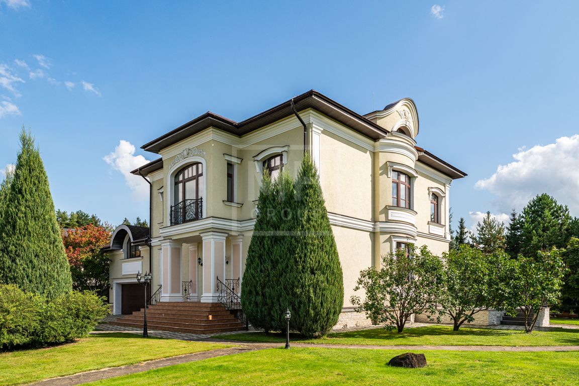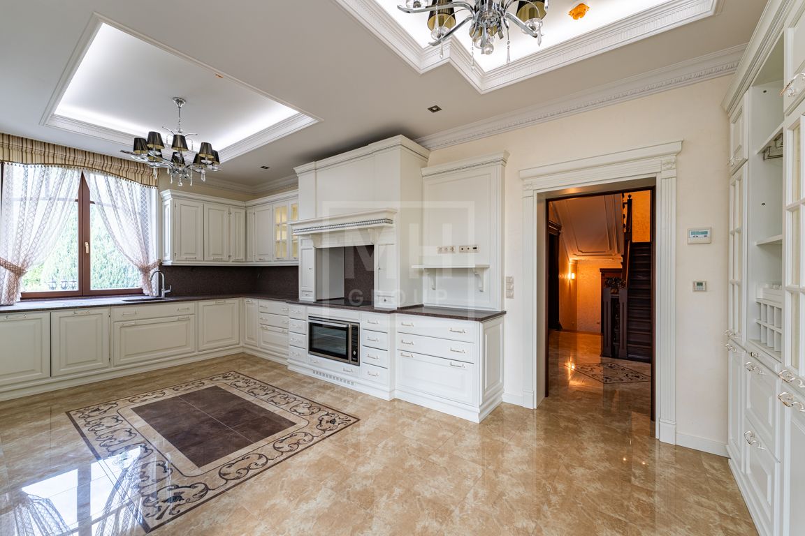 Коттедж в классическом стиле под ключ без мебели общей площадью 860 м2, на участке правильной формы 29 соток с ландшафтным дизайном чайным домиком и декоративным прудом. В доме 5 спален и две кухни. Дом находится в центре, в обжитой и застроенной части поселка.