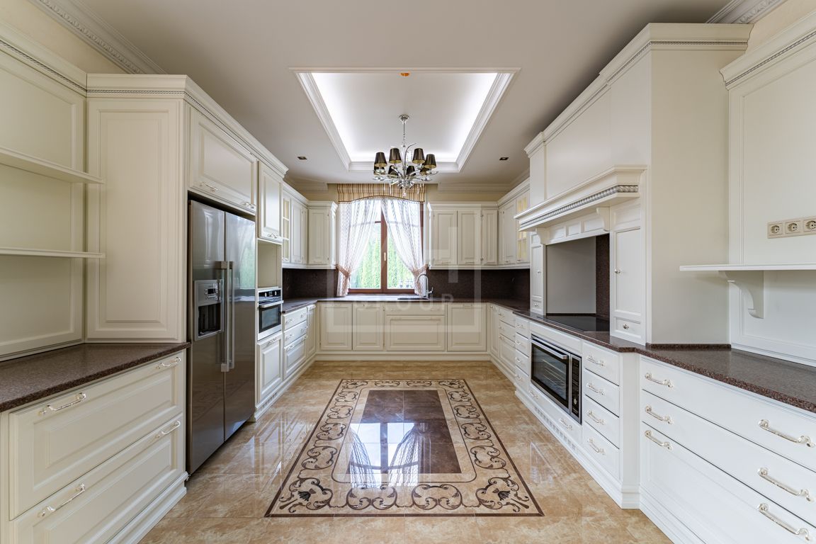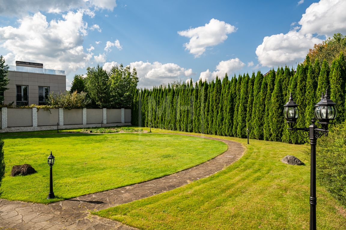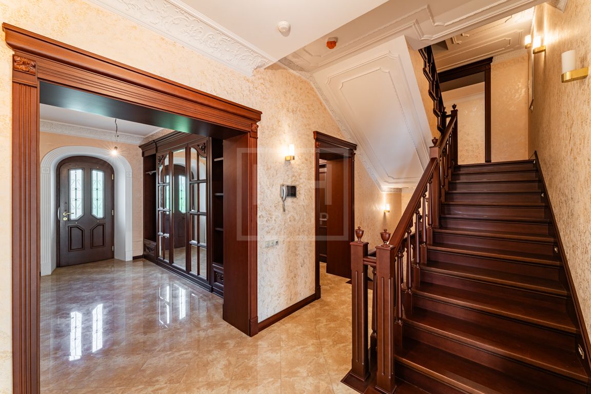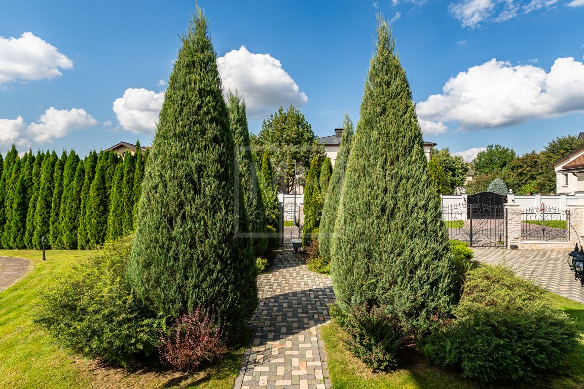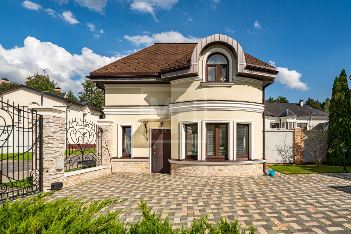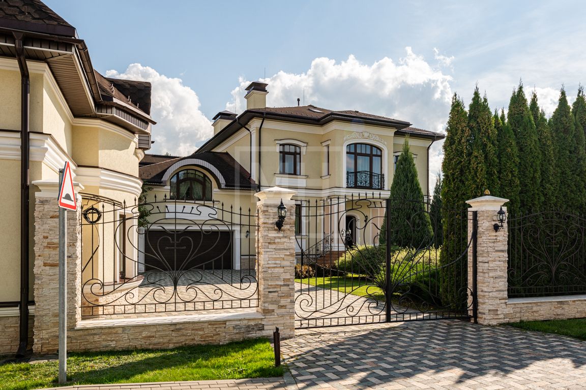 Коттедж в классическом стиле под ключ без мебели общей площадью 860 м2, на участке правильной формы 29 соток с ландшафтным дизайном чайным домиком и декоративным прудом. В доме 5 спален и две кухни. Дом находится в центре, в обжитой и застроенной части поселка.
