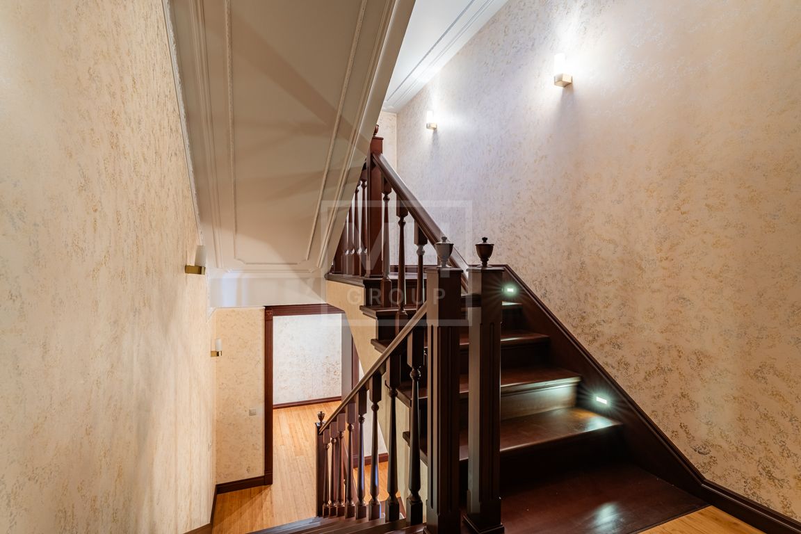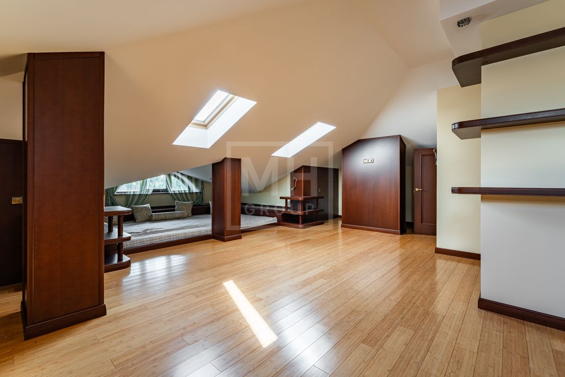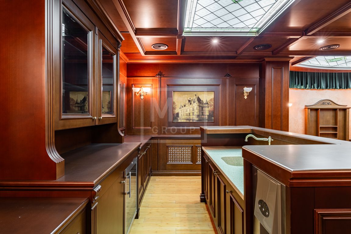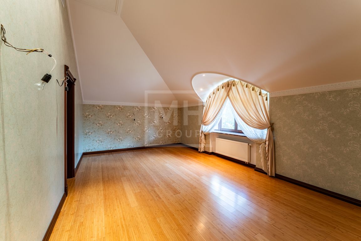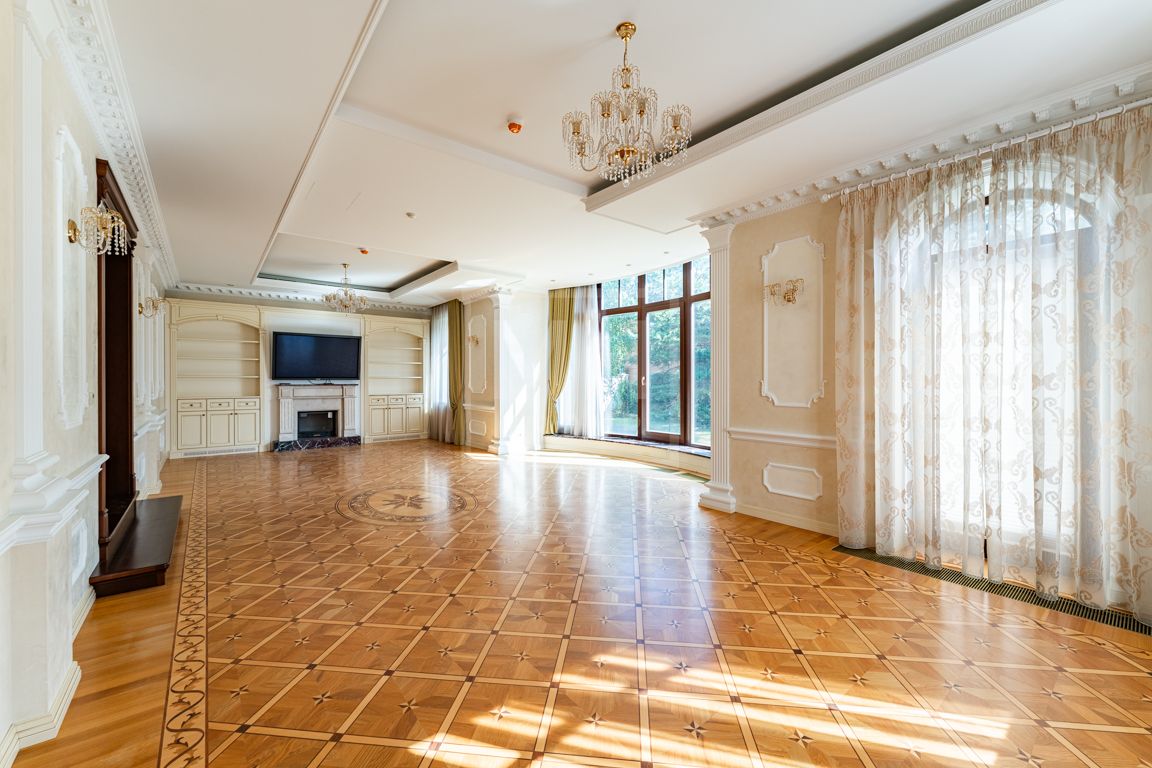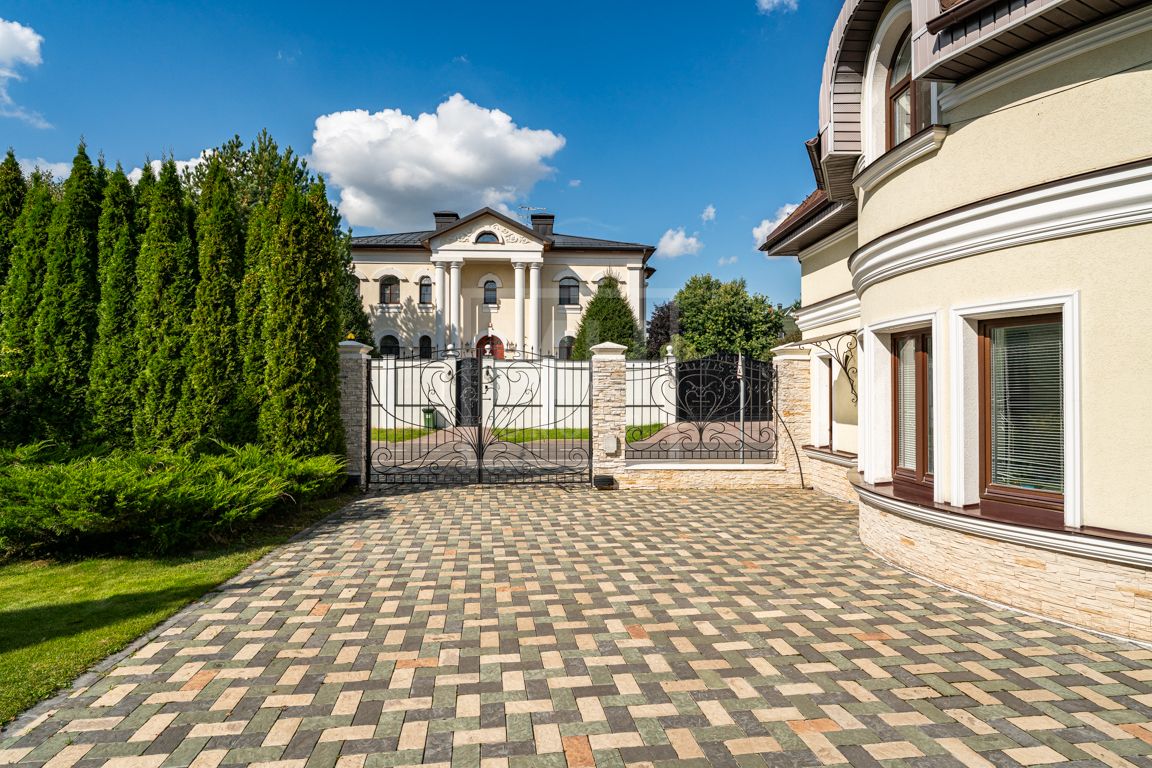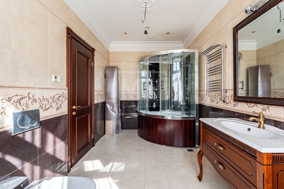 Коттедж в классическом стиле под ключ без мебели общей площадью 860 м2, на участке правильной формы 29 соток с ландшафтным дизайном чайным домиком и декоративным прудом. В доме 5 спален и две кухни. Дом находится в центре, в обжитой и застроенной части поселка.
