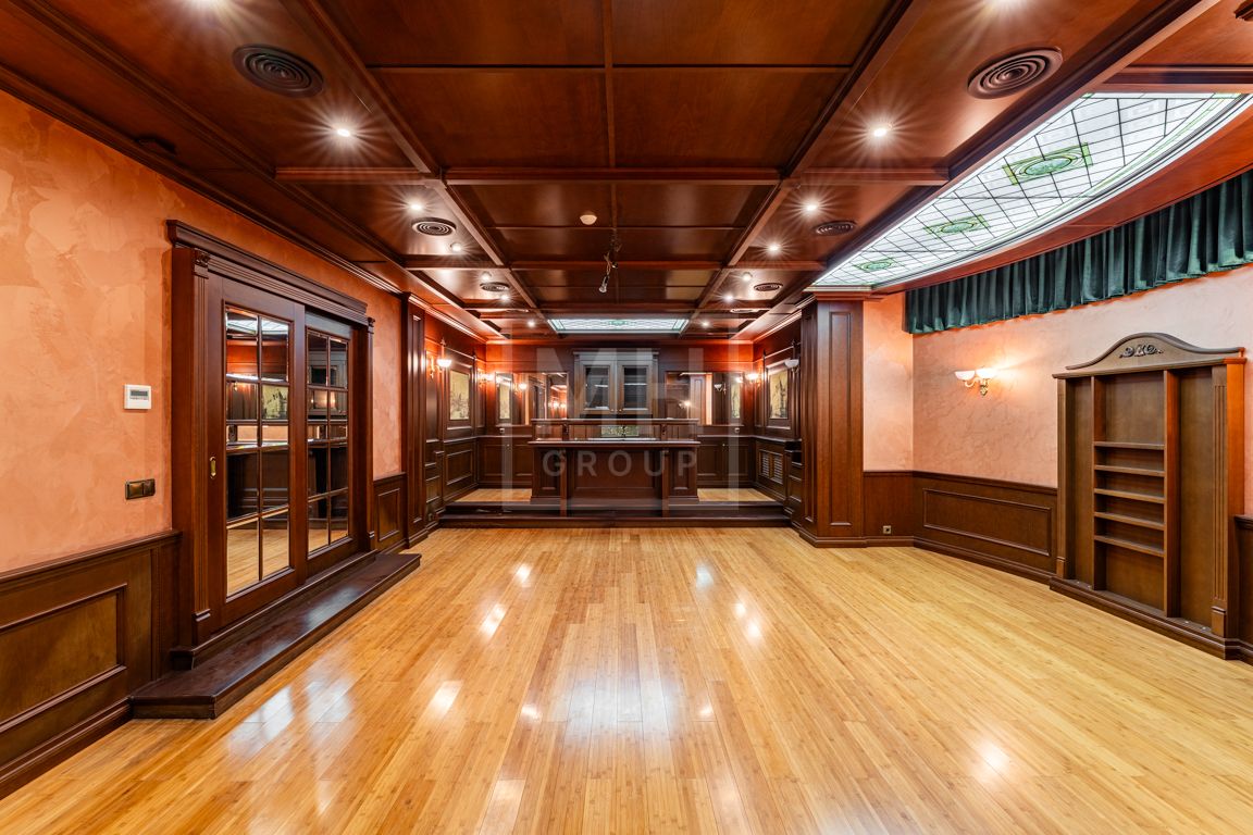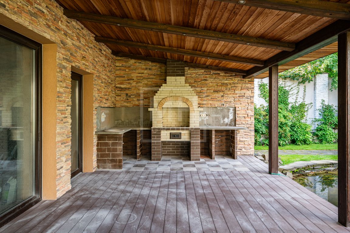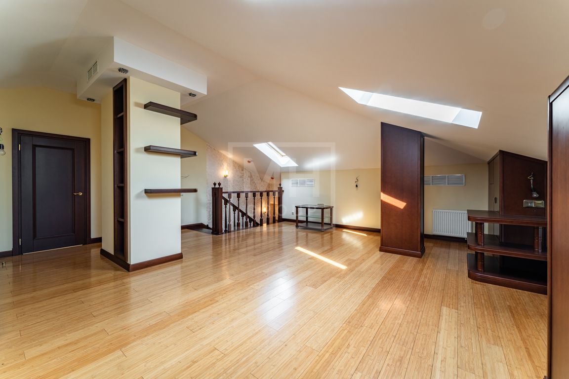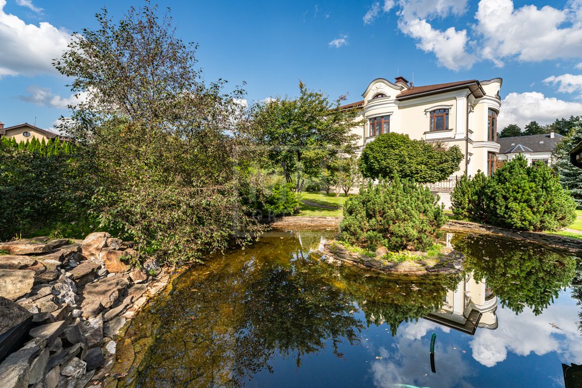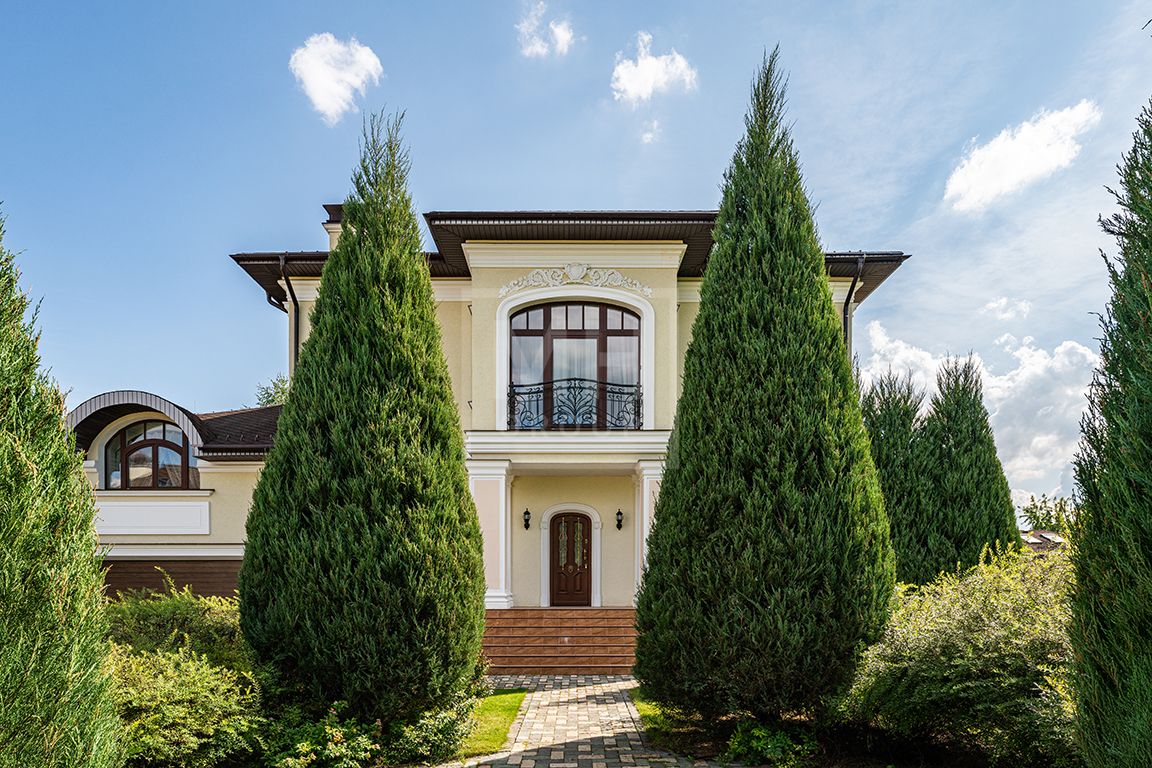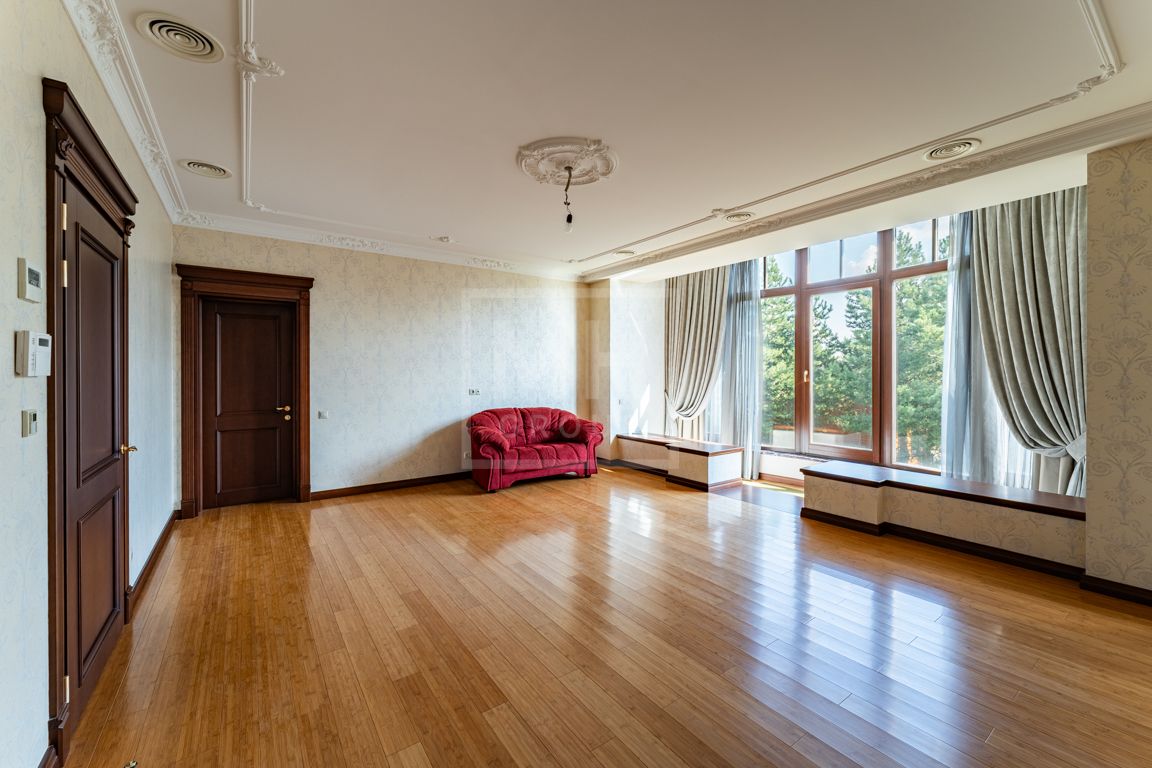 Коттедж в классическом стиле под ключ без мебели общей площадью 860 м2, на участке правильной формы 29 соток с ландшафтным дизайном чайным домиком и декоративным прудом. В доме 5 спален и две кухни. Дом находится в центре, в обжитой и застроенной части поселка.