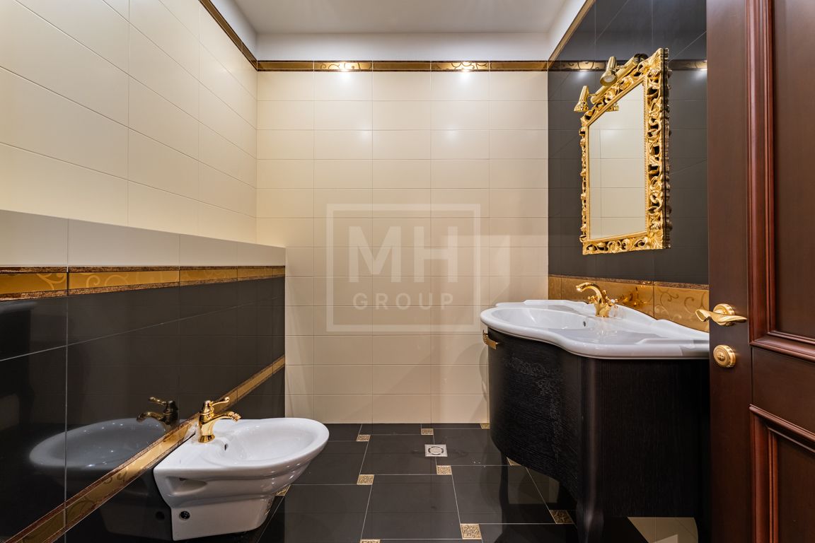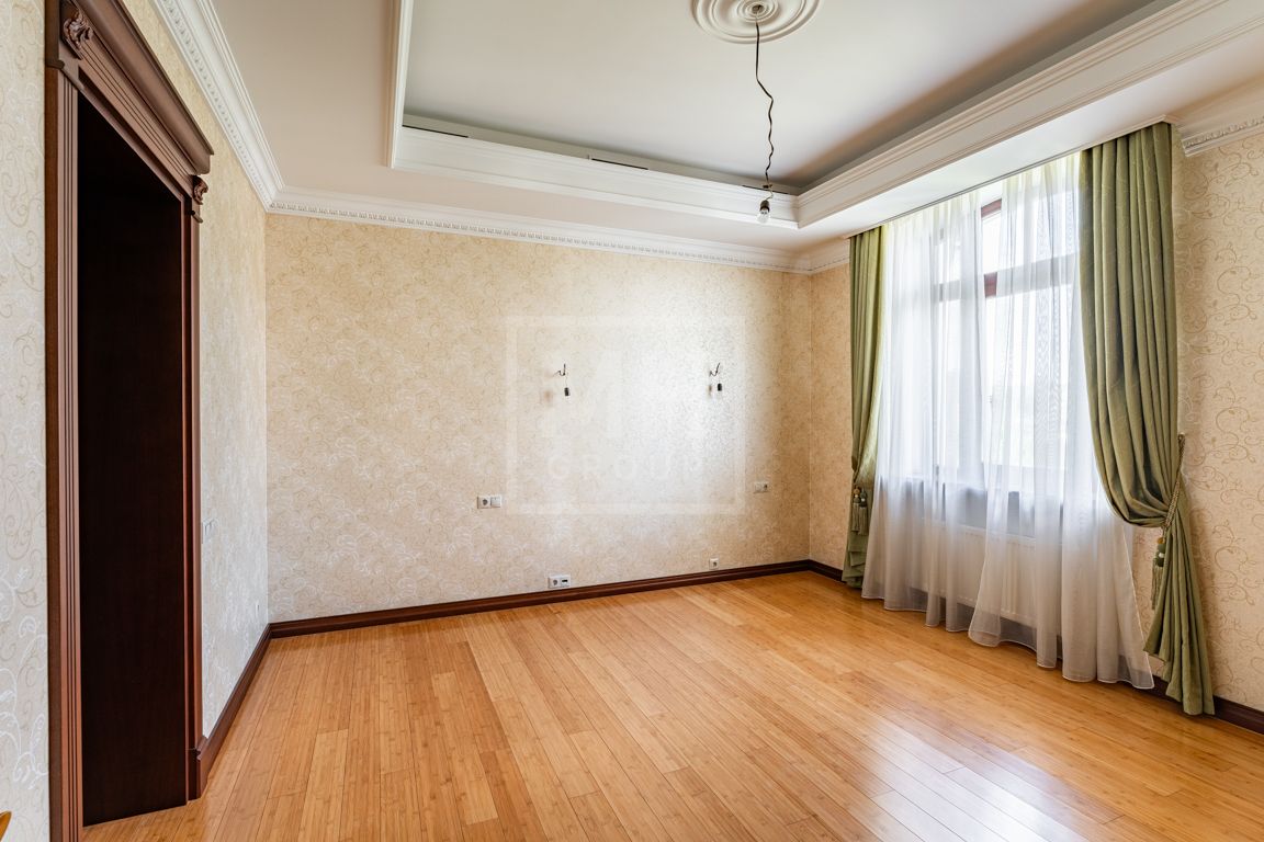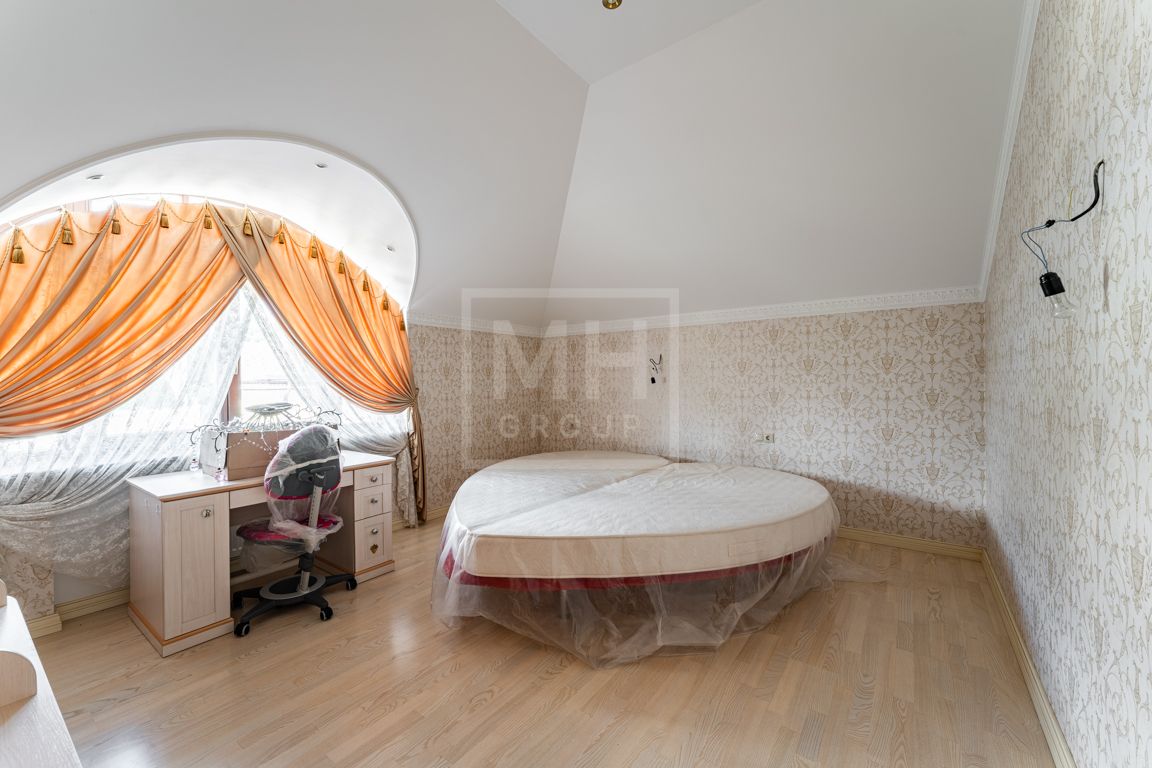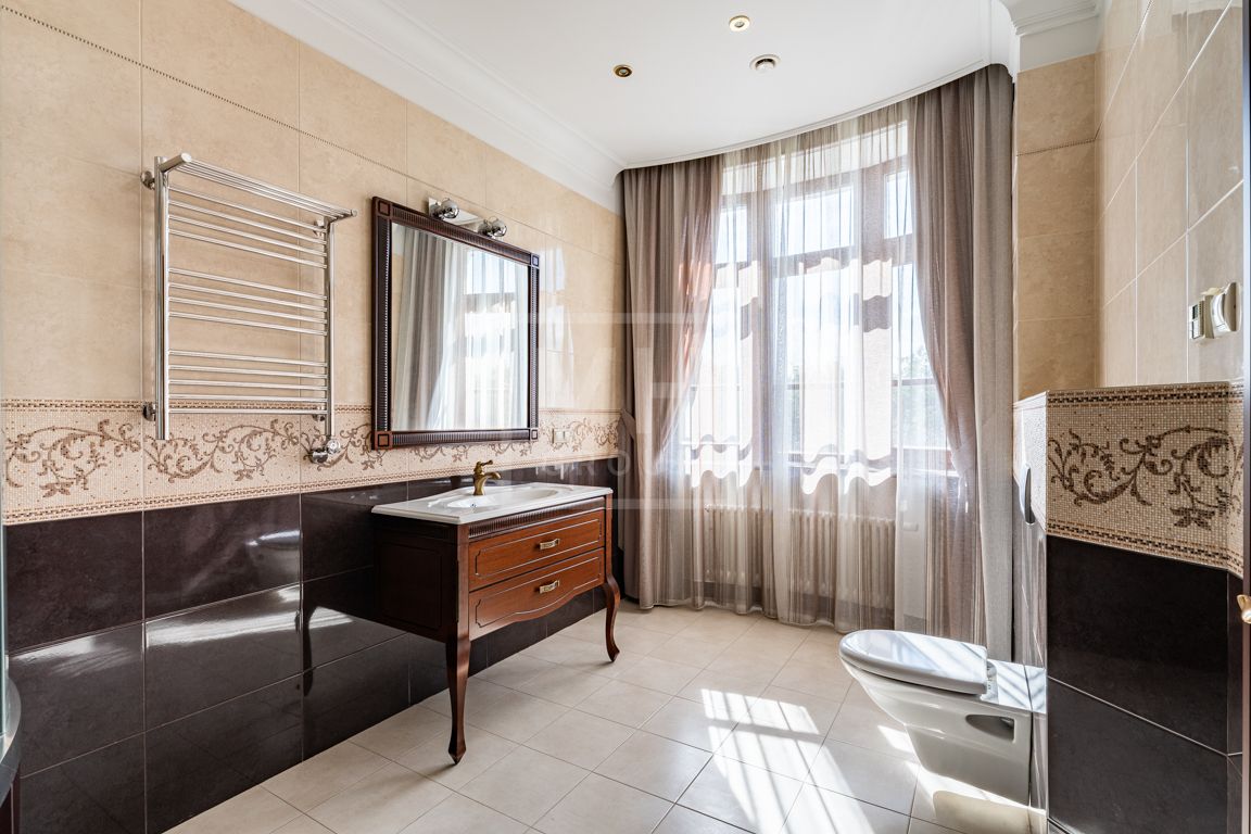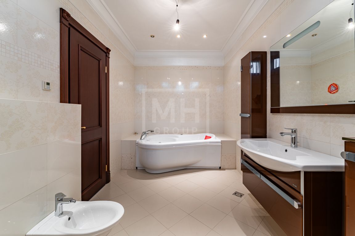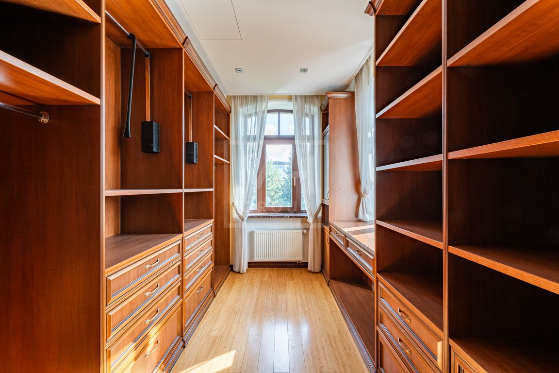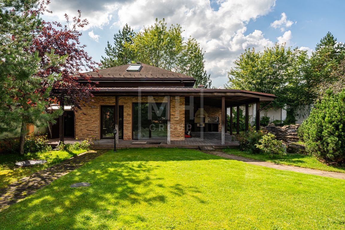 Коттедж в классическом стиле под ключ без мебели общей площадью 860 м2, на участке правильной формы 29 соток с ландшафтным дизайном чайным домиком и декоративным прудом. В доме 5 спален и две кухни. Дом находится в центре, в обжитой и застроенной части поселка.