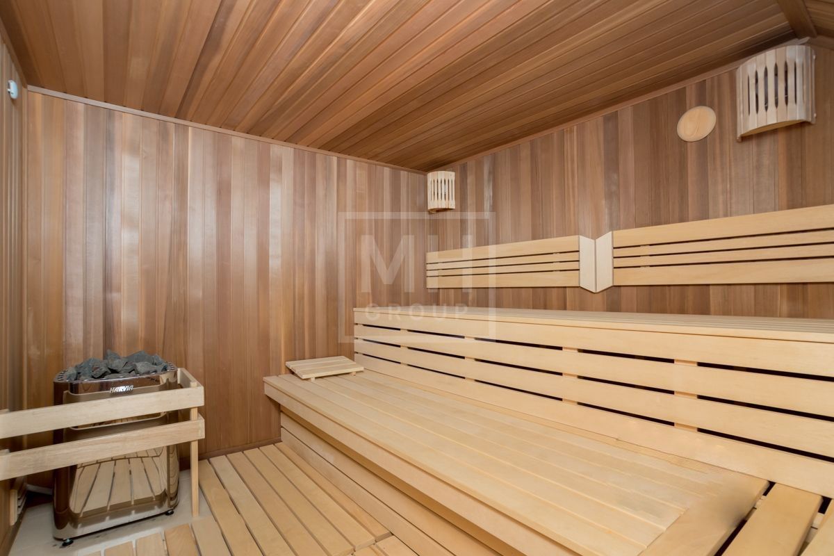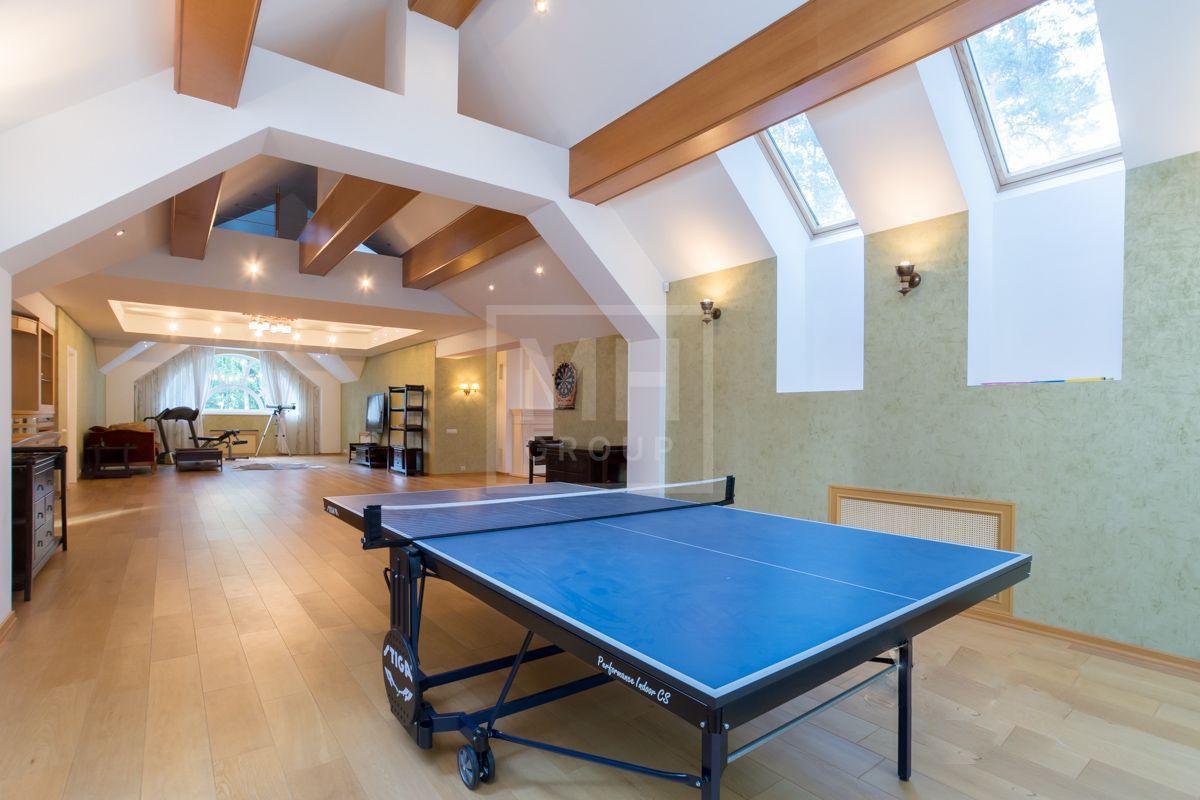 В мансарде обустроены гостевая спальня с санузлом, детская игровая комната, кабинет, бар и зона отдыха с камином и сауной.