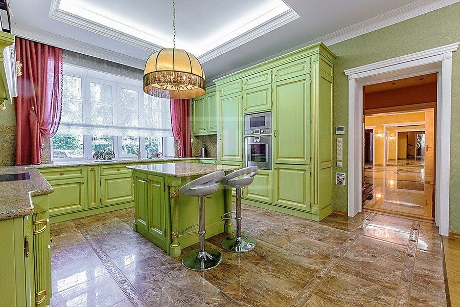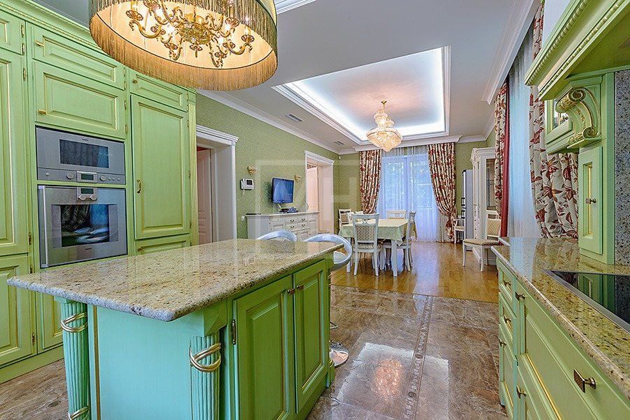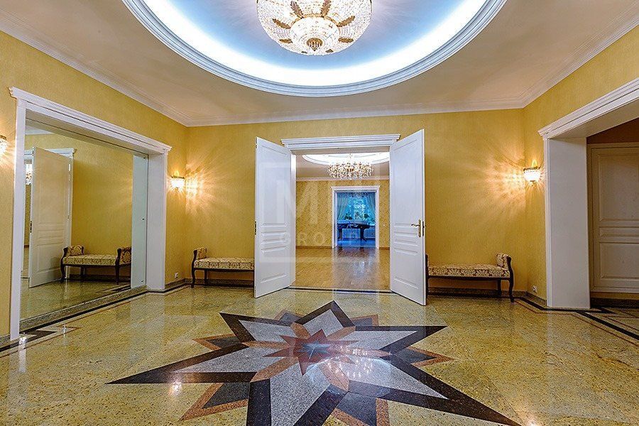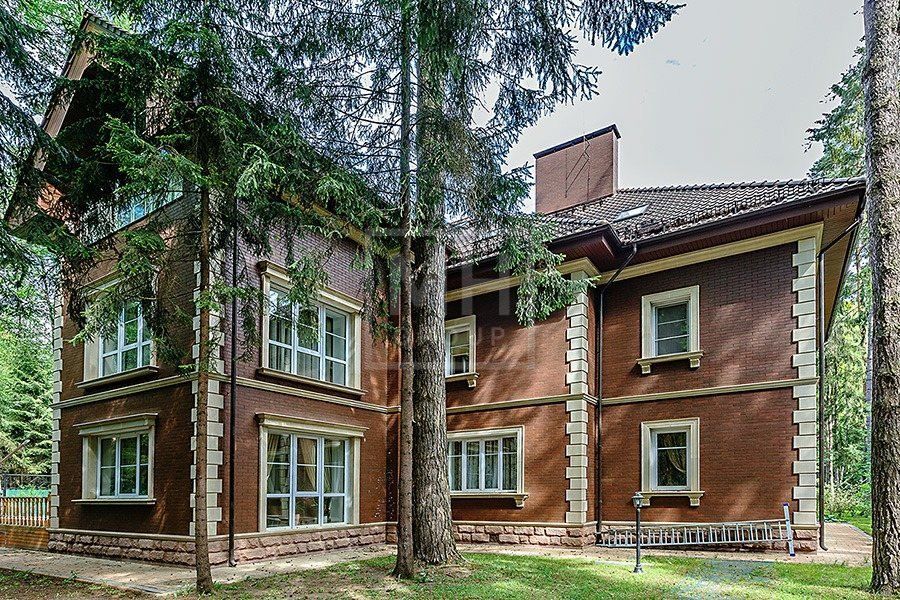 Цокольный этаж занимает кухня для персонала. На большом земельном участке выполнен ландшафтный дизайн.