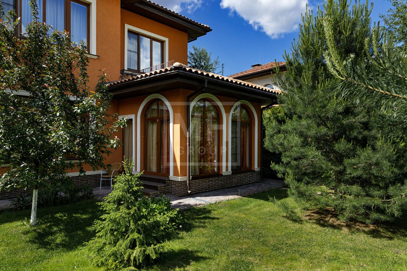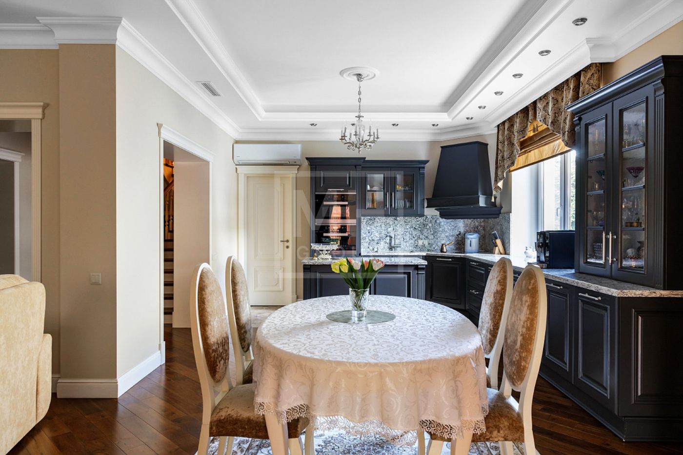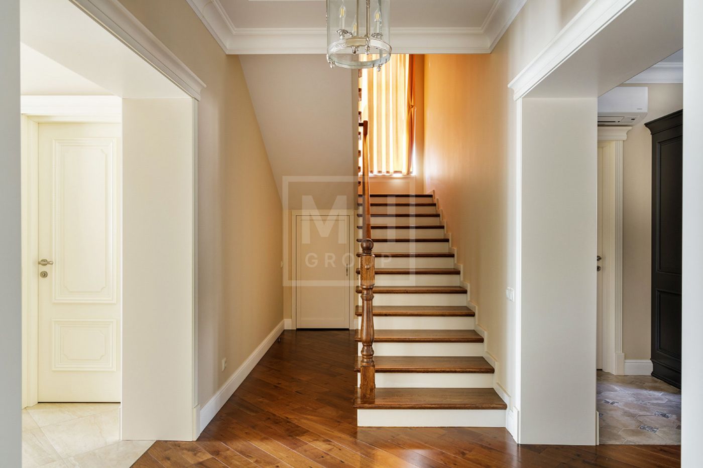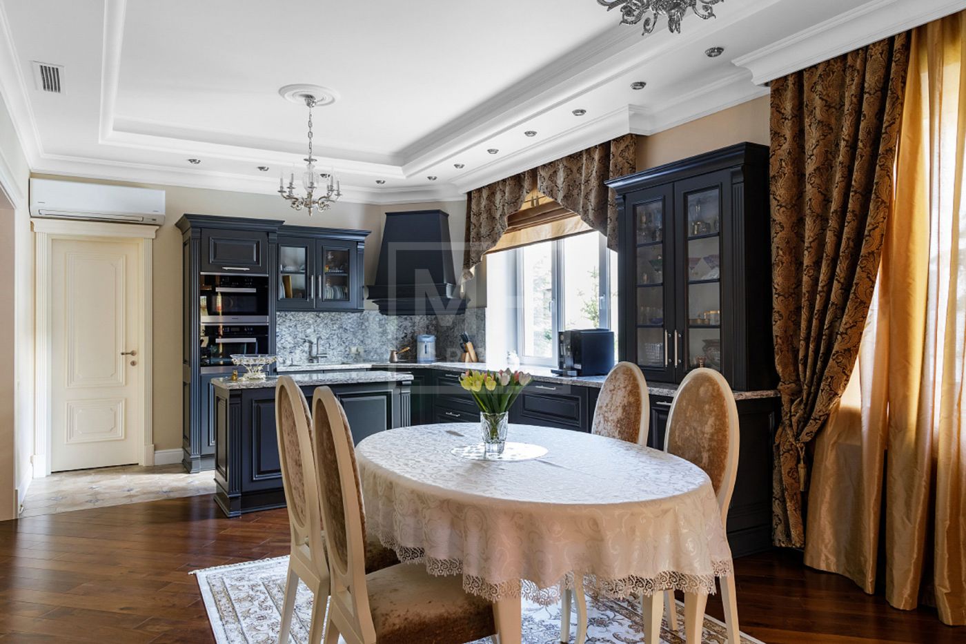 На первом этаже нас встречает красивая, просторная прихожая, после нее мы попадаем в кухню-столовую, отдельно расположена рабочая кухня, прекрасный зимний сад, гостиная с камином, гостевая спальня. Дом полностью меблирован, вся техника Miele. Установлена приточная вентиляция и дополнительное индивидуальное кондиционирование дома.