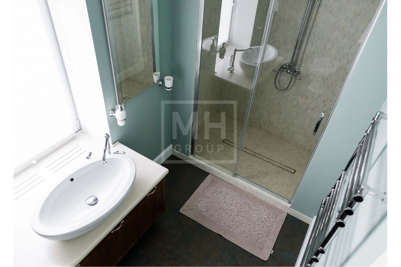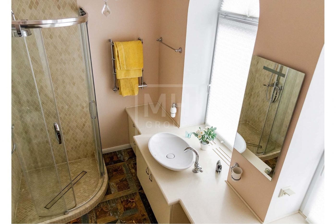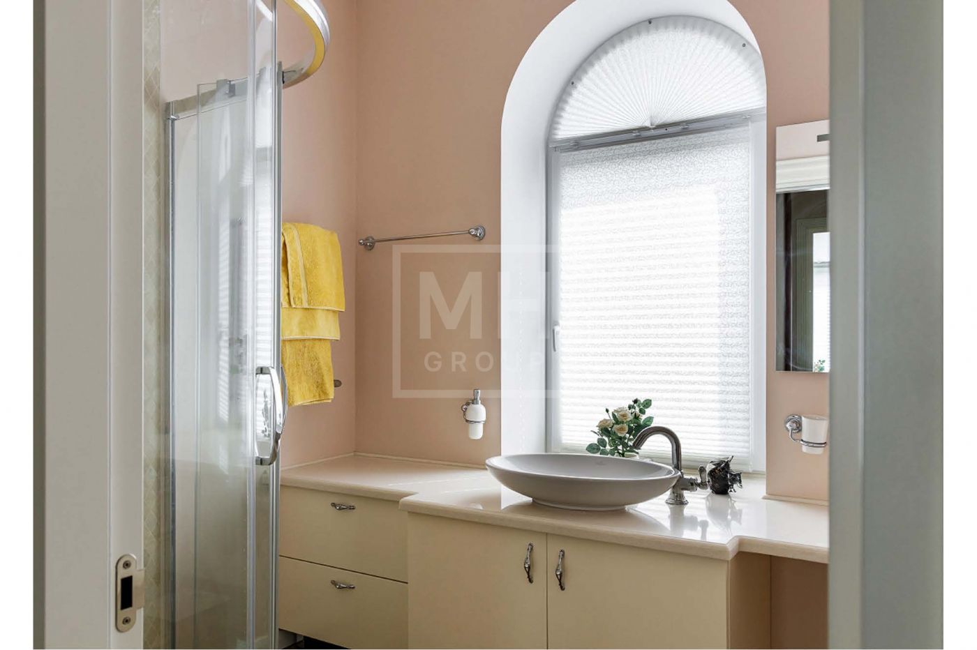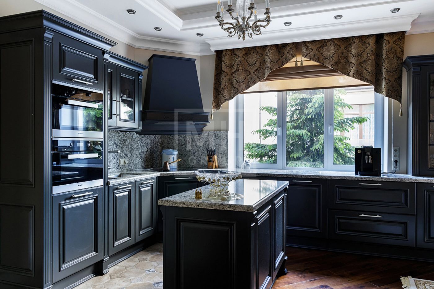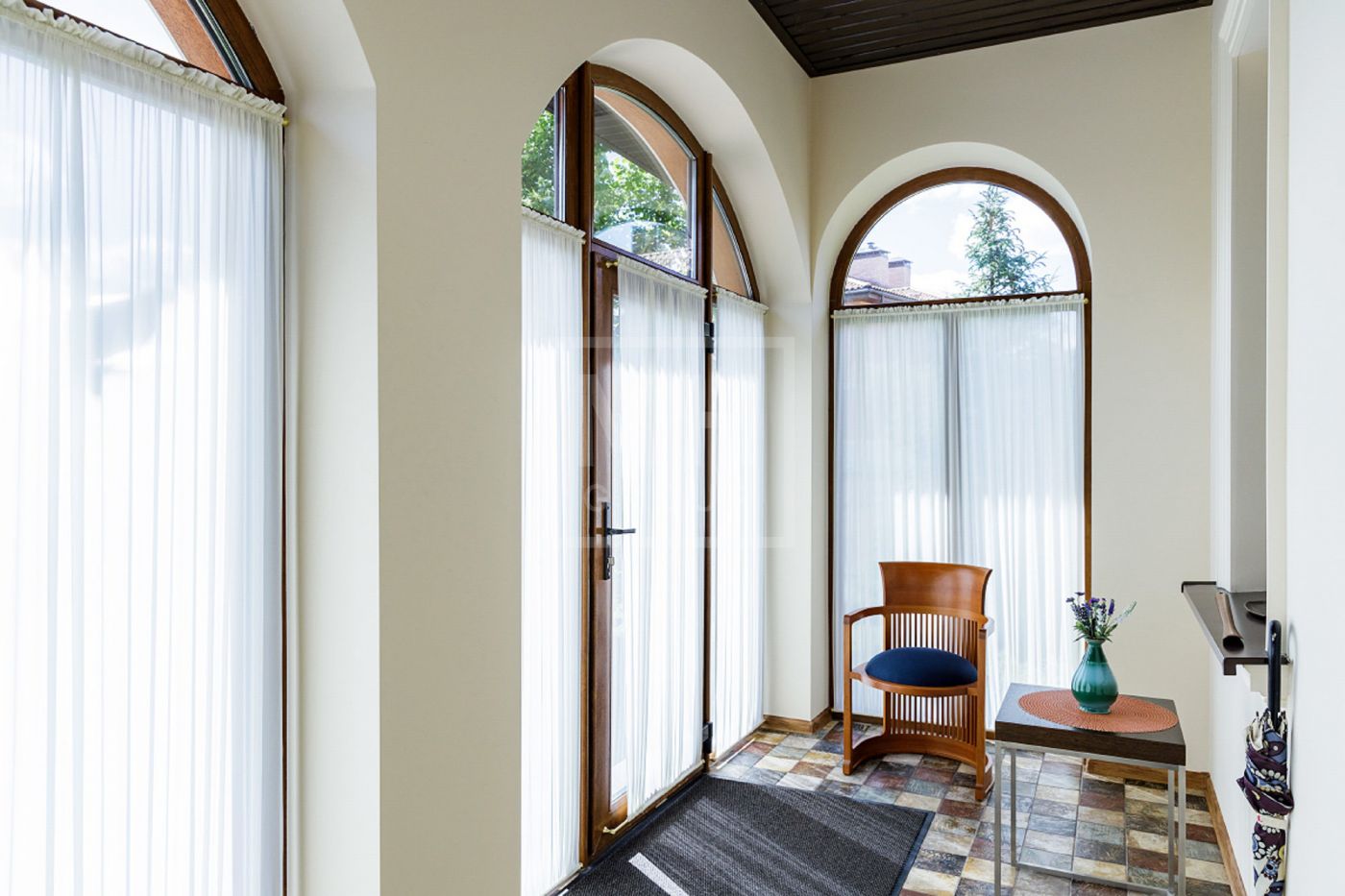 На первом этаже нас встречает красивая, просторная прихожая, после нее мы попадаем в кухню-столовую, отдельно расположена рабочая кухня, прекрасный зимний сад, гостиная с камином, гостевая спальня. Дом полностью меблирован, вся техника Miele. Установлена приточная вентиляция и дополнительное индивидуальное кондиционирование дома.