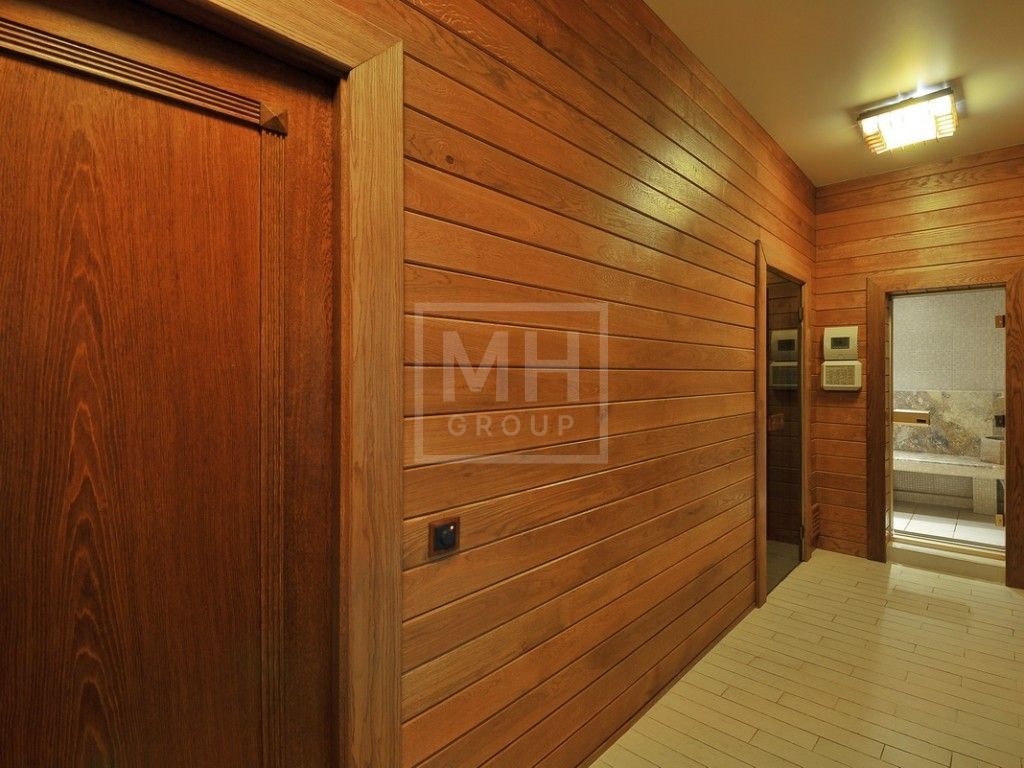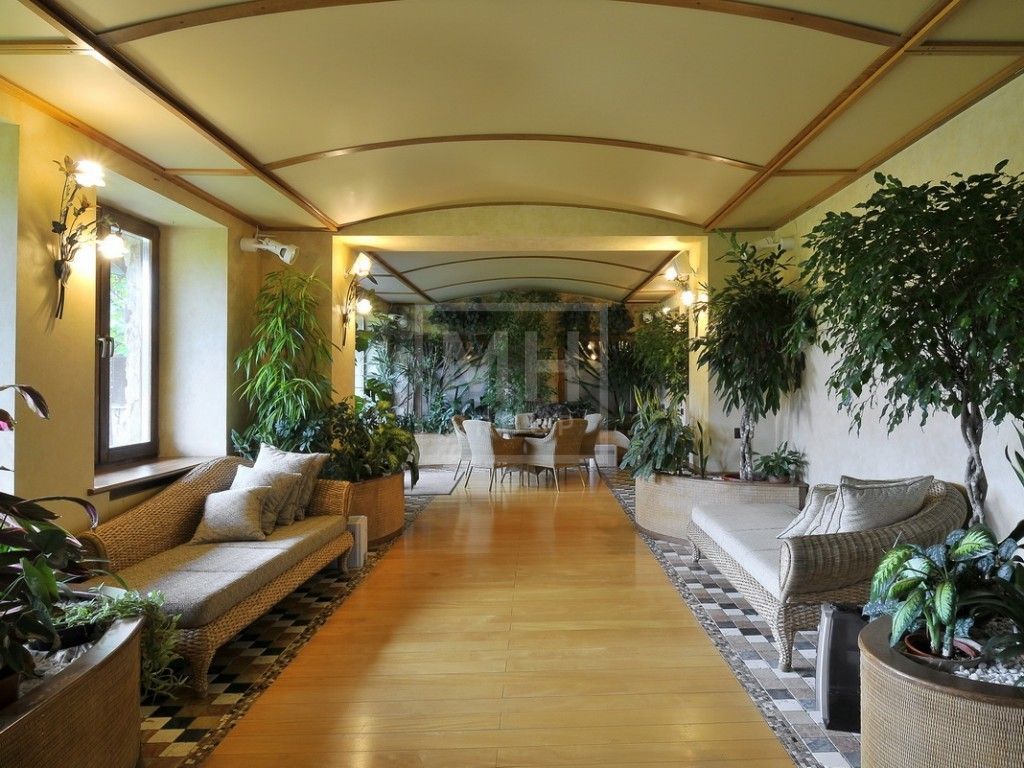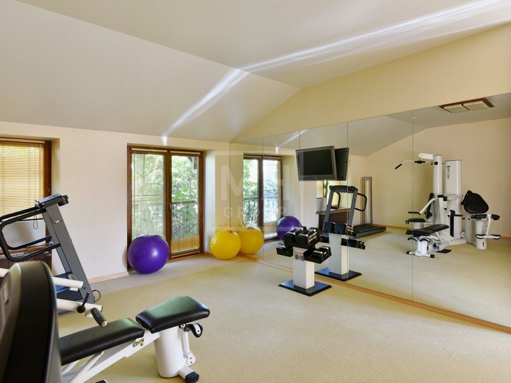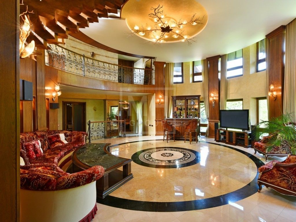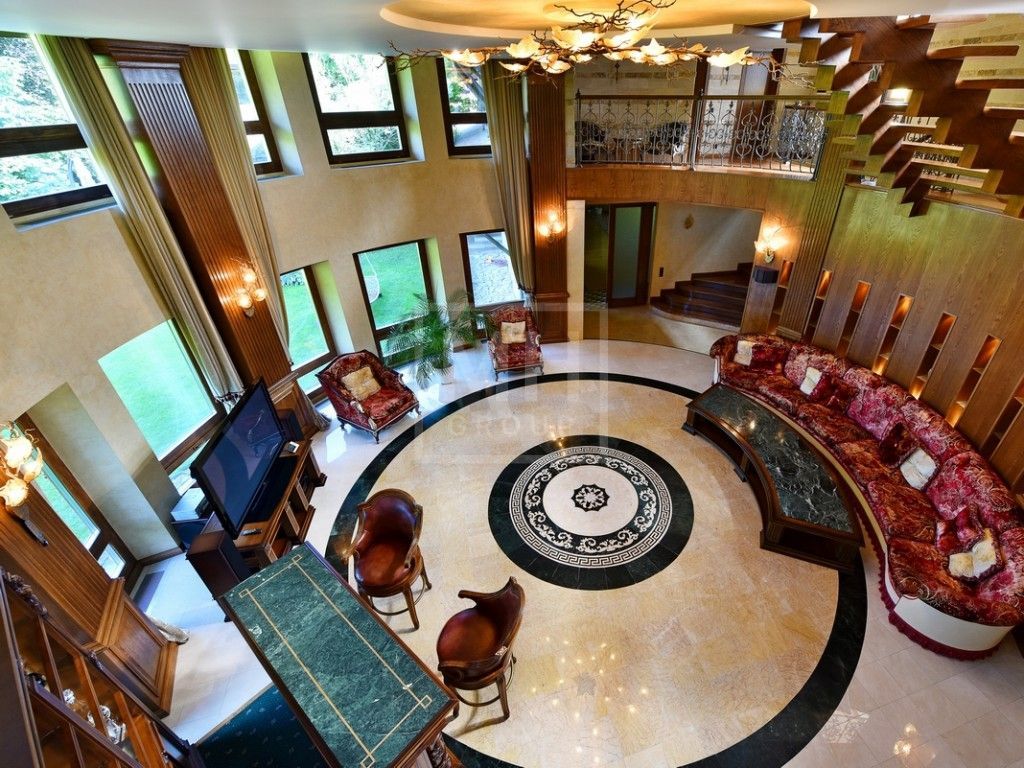 Этаж 1: прихожая, два с/у, холл, столовая, кухня, гостиная со вторым светом и выходом на участок, парадная столовая с камином, зимний сад с выходом в галерею, домашний кинотеатр, СПА-зона ( хаммам, сауна, 2 душа, с/у; тренажерный зал, комната отдыха с массажным столом и солярием, с/у); блок для персонала (кухня, 3 спальни, комната для охраны, с/у, постирочная, котельная), гараж на 3 машины.