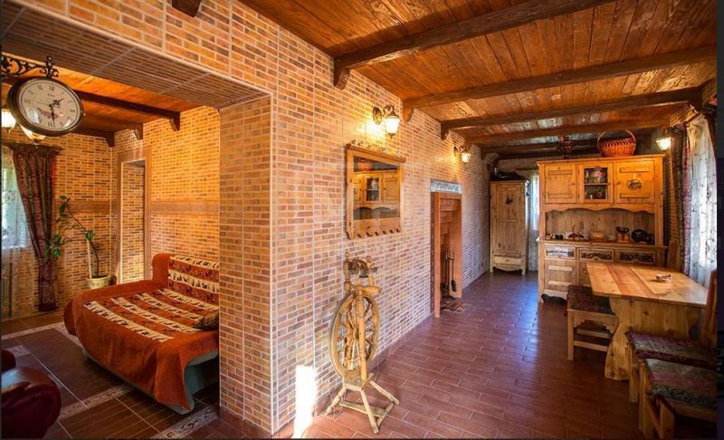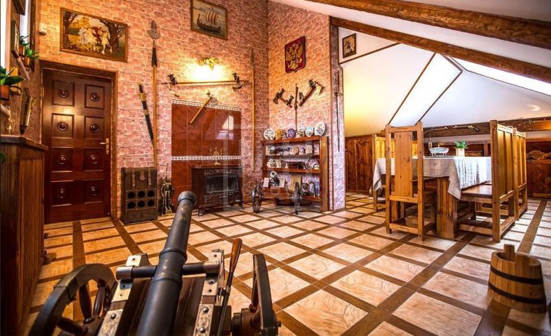 Этаж 2: два кабинета и большая спальня, гардеробная, санузел с паровой баней и большой круглой джакузи; - межэтажная комната (столовая – оружейная, с пушками, репликами старинного оружия и мебелью стилизованной под средневековье, с камином;
