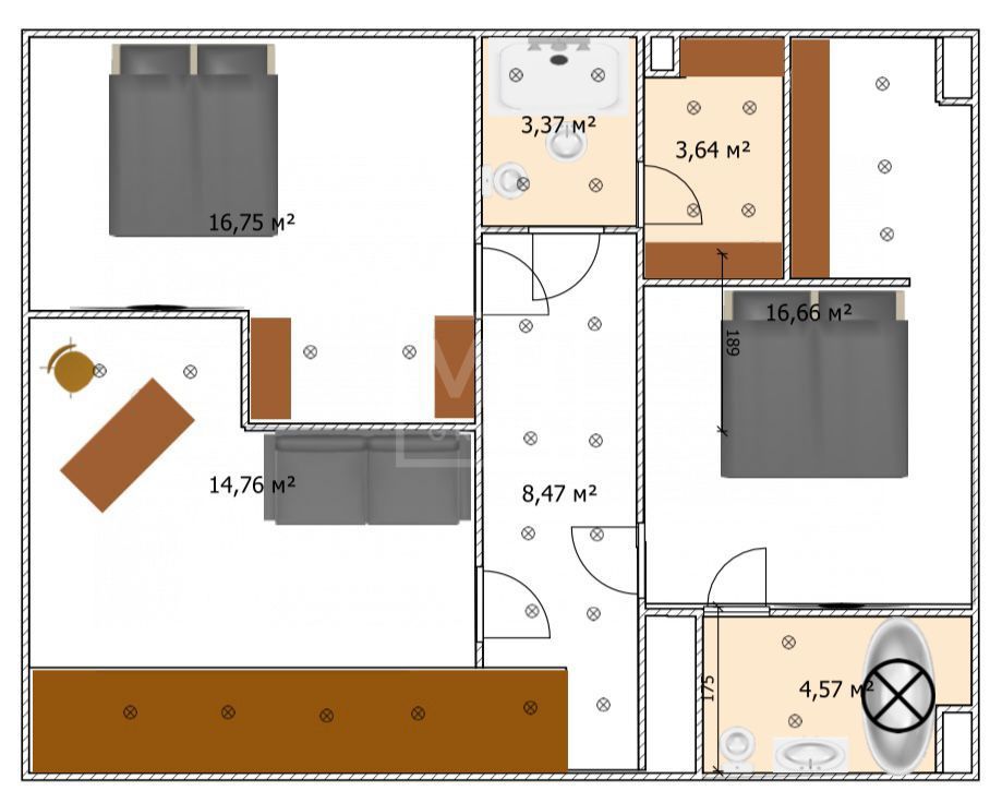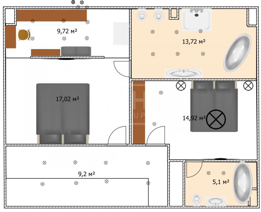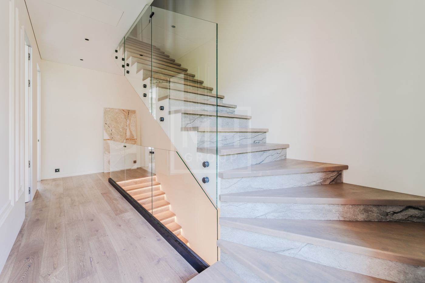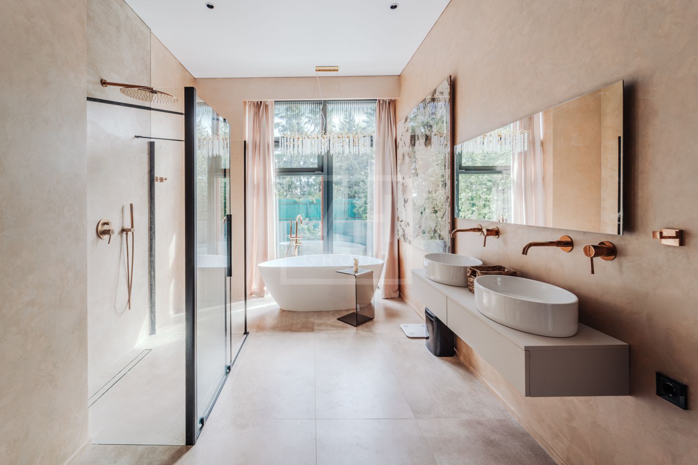 Этаж 2: 2 комнаты, 2 спальни с с/у, гардеробными, кабинет, постирочная.