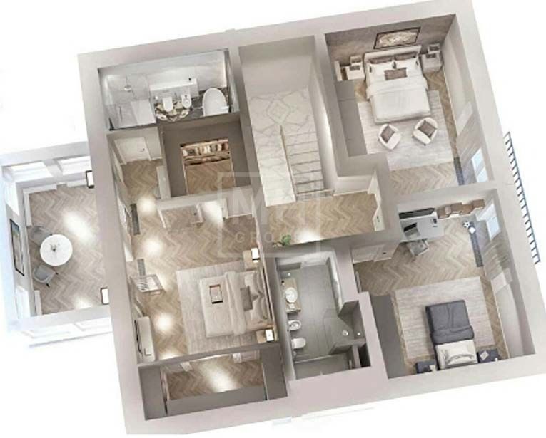 Этаж 2: Две детские с одним общим с.у., мастер-блок: с,у, гардеробная, спальня, теплый будуар мансарда: помещение для хранения вещей