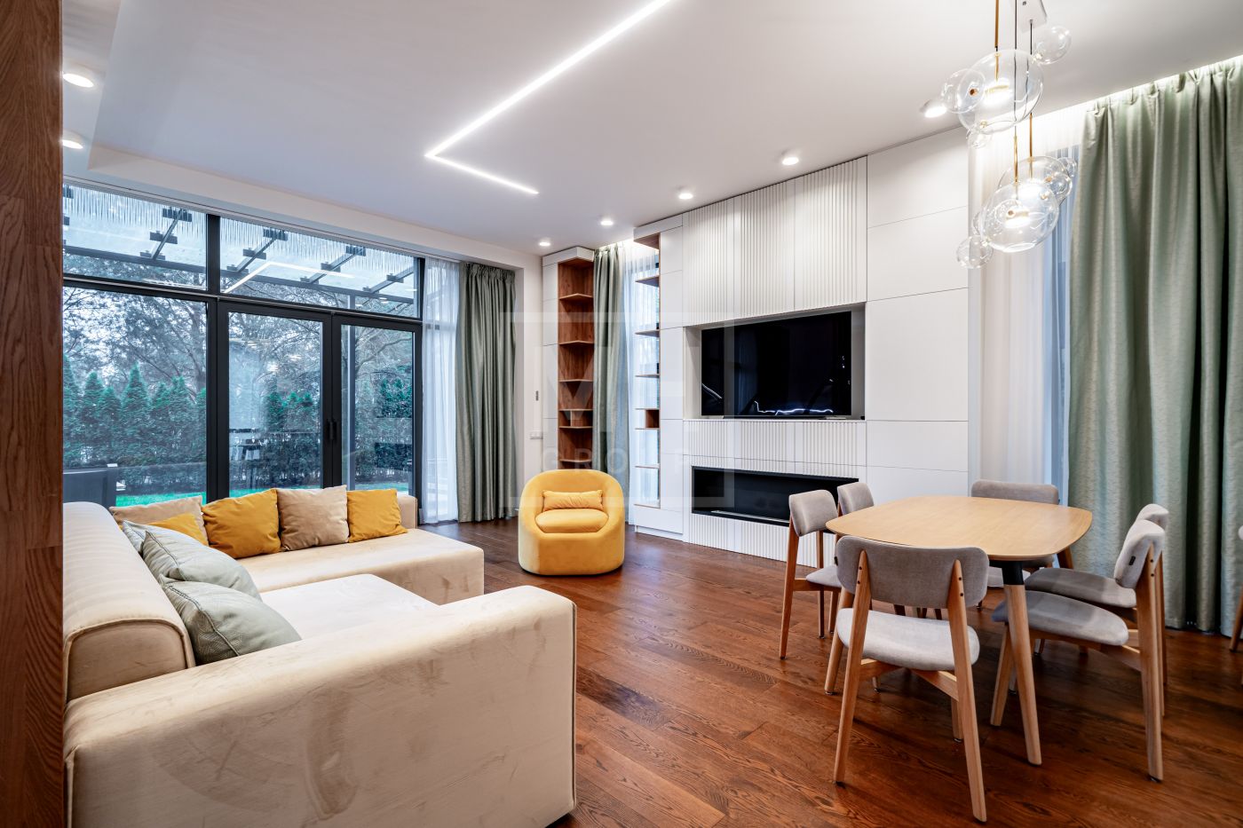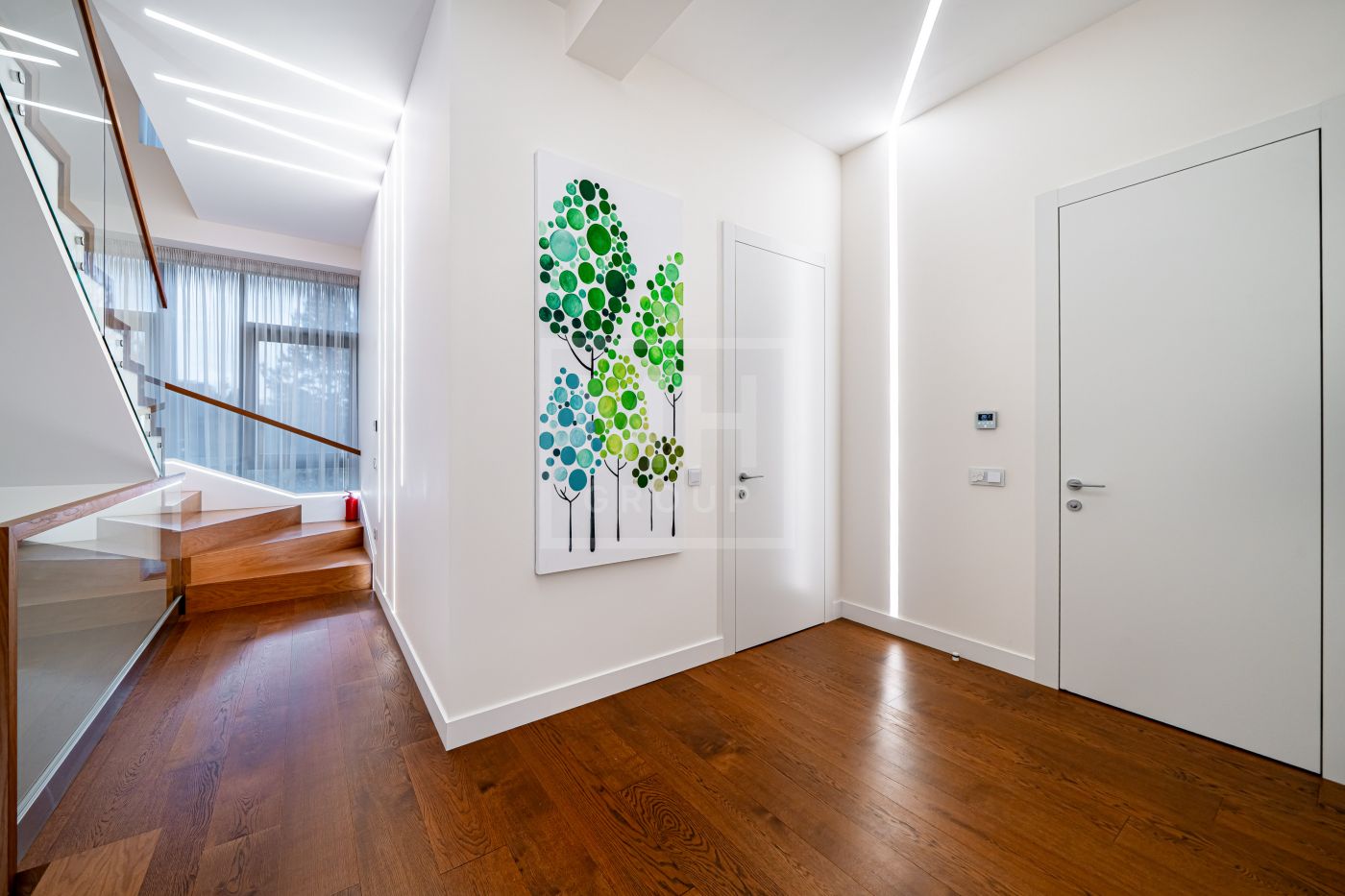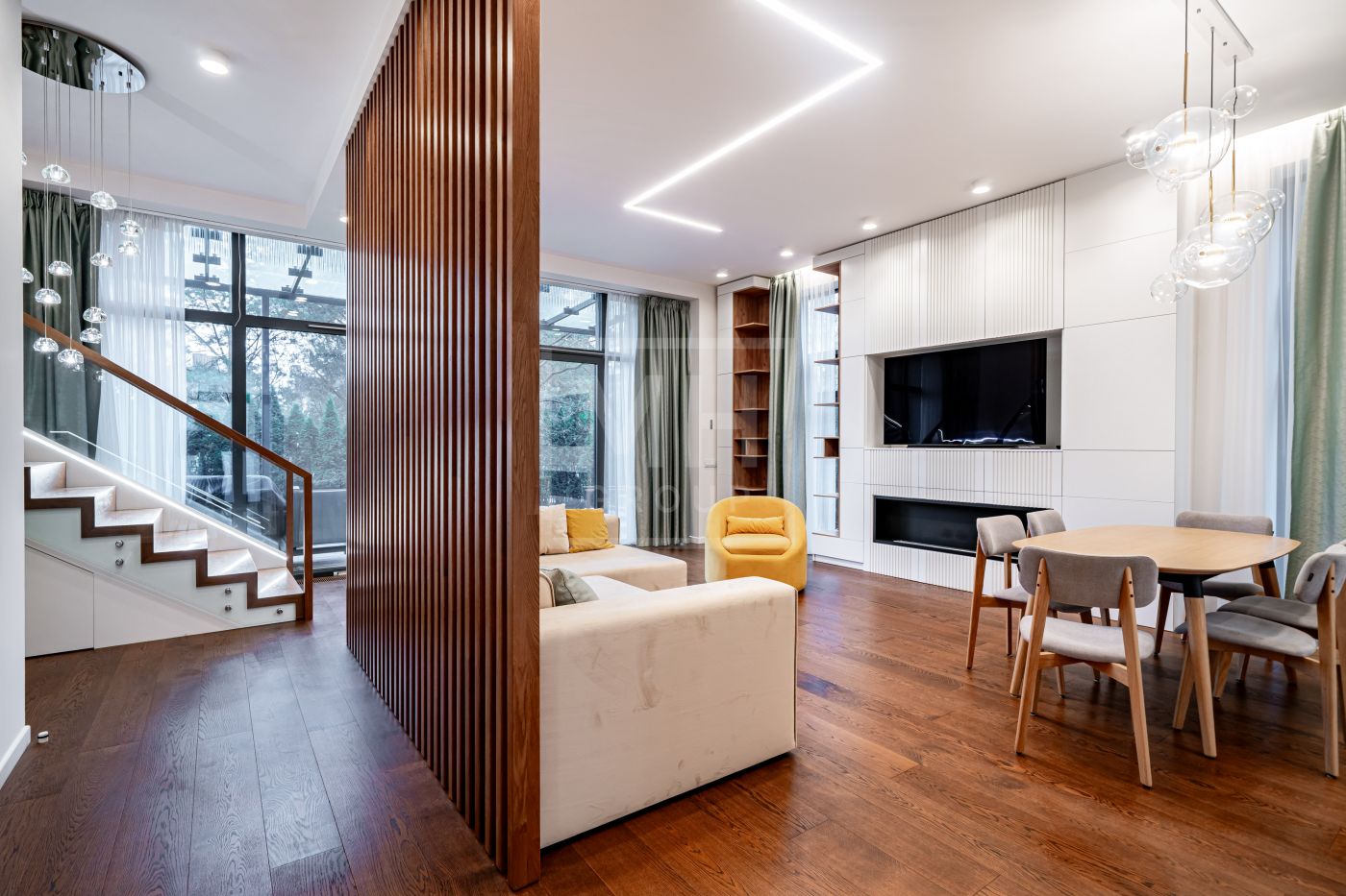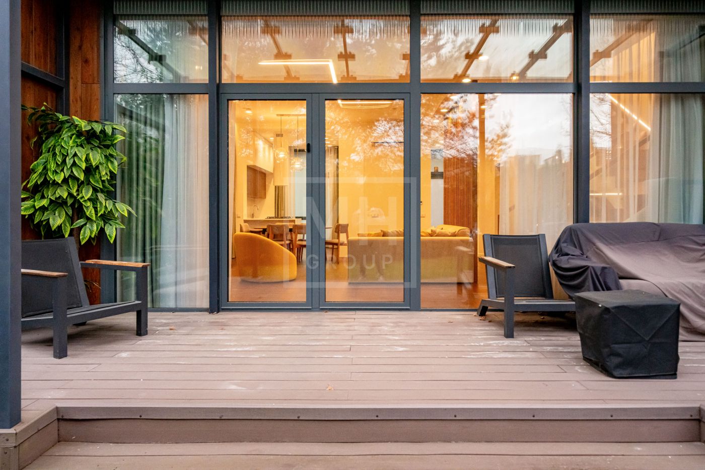 Таунхаус полностью готов к проживанию: выполнен дизайнерский ремонт, применены премиальные материалы и продумано освещение. Панорамное остекление фасадов и высокие потолки наполняют жилые пространства светом и создают ощущение единения с природой.
