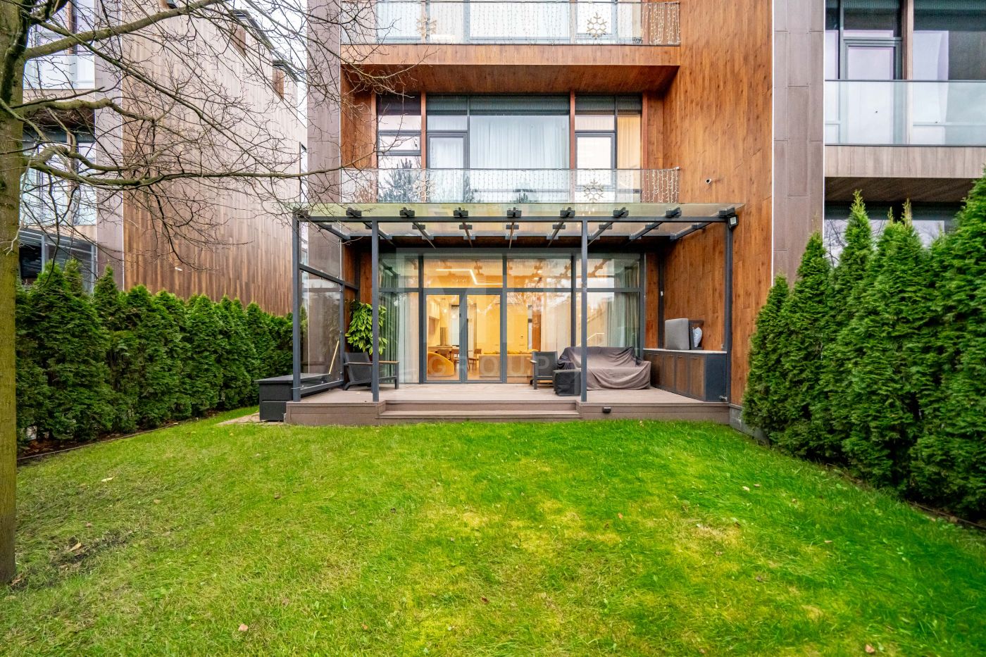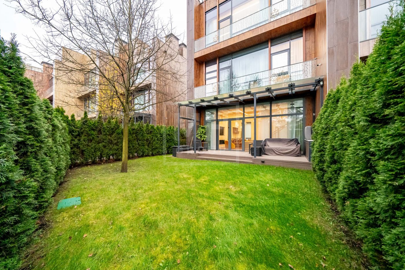 На участке выполнен продуманный ландшафтный дизайн: аккуратно сформированные зелёные зоны, декоративные посадки и приватная терраса создают уютное пространство для отдыха на свежем воздухе.
