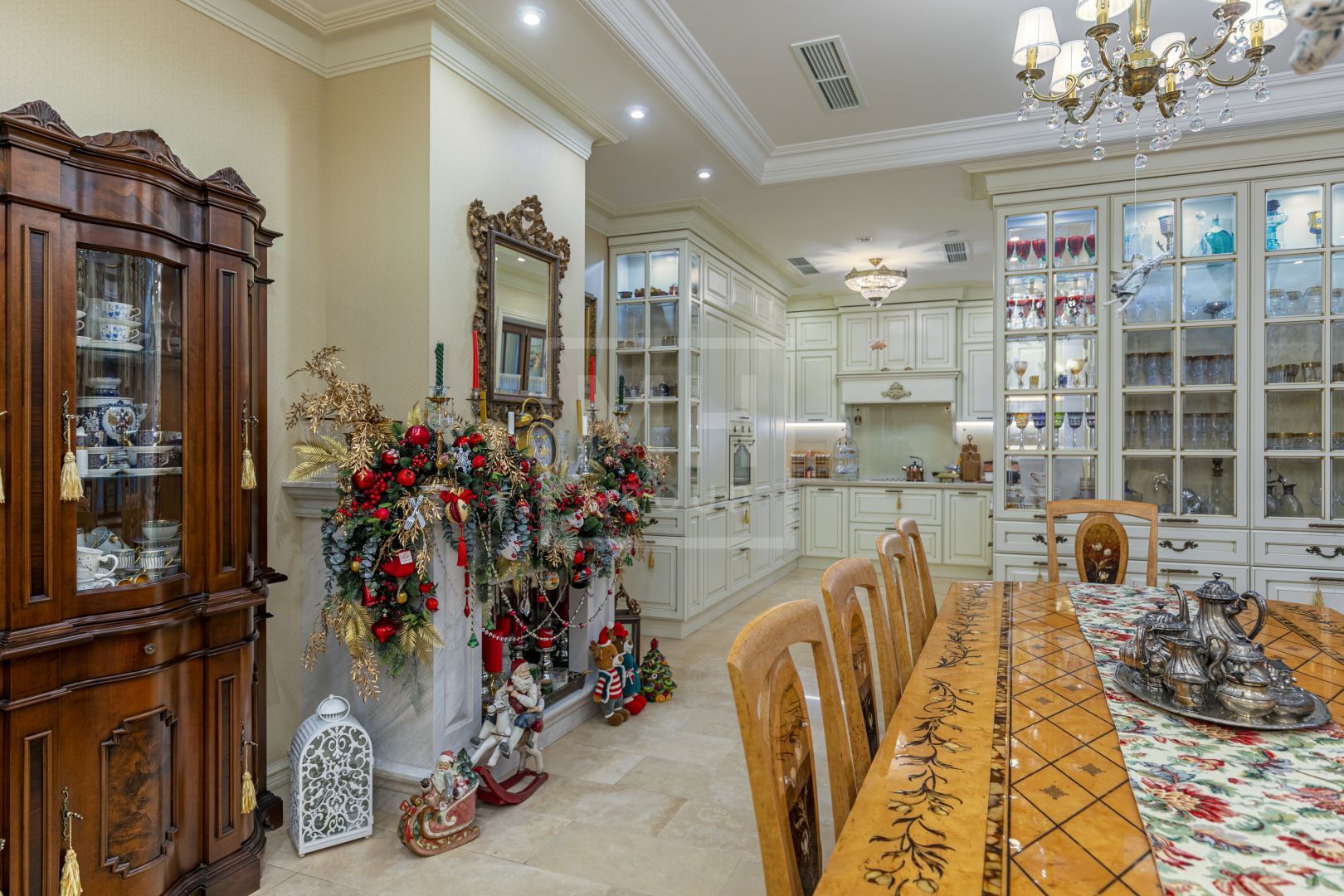 На первом этаже располагаются две уютные гостиные, объединенные общим пространством. Большая кухня-столовая со свечным камином и стеклянными витринами укомплектована техникой Smeg и имеет свой выход на летнюю террасу с зоной готовки.