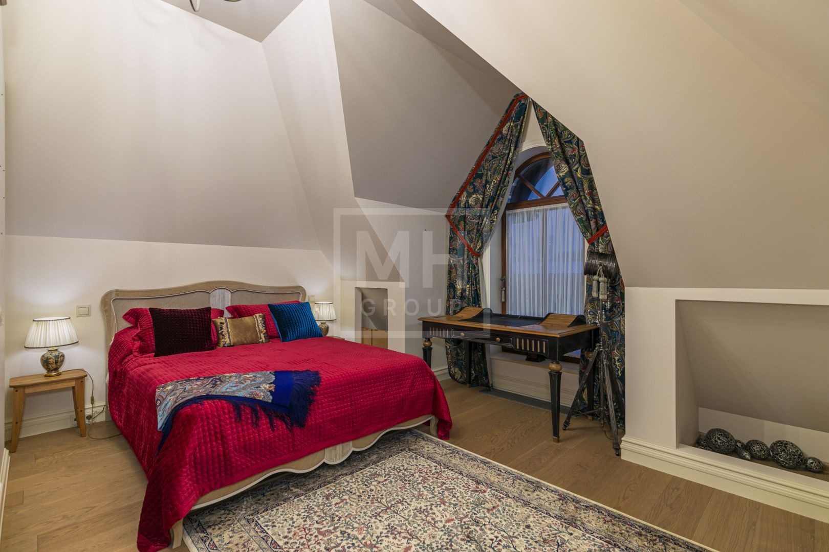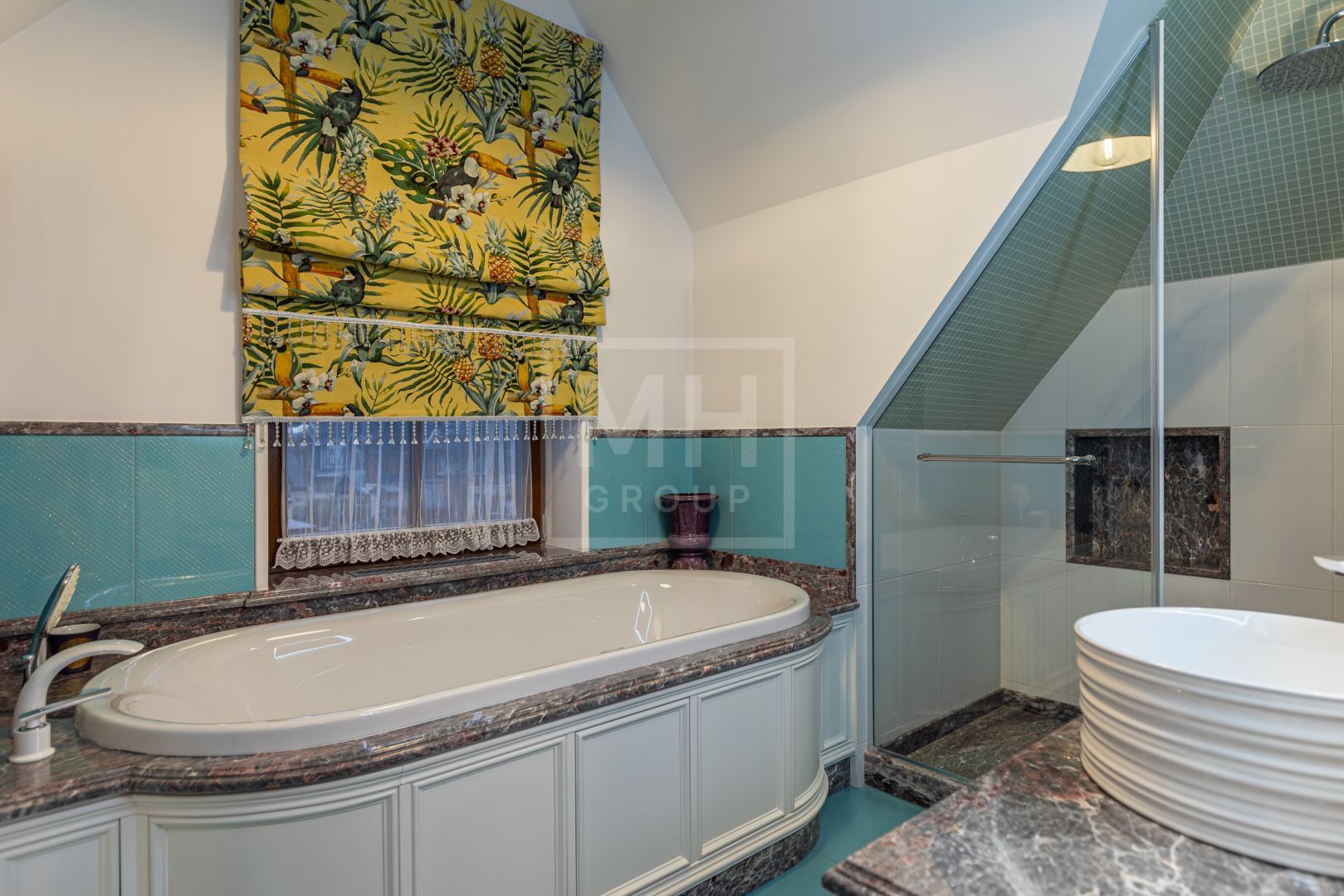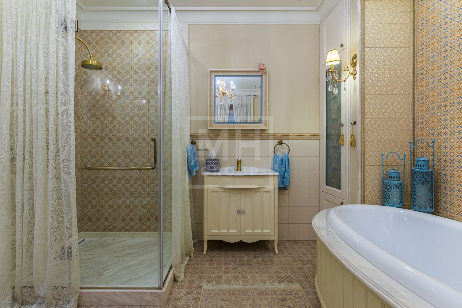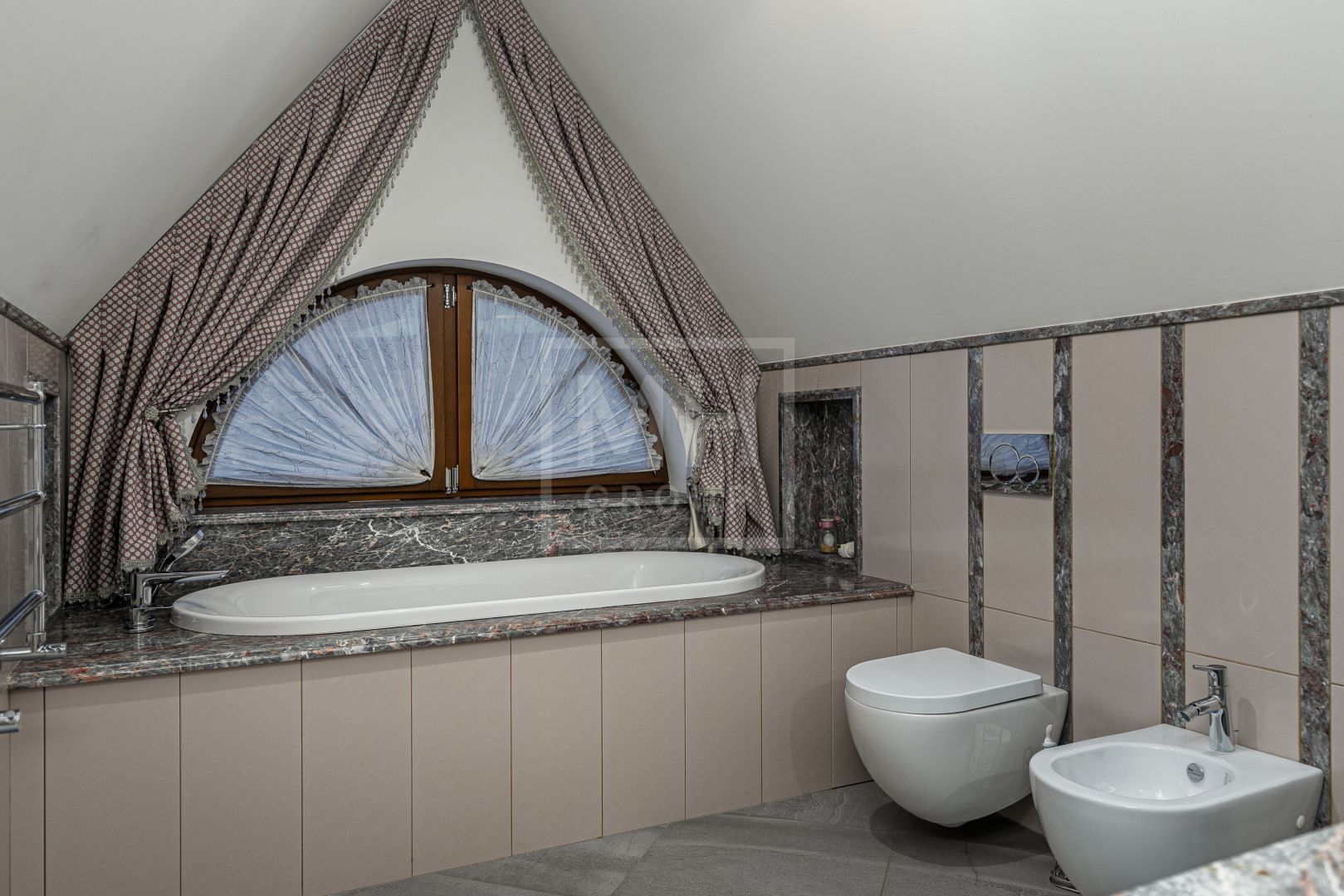 Весь второй этаж занял мастер-блок с большой гардеробной и эффектной ванной комнатой, просторный кабинет и комната с балконом. А на третьем, мансардном этаже, расположились две чудесные спальни со своими санузлами, отделанными разными сортами мрамора и испанской плитки.