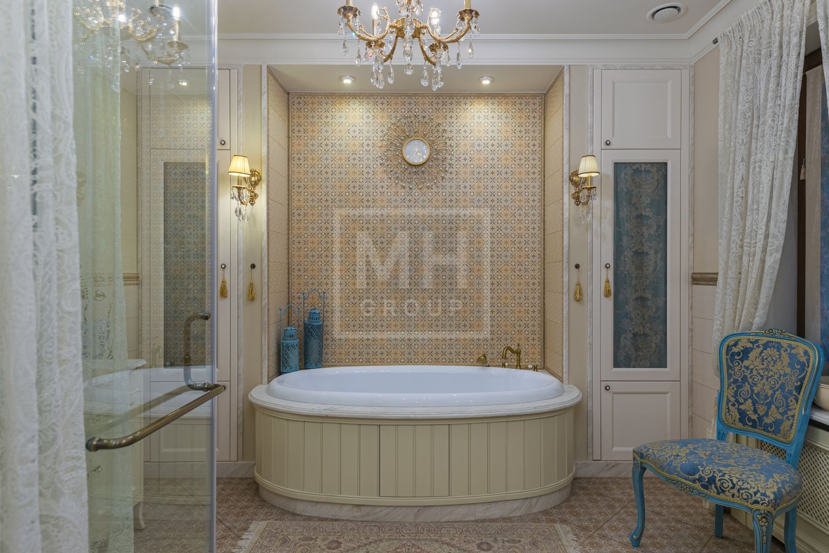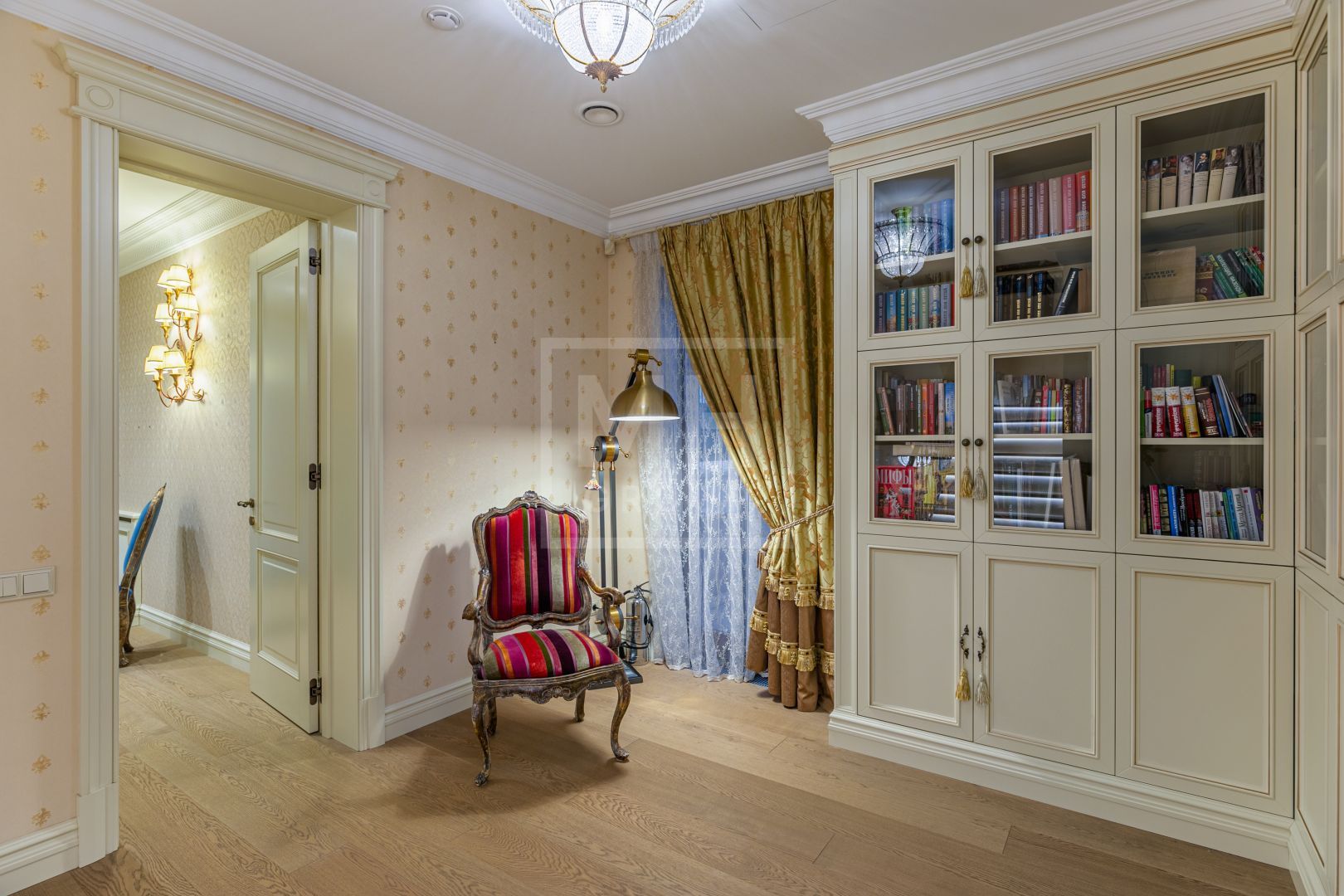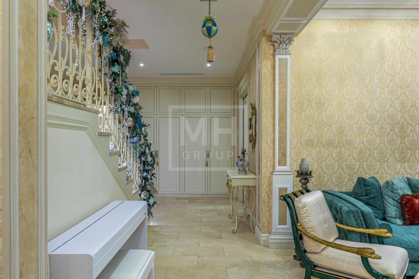 Красивые люстры обрамляют потолок и стены, на полу уложена дубовая доска. Элегантная лестница из мрамора и травертина, с теплой подсветкой, завершает целостность этого уютного пространства.
