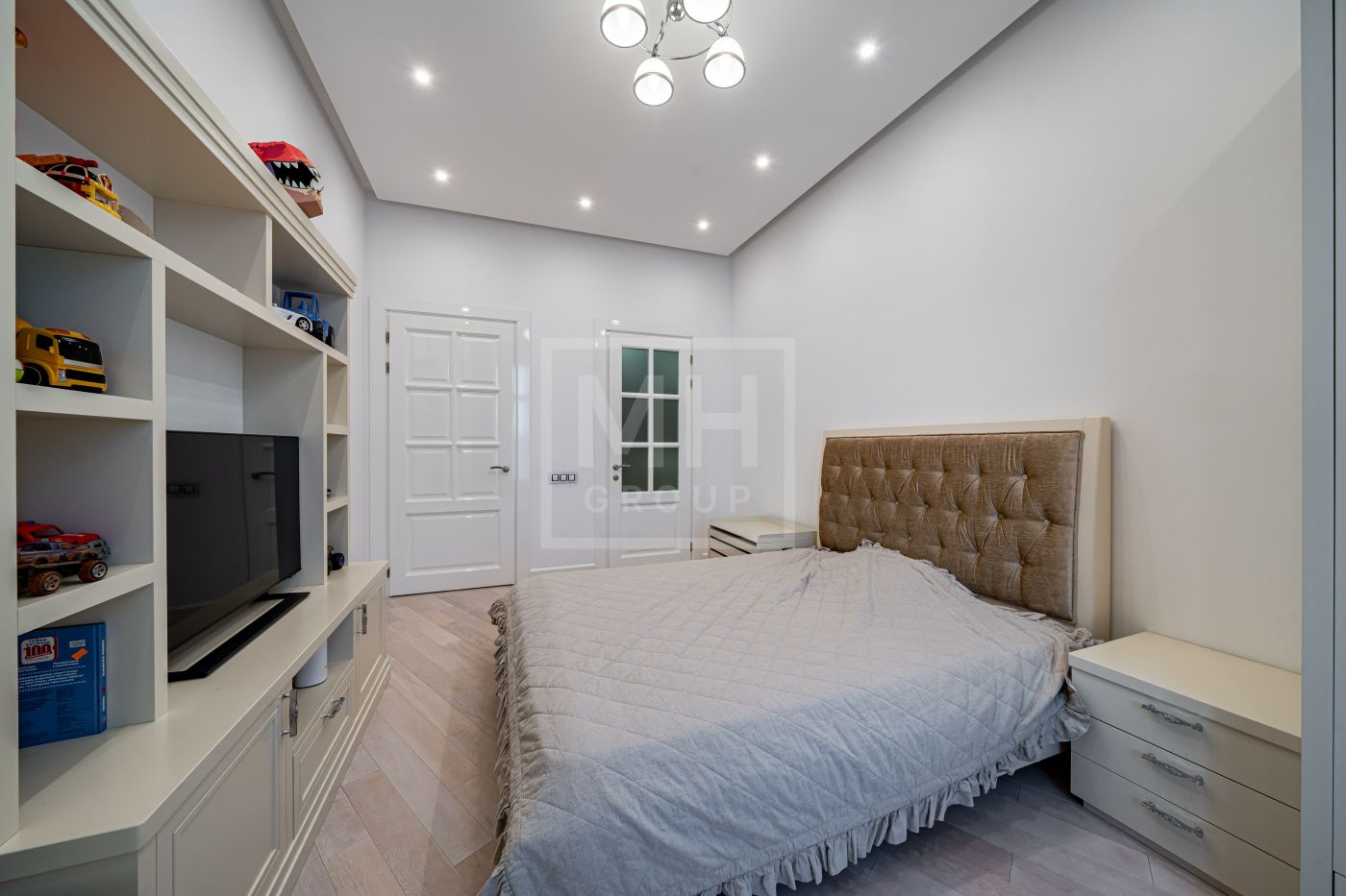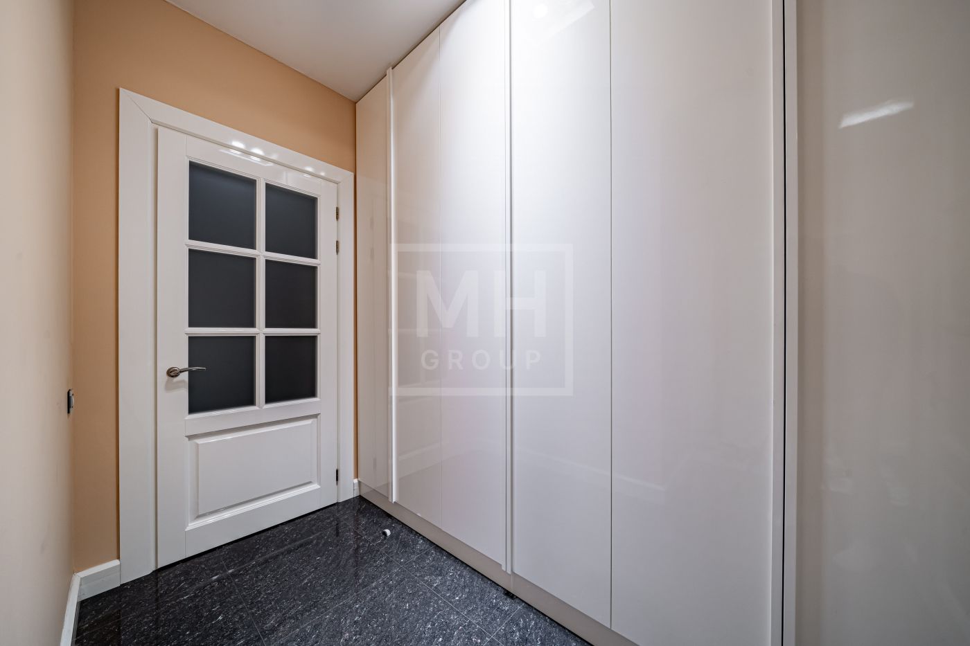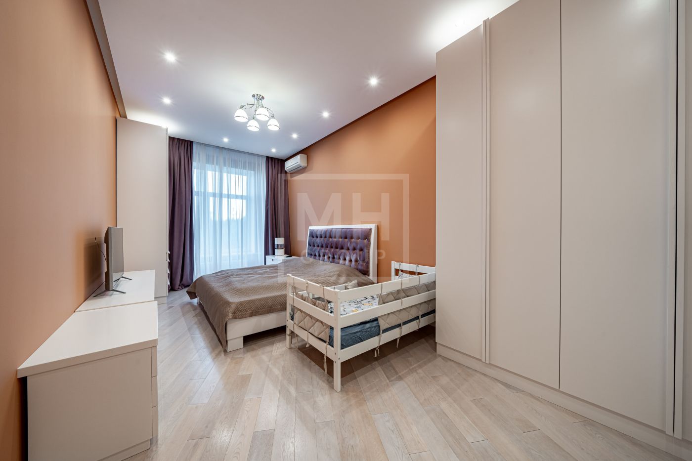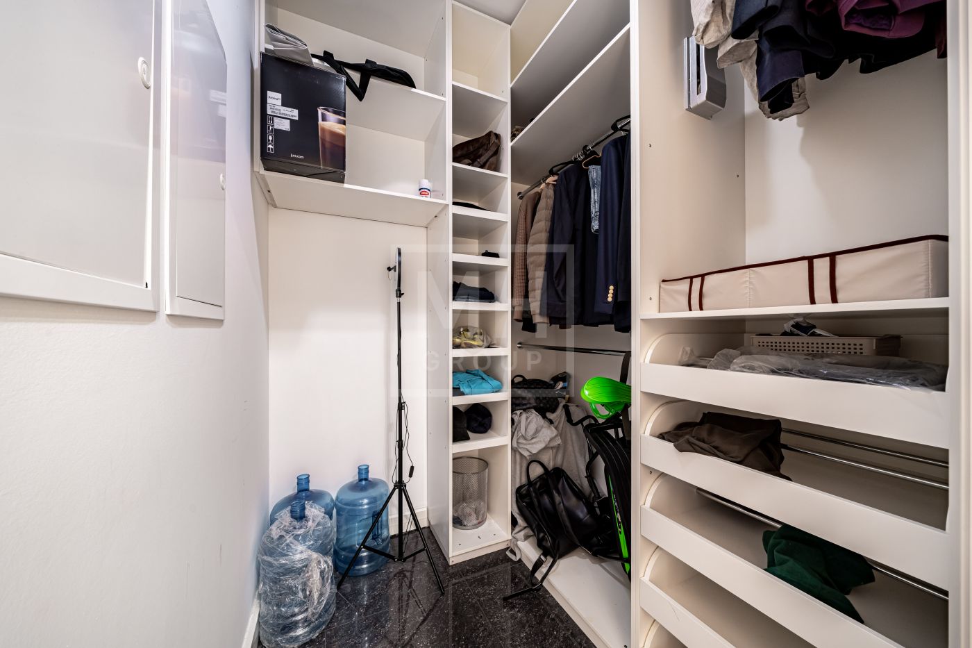 Площадь квартиры составляет 143 кв.м.Состав помещений: Холл, кладовая, с/у с душем, гардеробная, отдельная комната прачечная, детская комната со своей гардеробной, с/у и ванной, мастер спальня со своим с/у гардеробной и душем. Большая кухня-гостиная (около 45 кв.м).