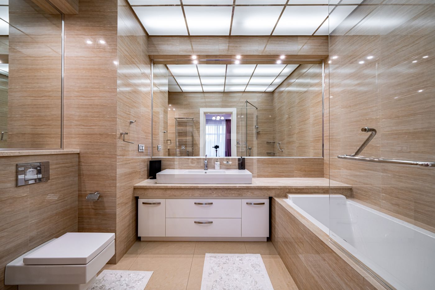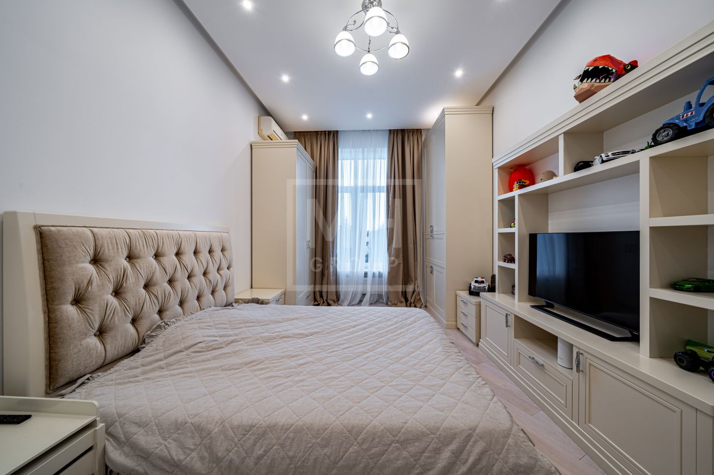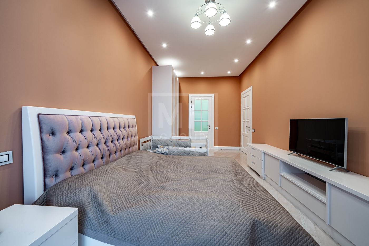 Площадь квартиры составляет 143 кв.м.Состав помещений: Холл, кладовая, с/у с душем, гардеробная, отдельная комната прачечная, детская комната со своей гардеробной, с/у и ванной, мастер спальня со своим с/у гардеробной и душем. Большая кухня-гостиная (около 45 кв.м).