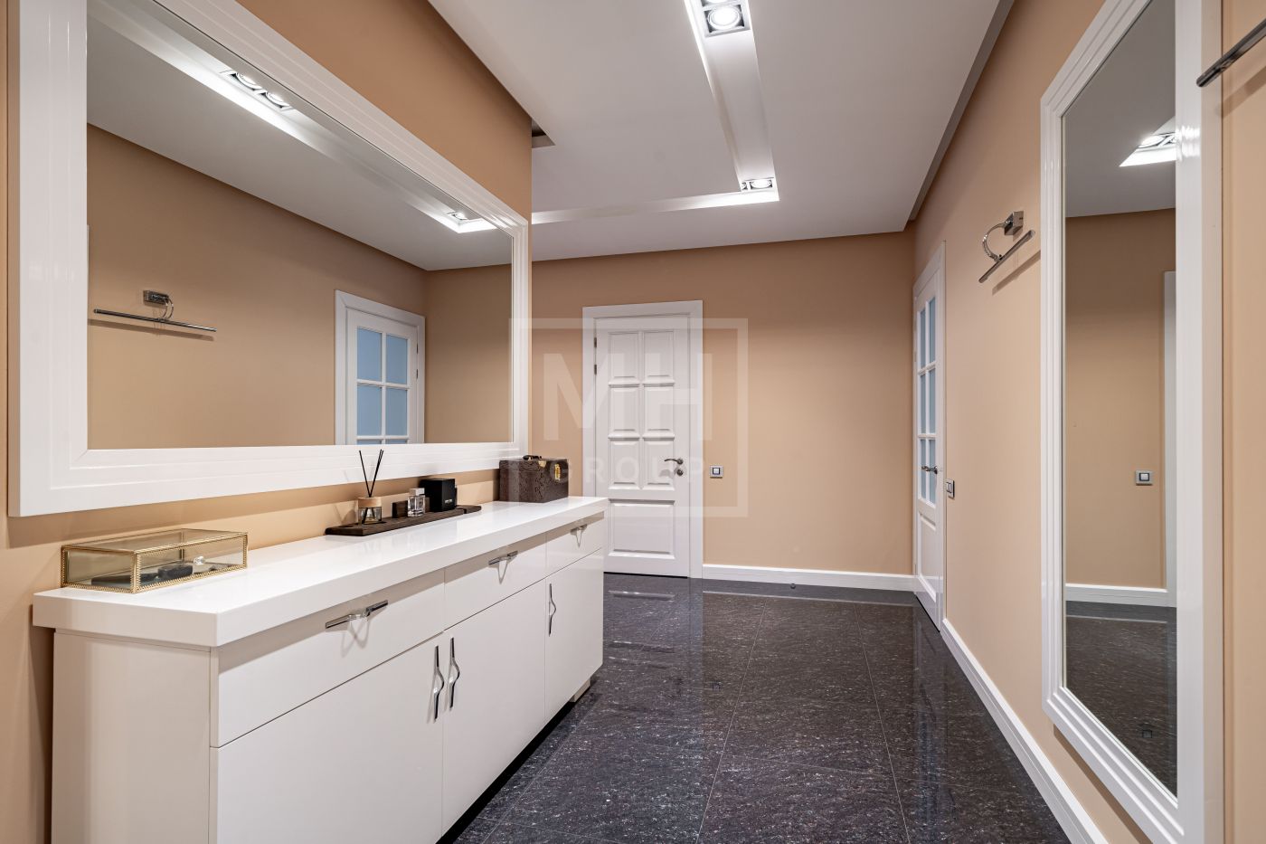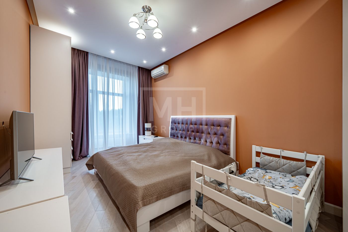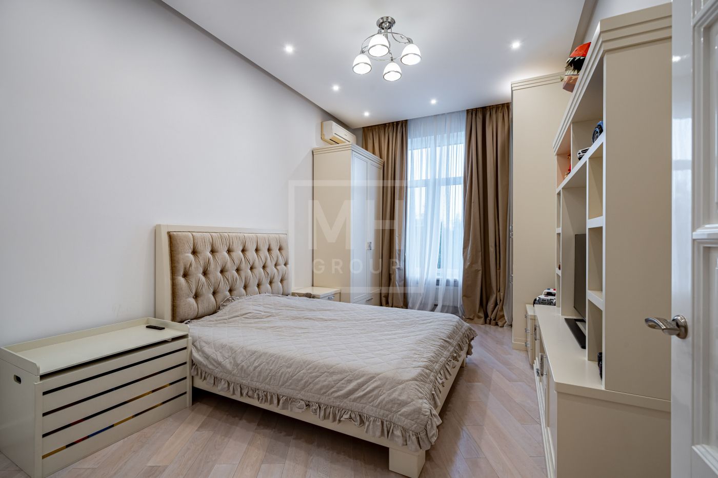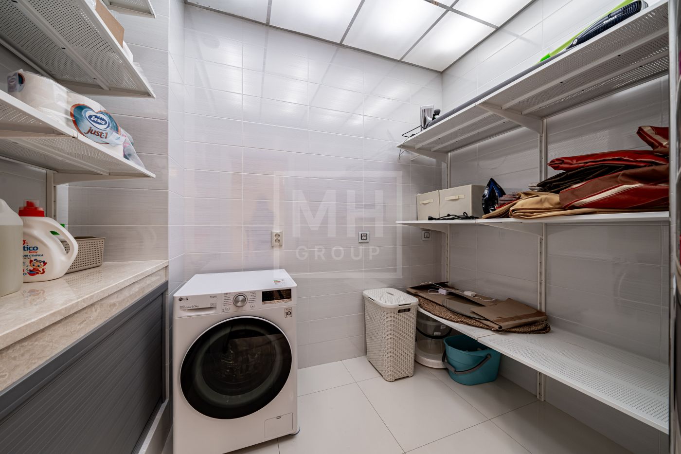 Площадь квартиры составляет 143 кв.м.Состав помещений: Холл, кладовая, с/у с душем, гардеробная, отдельная комната прачечная, детская комната со своей гардеробной, с/у и ванной, мастер спальня со своим с/у гардеробной и душем. Большая кухня-гостиная (около 45 кв.м).