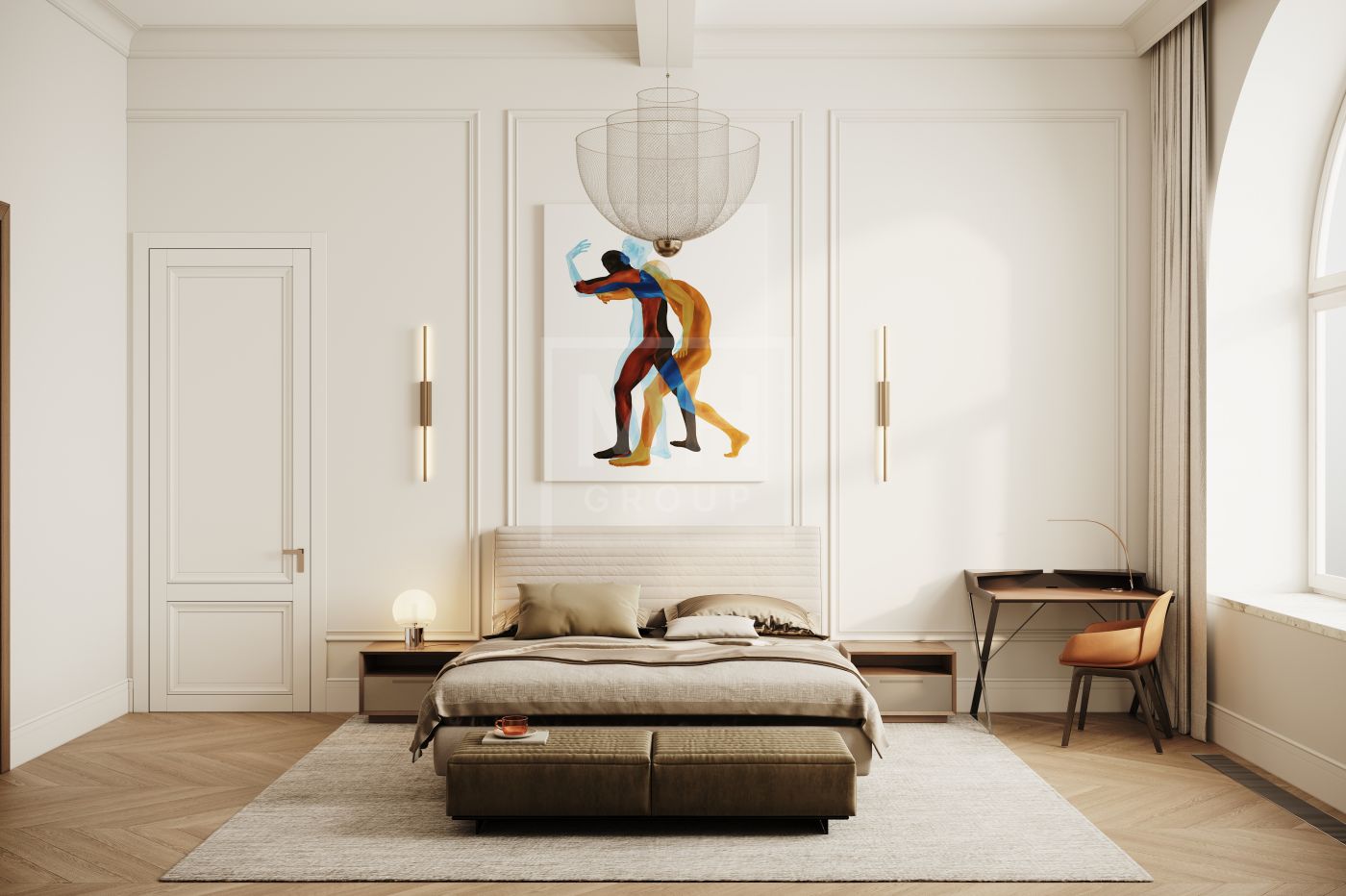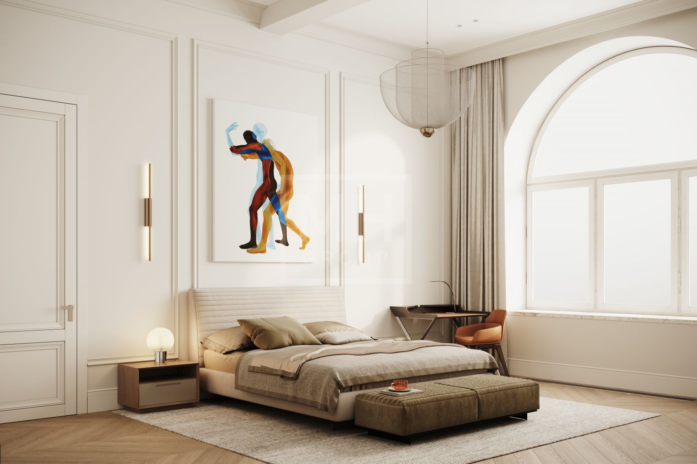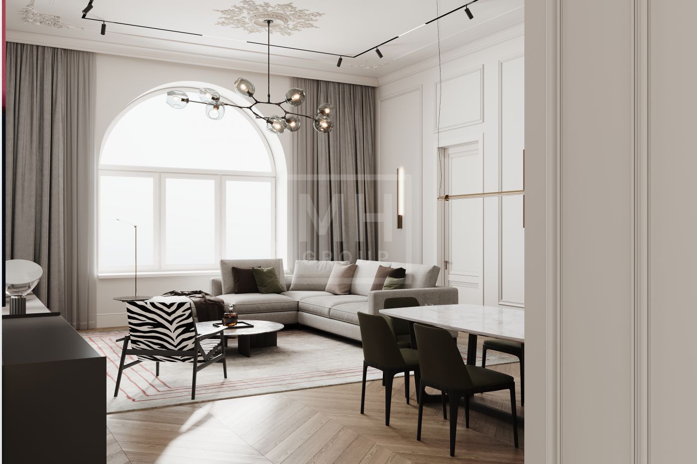 На продажу предлагается квартира на 6 этаже, площадью 106 кв.м.— с одной спальней и двумя санузлами.Высота потолков — 4,10 м, за счёт чего пространство ощущается очень объёмным и светлым.