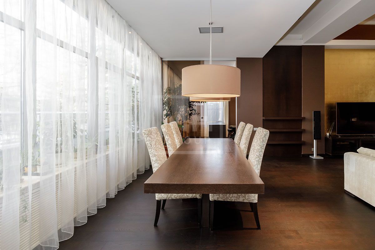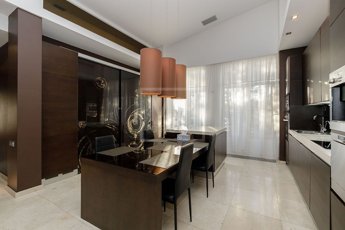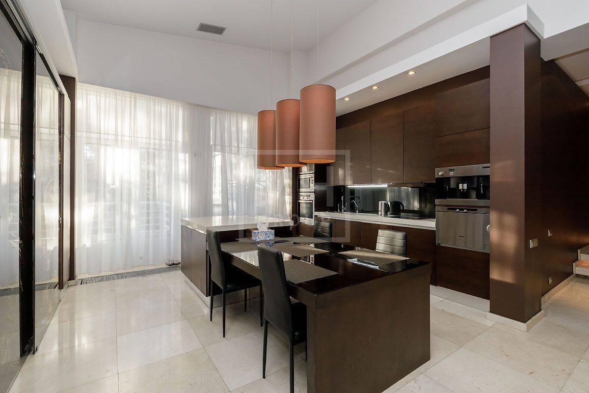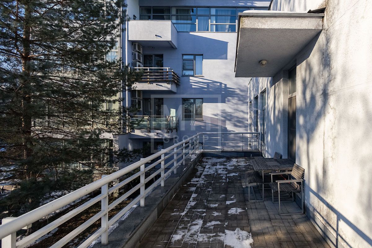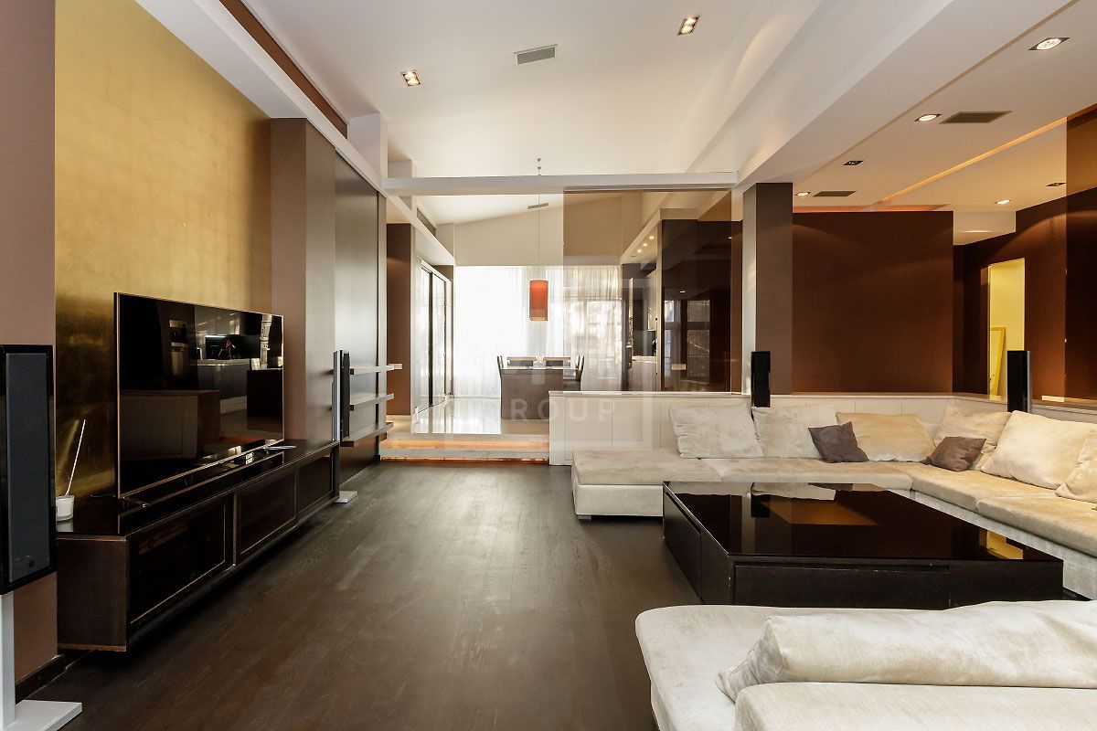 Прекрасная квартира с отдельным входом, большой верандой и своей лужайкой для барбекю.Удобная планировка, включающая кухню, гостиную, столовую, 5 спален с ванными комнатами и гардеробными, кабинет, комнату отдыха, постирочную, 2 террасы (100 и 20 метров), с одной из которых есть отдельный выход во двор и на парковку, а также на зеленую лужайку с газоном.