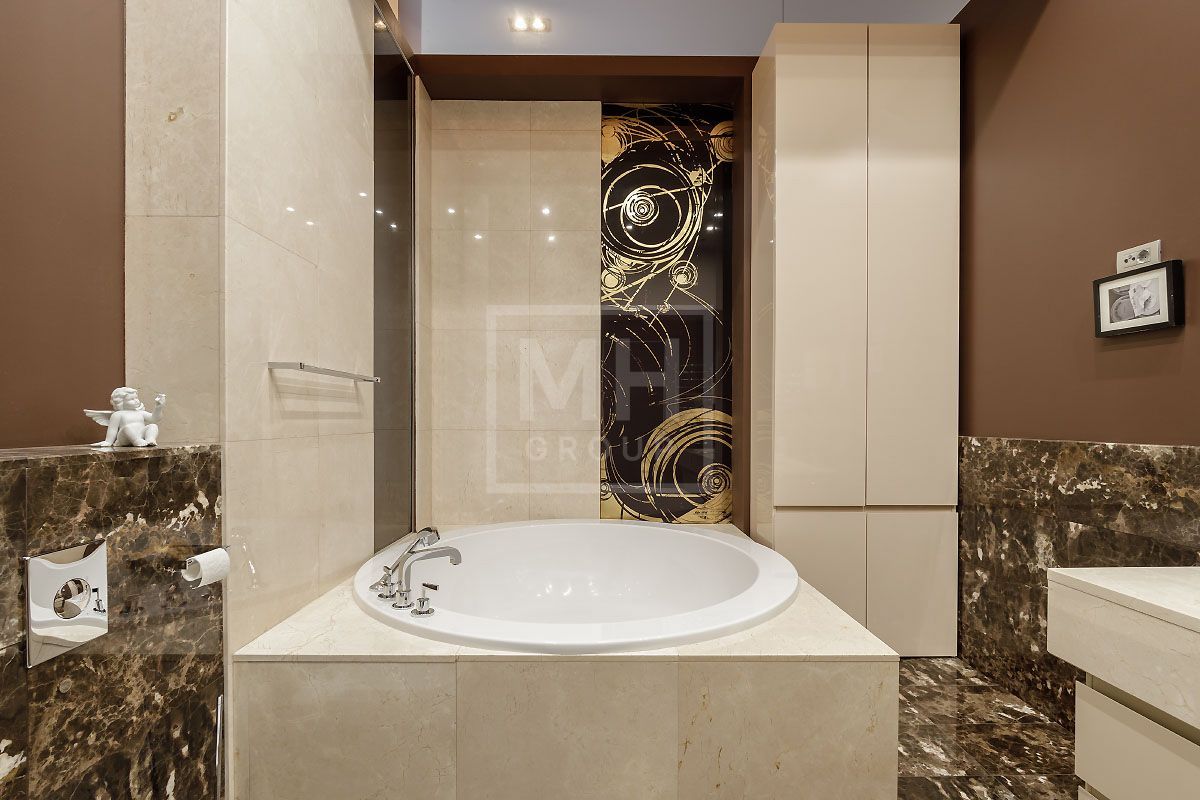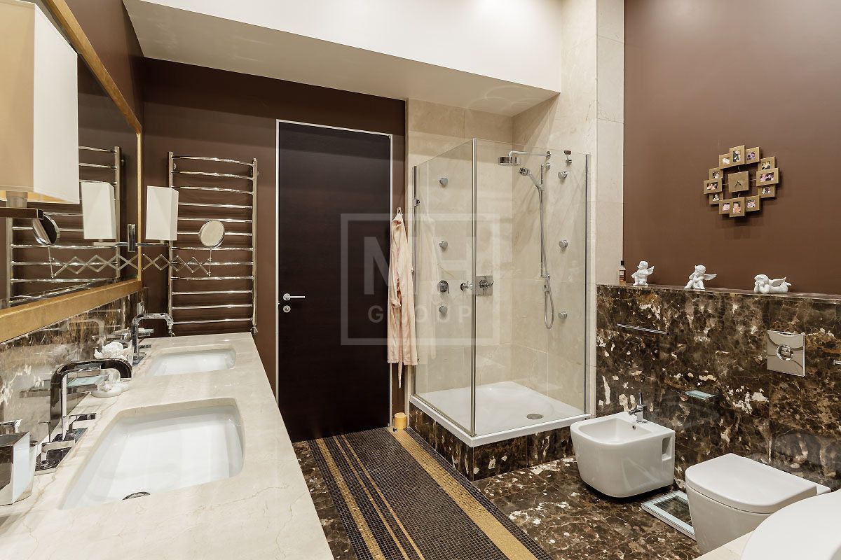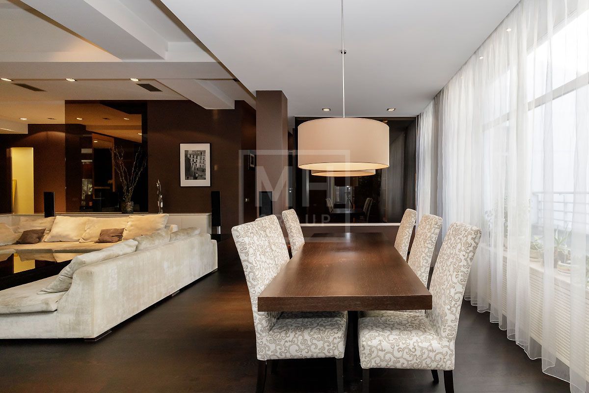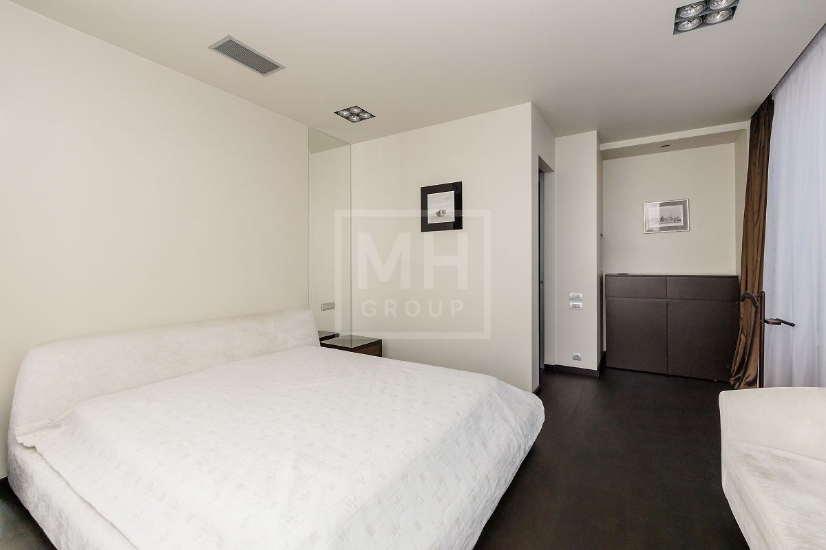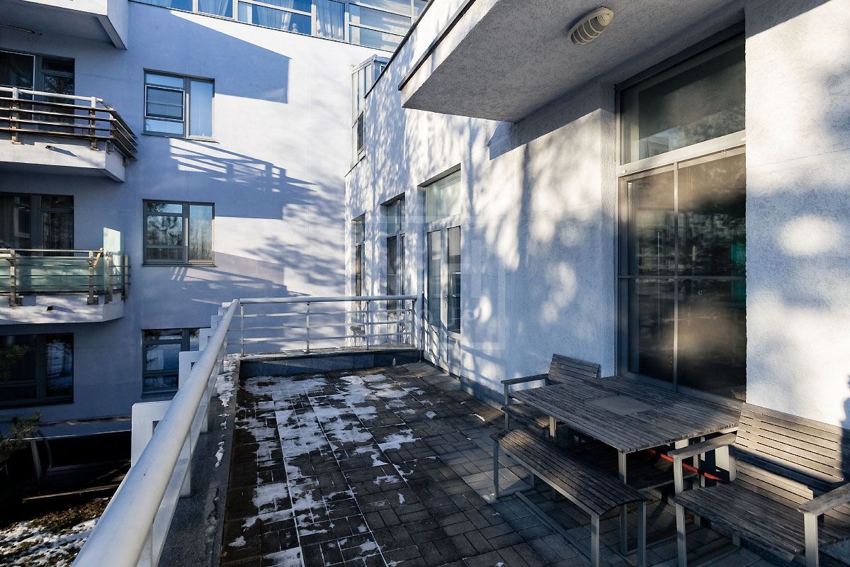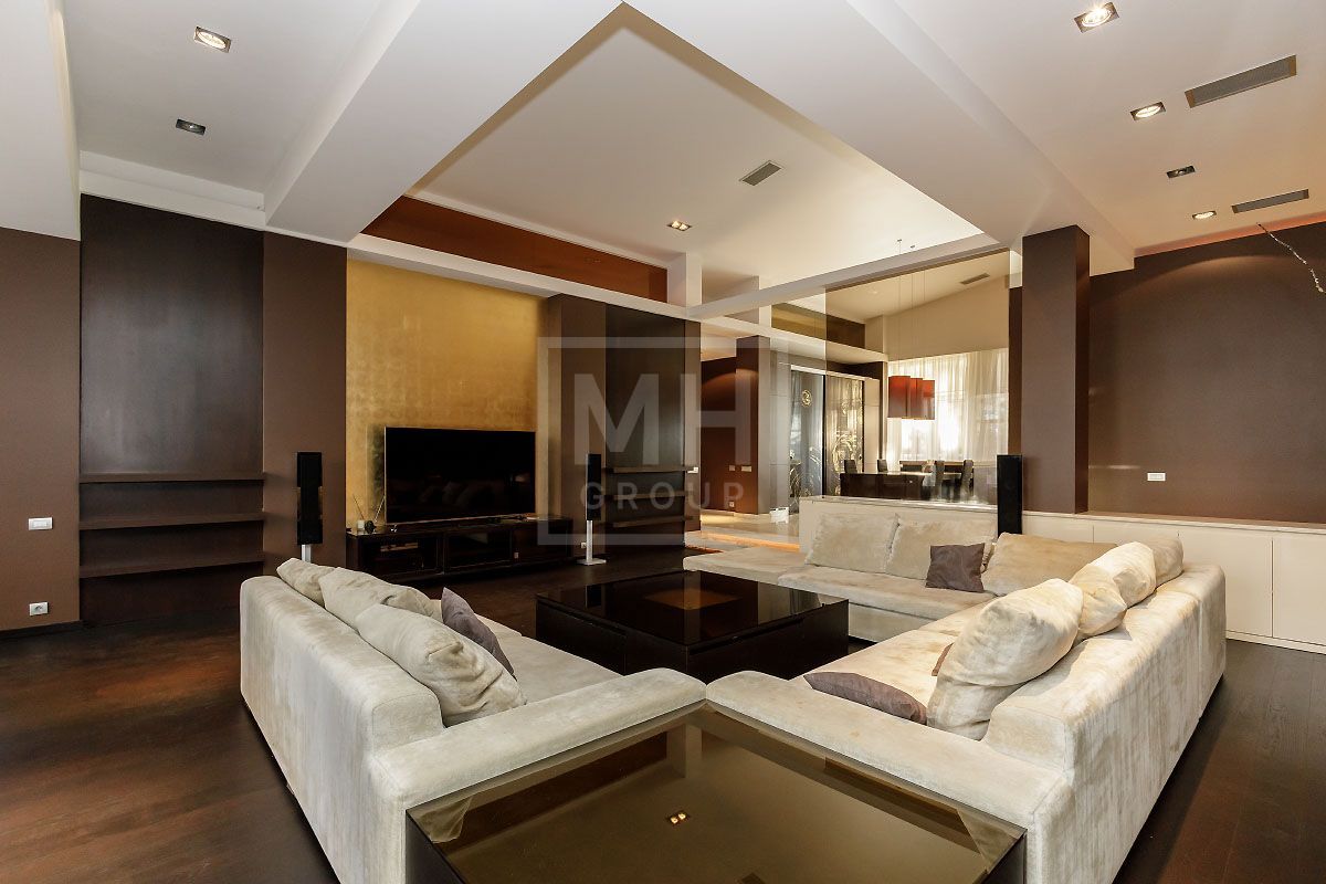 Прекрасная квартира с отдельным входом, большой верандой и своей лужайкой для барбекю.Удобная планировка, включающая кухню, гостиную, столовую, 5 спален с ванными комнатами и гардеробными, кабинет, комнату отдыха, постирочную, 2 террасы (100 и 20 метров), с одной из которых есть отдельный выход во двор и на парковку, а также на зеленую лужайку с газоном.