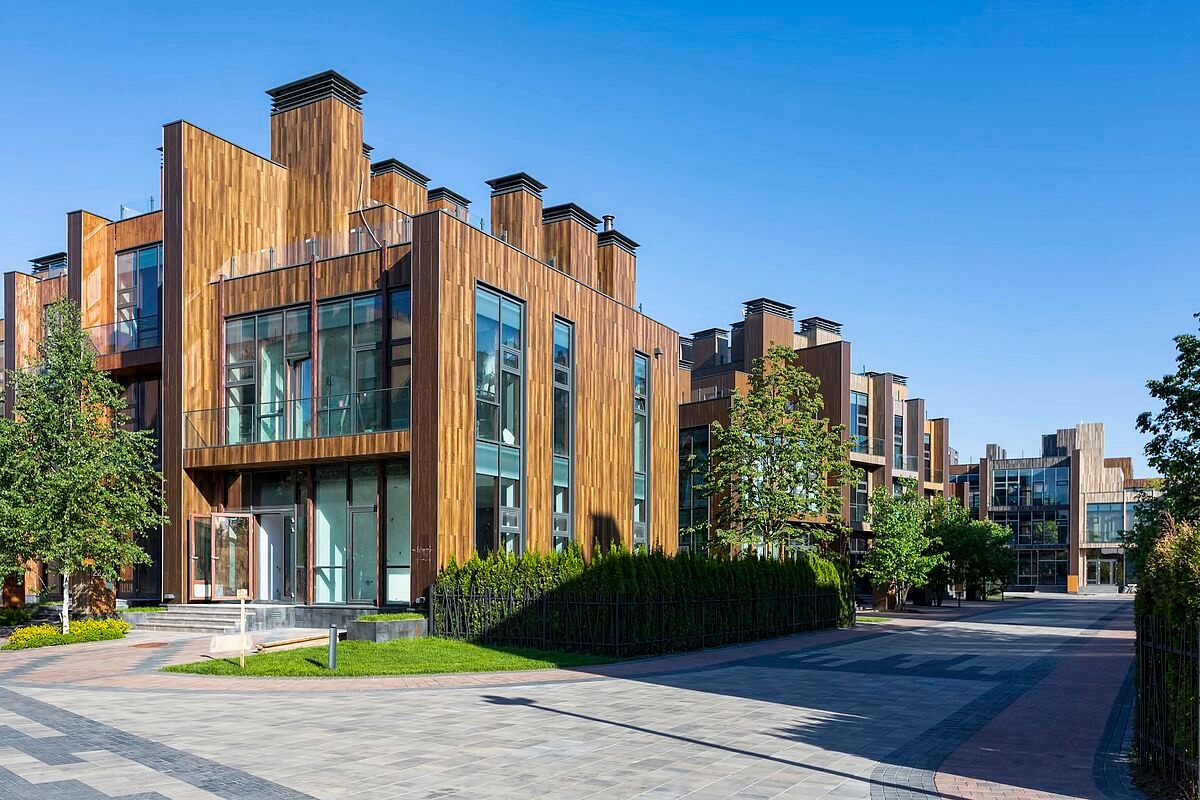 Футуристичный дизайн и интересный конструктив зданий с фантастическим панорамным остеклением, делает этот жилой комплекс ярким и впечатляющим! Все таунхаусы наполнены светом и имеют два либо три уровня и площадь - 168 или 238 кв.м., а придомовые участки достигают 3,4 соток. Задний двор каждого домовладения озеленен и украшен живой изгородью и крупномерами, а у входной группы оборудована парковка для двух автомобилей.